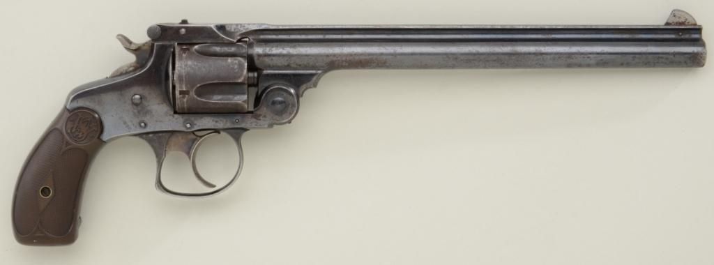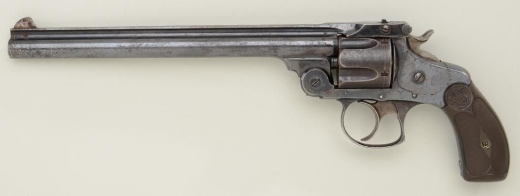 Smith & Wesson top break DA revolver, .38 cal., special order 8” barrel, blue finish, checkered black hard rubber grips, #180215 (all matching visible numbers including an extra “10” on the barrel assembly); bottom of grips period inscribed “H.W. Chead Co.”. This gun is in overall very good condition showing approx. 30% original finish with scattered spots of erosion and pin prick pitting, primarily on the front left portionof the barrel and front sight, good bore, action needs adjustment and is sluggish from long storage, grips are good; inscription should be further researched and gun should be factory lettered. From the Dr. John HallCollection. Est.: $400-$600.