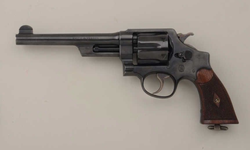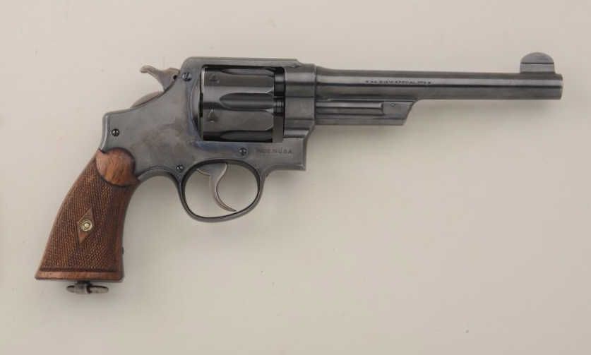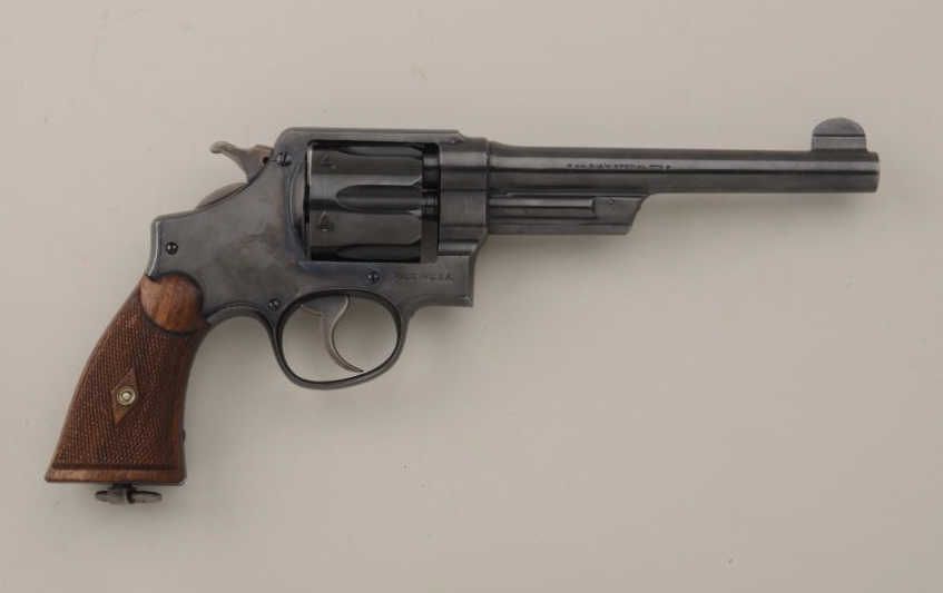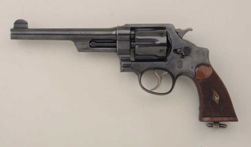 Smith & Wesson "New Century",.44 Special cal., double action revolver,  6-1/2" barrel, blued finish, checkered wood  grips, lanyard in butt, serial #29397.  The  revolver remains in fine to excellentoriginal condition with 96-99% original blue,  some slight losses at the edges and muzzle  with a slight index line on the cylinder.   The hammer and trigger show 90-95% colorful  case hardening, the grips are fine to nearexcellent with crisp checkering.  The action  is tight, the bore is excellent, the revolver  shows only slight use and has been well  cared for.  A fast rising early collectors  quality Smith & Wesson.  Est.:  $1,000-$2,000