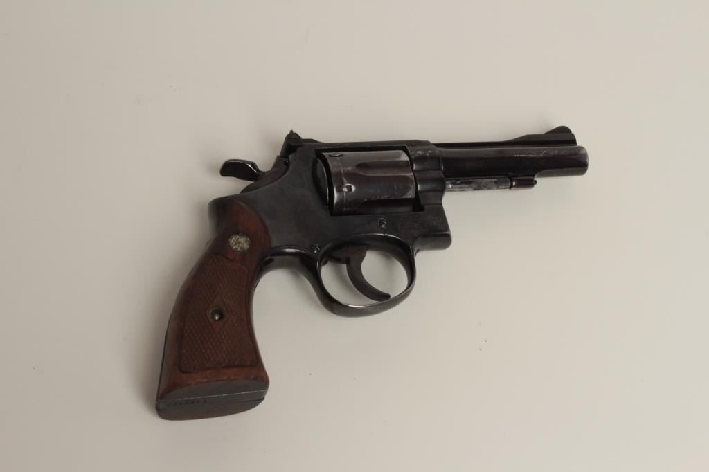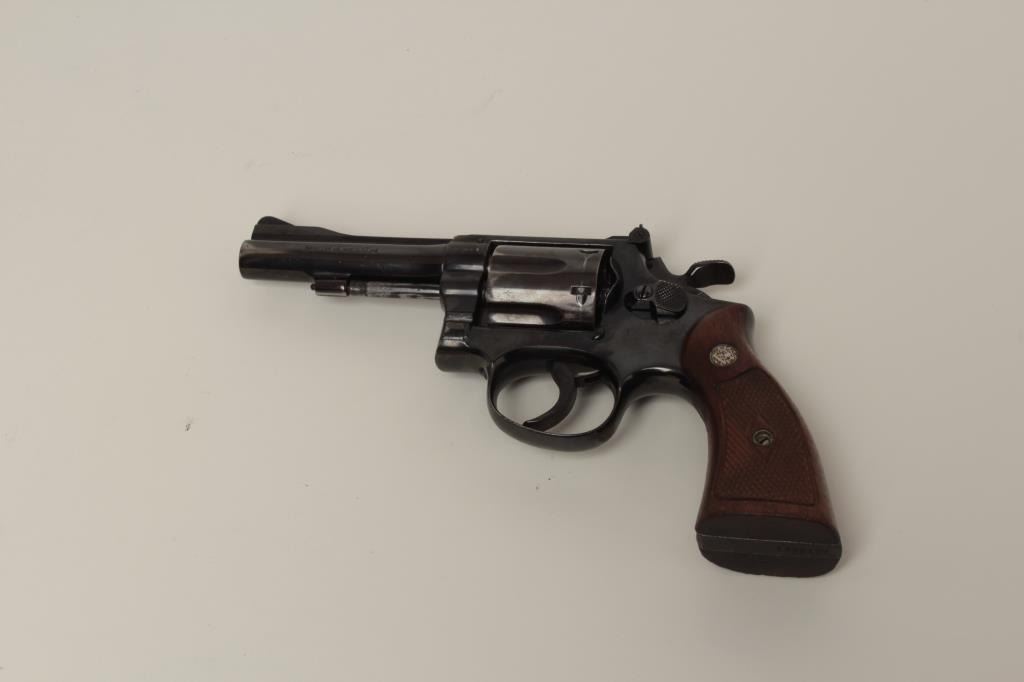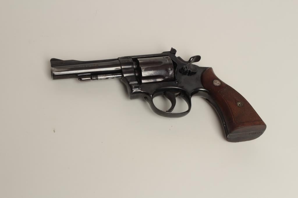 Action Revolver with 4” barrel, blue finish, checkered wood grips, S/N K389422 showing old refinish of which 80% remains. The hammer has been altered to a beavertail custom and the action has been worked. The bore is great. An old “Cop gun” when the Combat Masterpiece was king (1960s-70s). (Modern/PPT) Est.: $250-$500