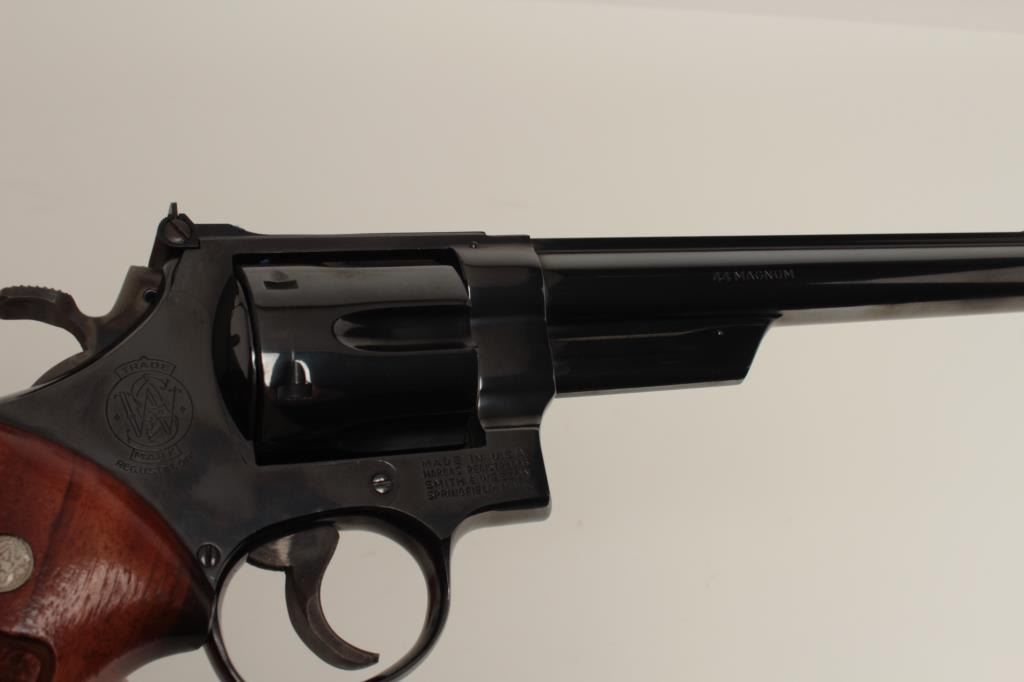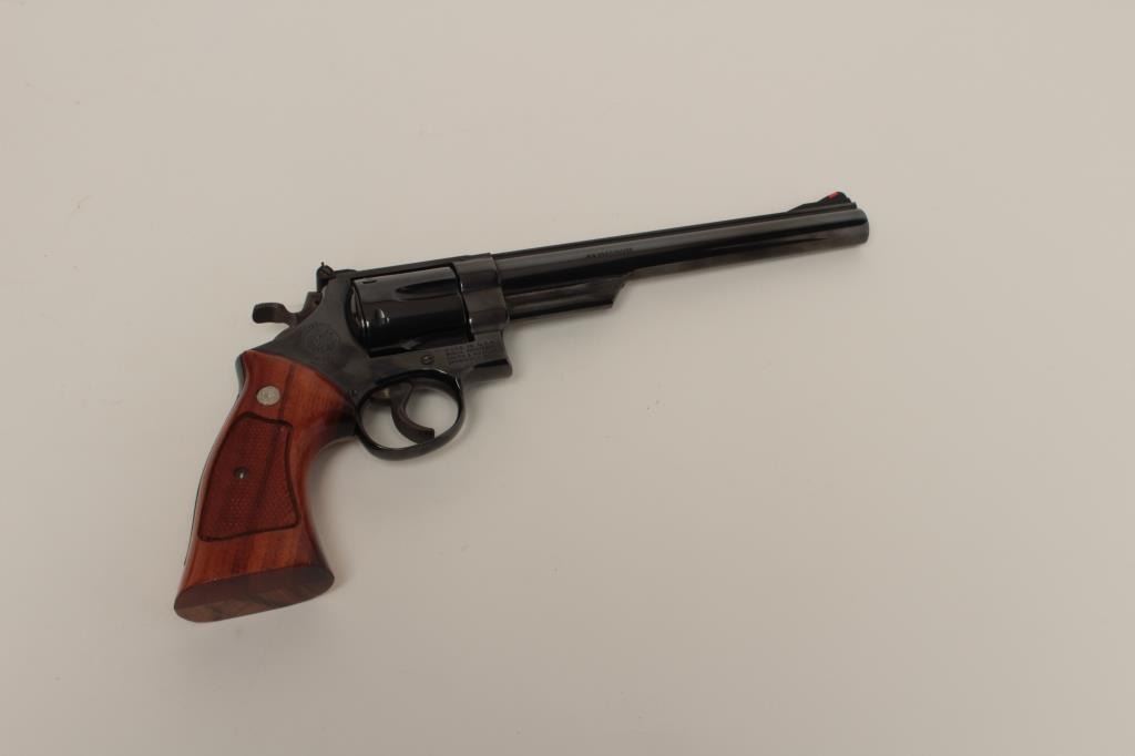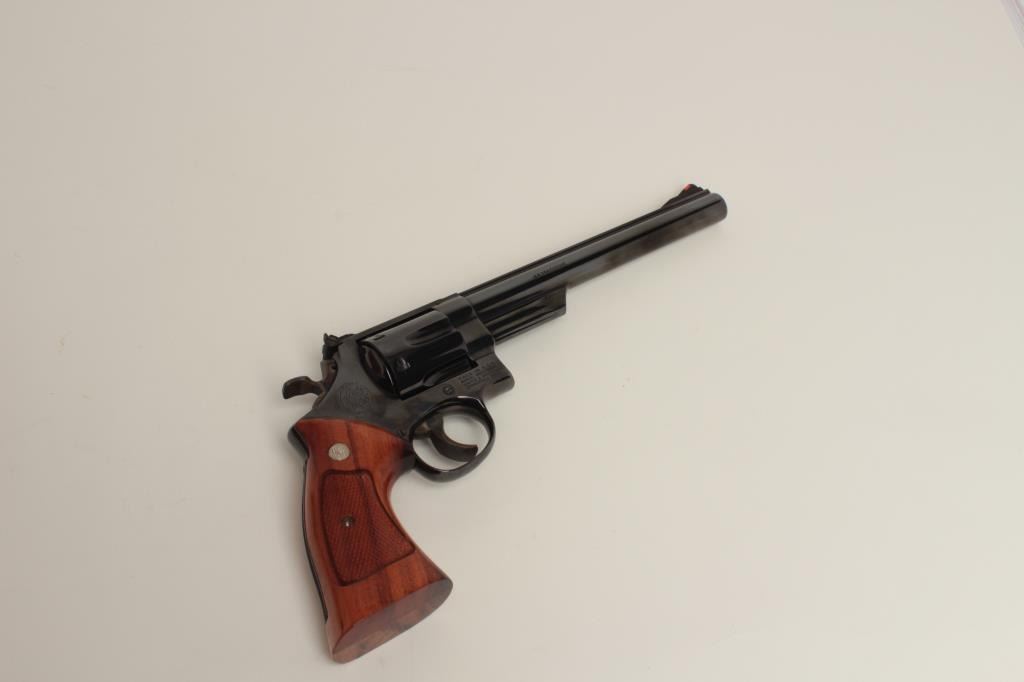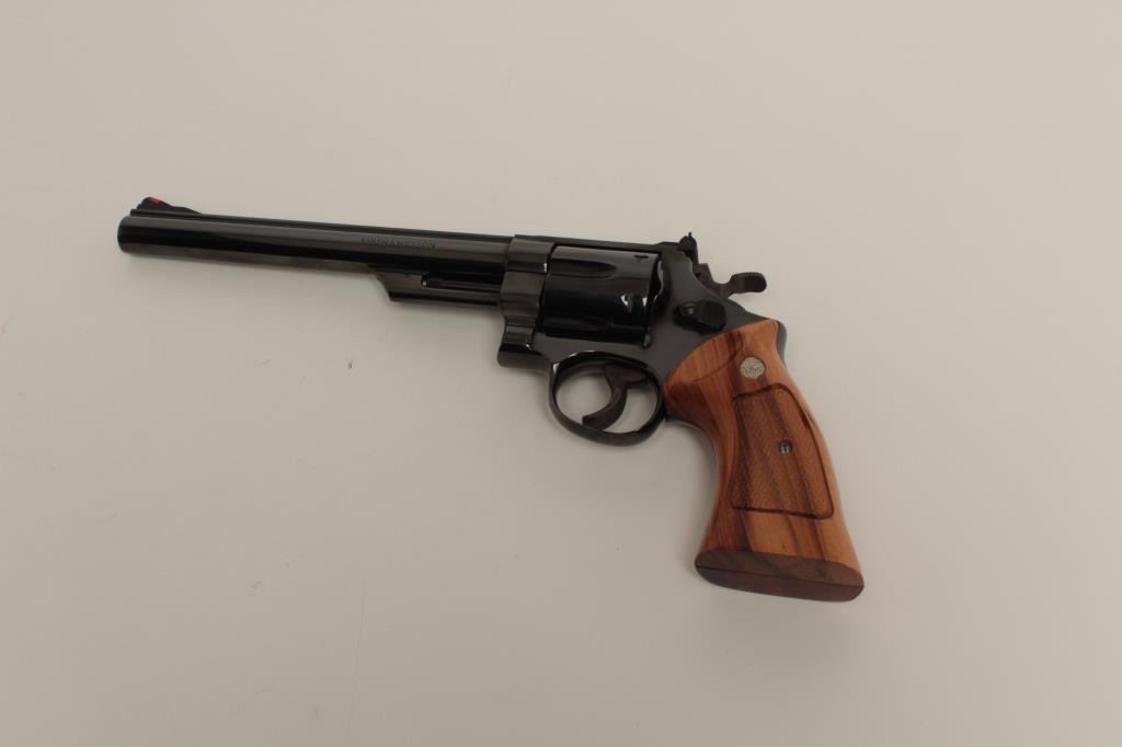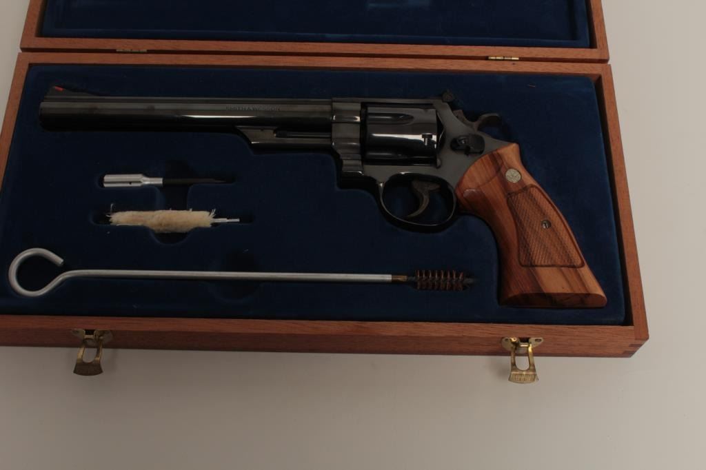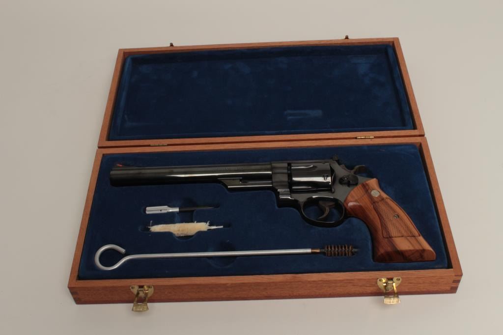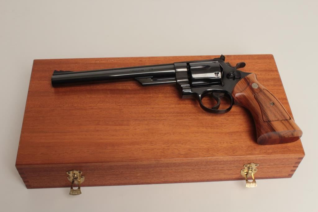 Magnum caliber, 8.375” barrel, blued finish, checkered wood medallion combat grips, S/N N358375, in like new condition and contained in a factory wood presentation case with cleaning accessories. (Modern/PPT). Est.: $900-$1,800.
