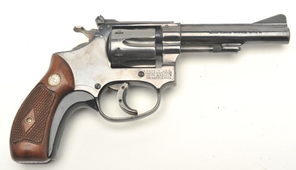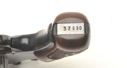 caliber, S/N 37890 with blue finish, 4” barrel, adjustable rear sights and Mershon grip adapter with removable trigger shoe. This revolver shows holster wear at the muzzle with considerable drag line on the cylinder and fine scratches throughout the frame. 80%-90% case hardening on the hammer and trigger. The trigger shoe and grip adapter are easily removable. Very collectible. (Modern/PPT) Est.: $350-$700
