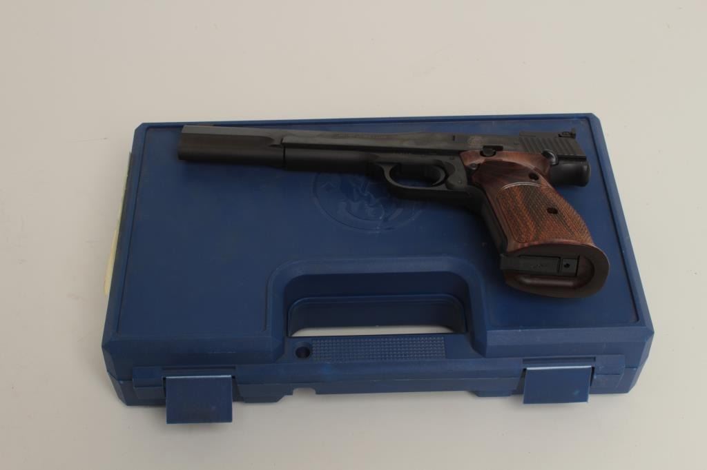 .22LR caliber, 7” barrel, blued finish, checkered deluxe hardwood grips, S/N UBH7297, in like new condition with one extra magazine and contained in a factory blue hard carry case. (Modern/PPT). Est.: $750-$1,500.