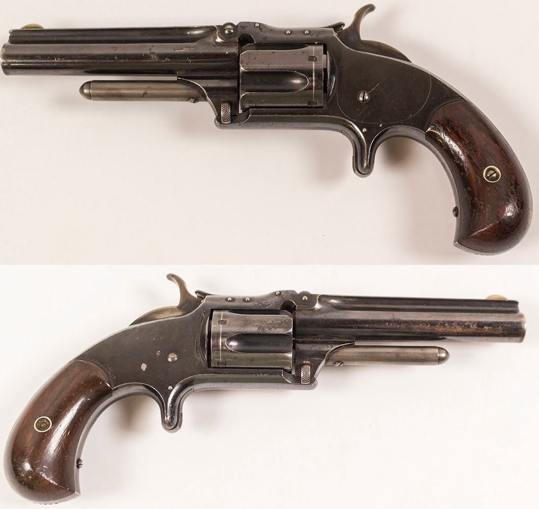 This is nice example of the Model 1 1/2 Revolver with standard blued finish and rosewood grips. Once produced by Smith and Wesson from 1868-1875; this was the firm's best improvement for the .32 rim-fire tip-up. It has the more stylish stream-lined barrel, fluted cylinder, and birds-head grips.The overall condition is exceptionally bright original blued finish at 96% overall appearance. Many have not survived with consistent bluing like this one. The hammer, ejector pin, and trigger still show most of their original case colors. The Rosewood grips are untouched and still retain 85% original violin varnish. Very good condition of screws and pins throughout. The barrel is nice and tight to the frame and the action functions flawlessly. A very nice bright shiny bore. This is one of the finest examples of a S&W 1 1/2 in all original condition. Date: Location: HWAC # 55367