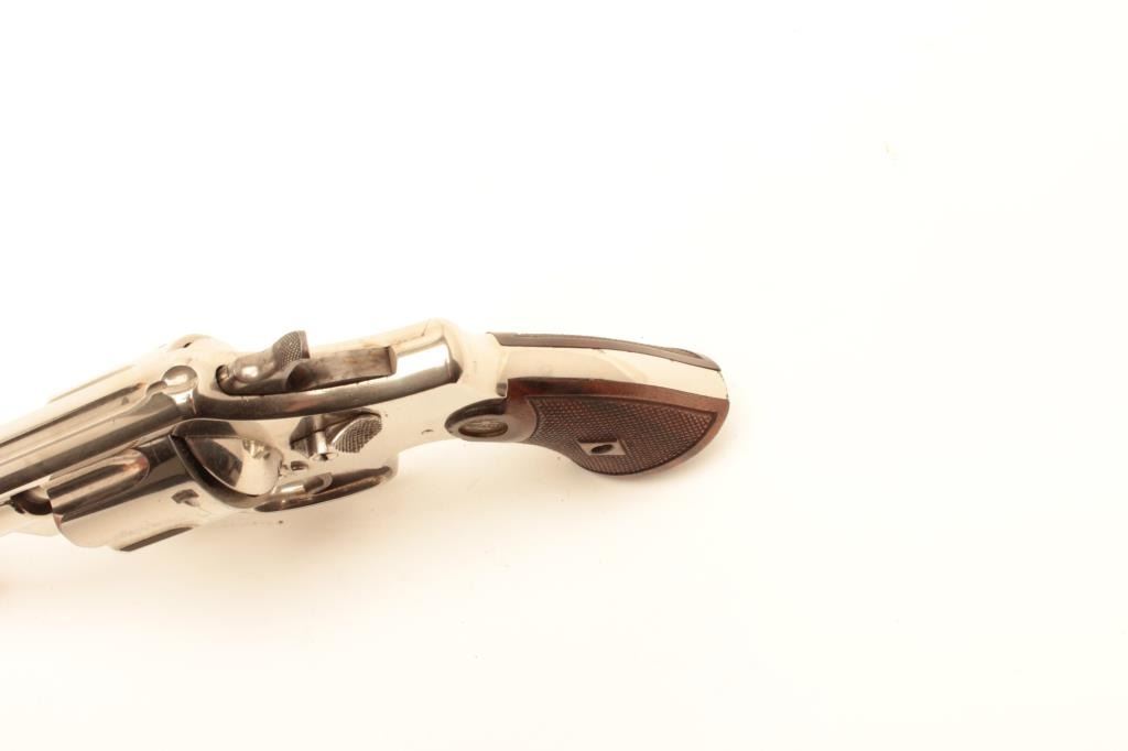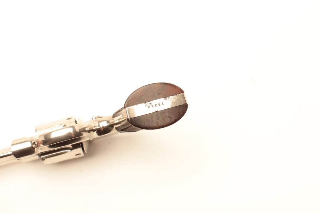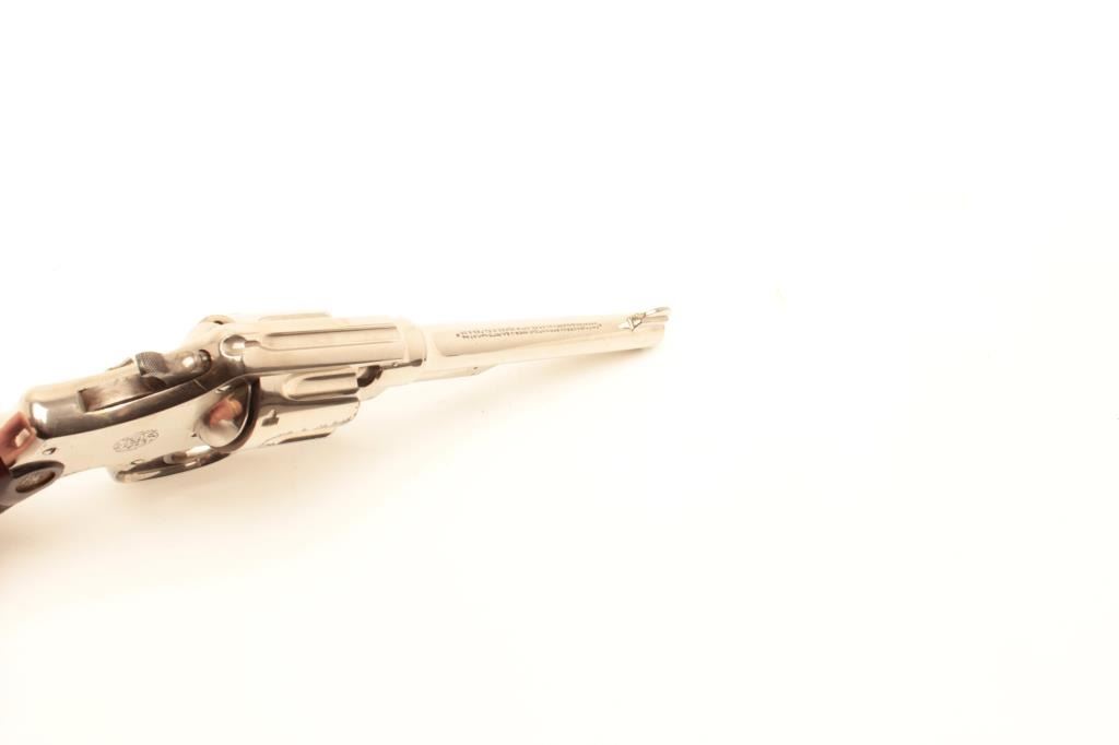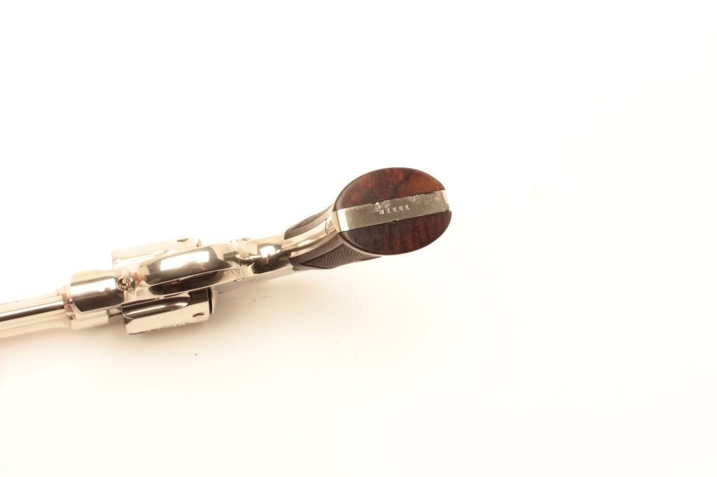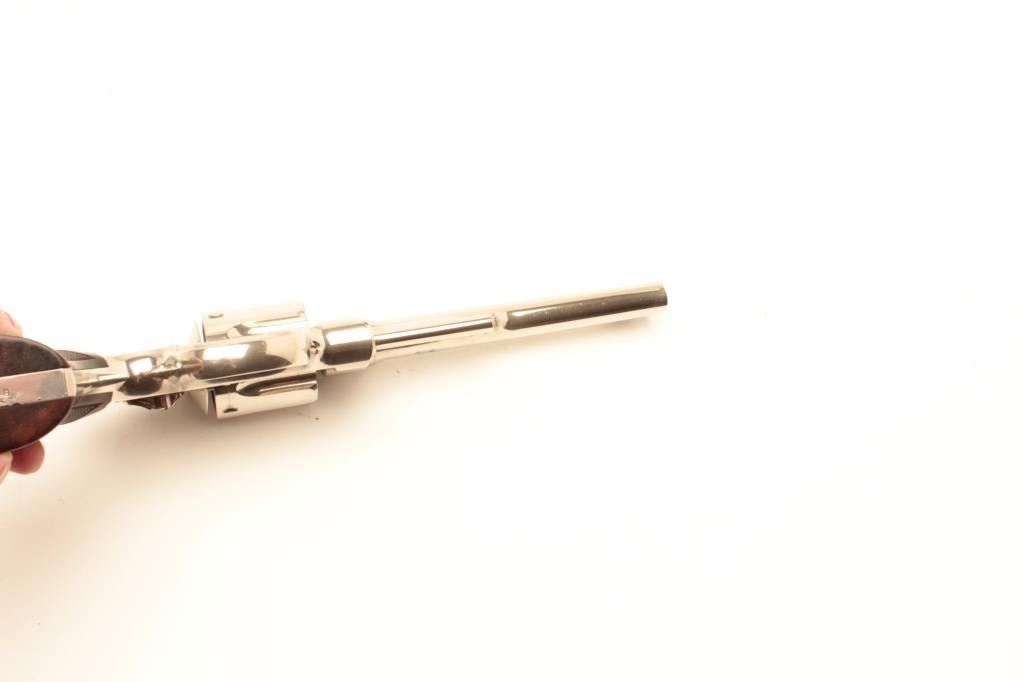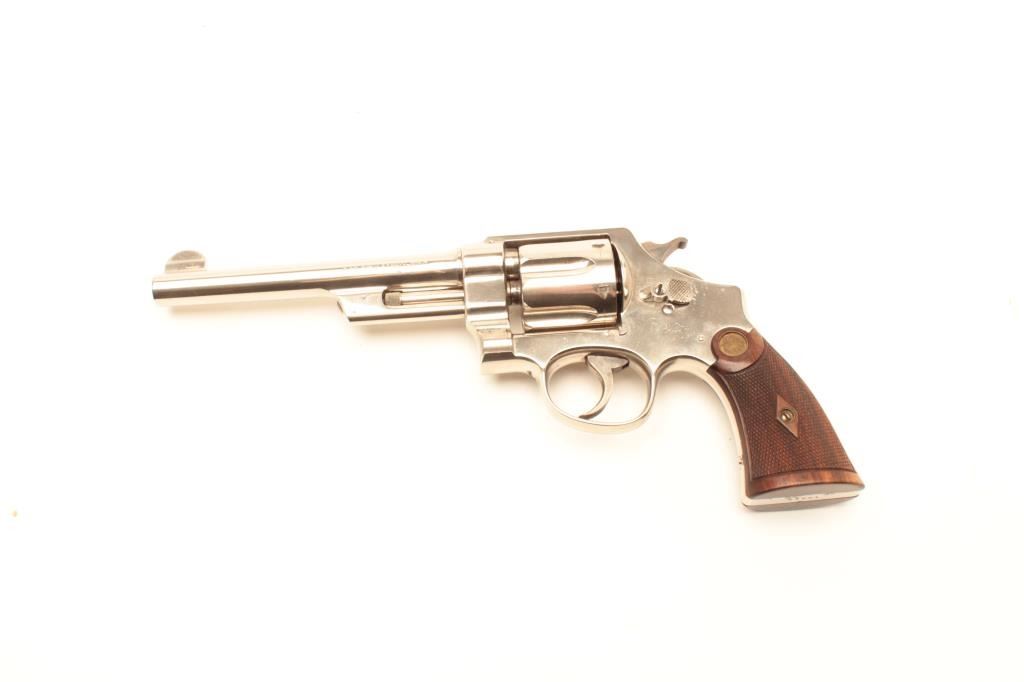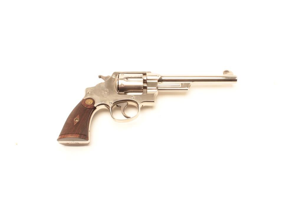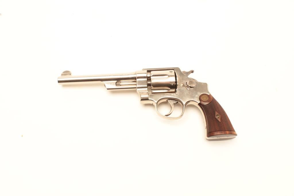 Smith and Wesson 1st Model Hand Ejector revolver, .44 S&W Special caliber, Serial #13318. The pistol is in fine overall condition with a 6 ½” barrel. The pistol retains approximately 90% of its factorynickel finish with light holster wear noted at the muzzle, some loss of finish on the cylinder and light freckling on the frame. The pistol features a five screw frame with muted case coloring on the hammer andtrigger. The checkered wood gold medallion grips are in very good condition with only storage marks noted. The bore is good, the action crisp and markings are sharp. Also known as the .44 New Century Triple Lock, 1st Model Hand Ejectors were introduced in 1908 and manufactured until 1915. This Triple lock has seen little use, from the Gil Newton Collection. Est.: $1,500-$3,000. (C+R).