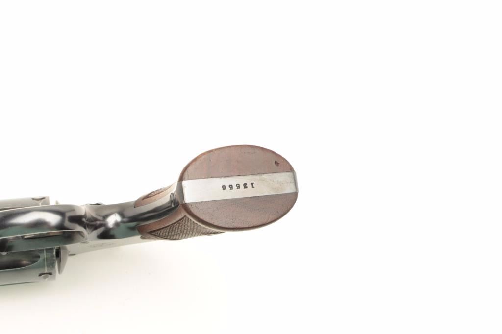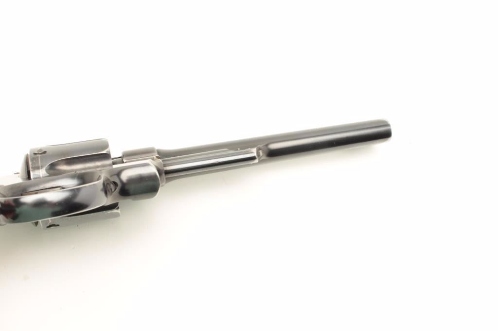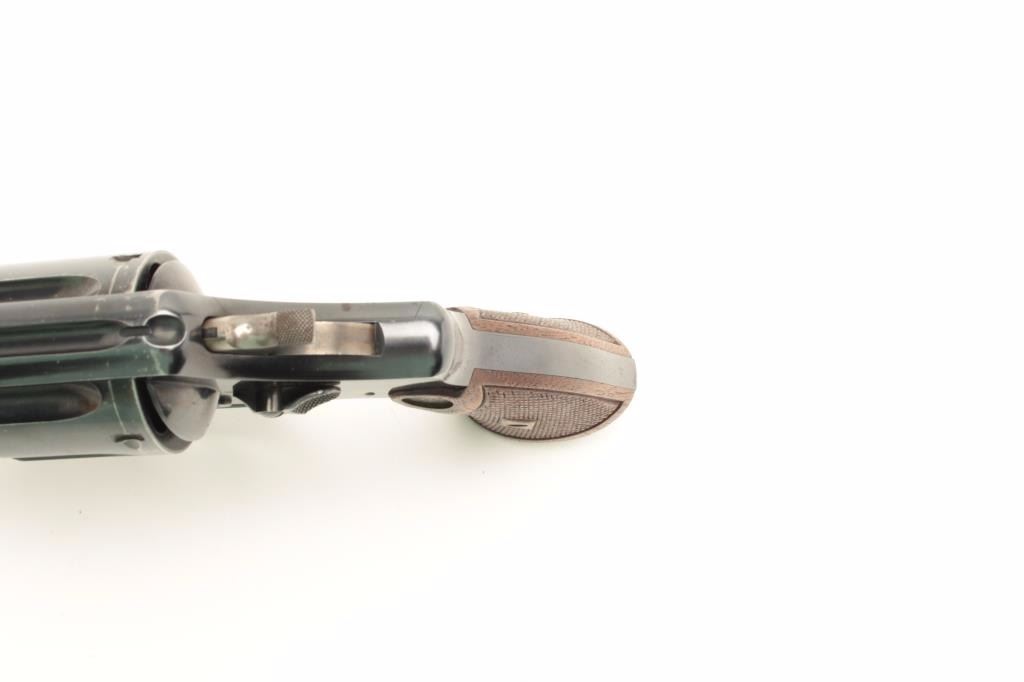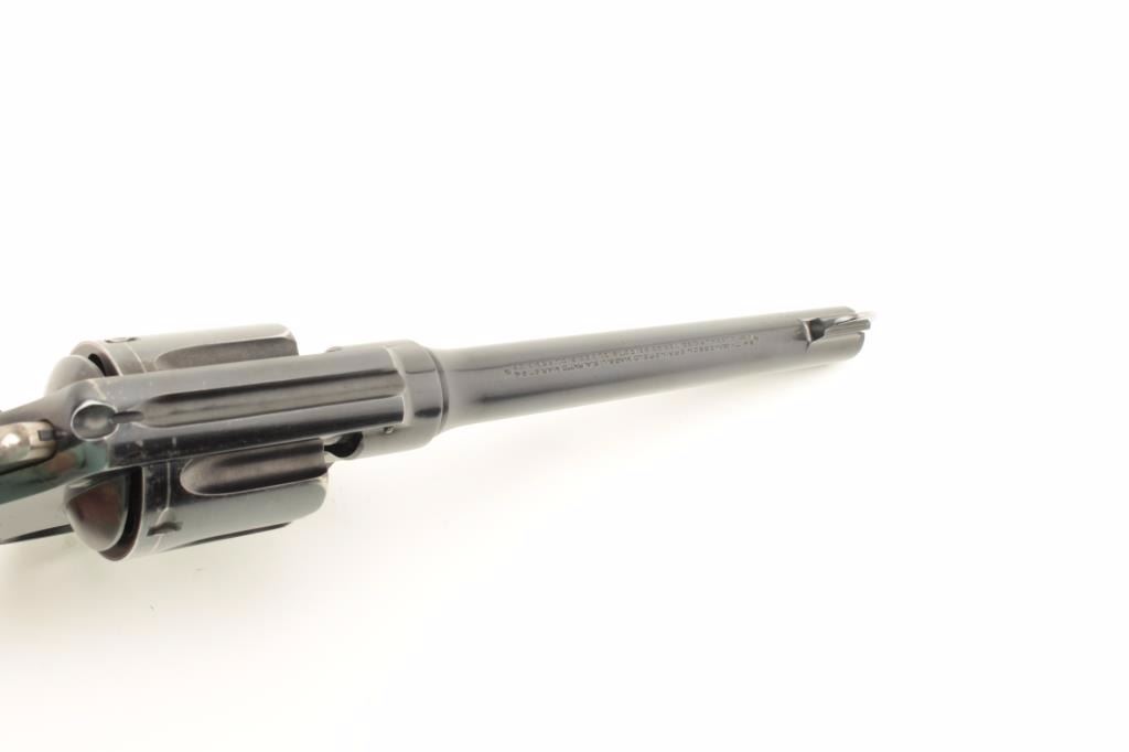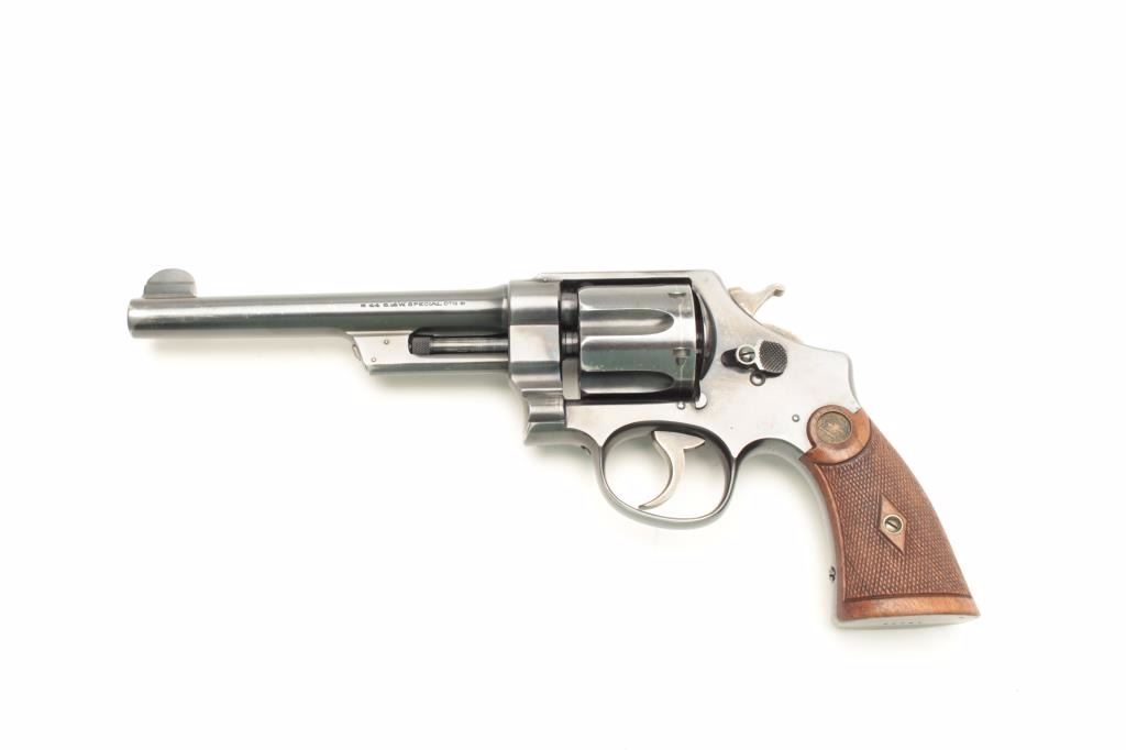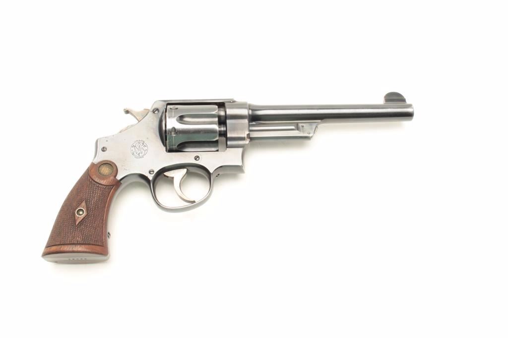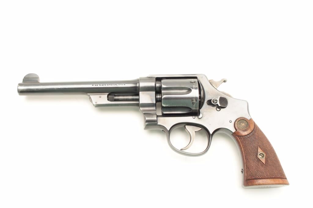 Smith and Wesson 1st Model Hand Ejector revolver, .44 S&W Special caliber, Serial #13556. The pistol is in very good overall condition with a 6 ½” barrel. The pistol retains approximately 85-90% of its bluefinish with light wear at the muzzle and a small area of pin prick pitting on the frame. The pistol features a five screw frame with muted case coloring on the hammer and trigger. The checkered wood medallion gripsare in very good condition with small mars and some flattening of the checkering. The bore is good, the action is crisp and markings are sharp. The pistol includes a Smith and Wesson factory letter confirmingall features indicating that the pistol was shipped to Paxton and Gallagher, Omaha, NE., on January 17, 1917. From the estate of Larry Gaertner. Est.: $900-$1,800. (C+R)