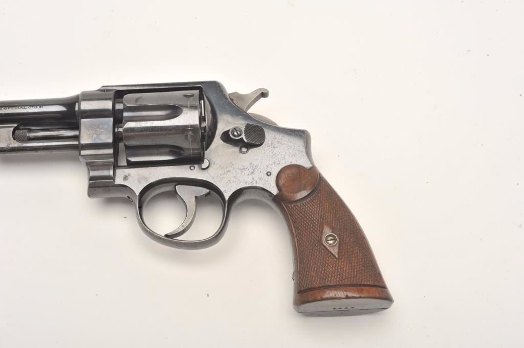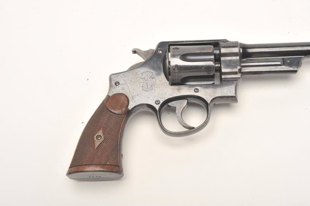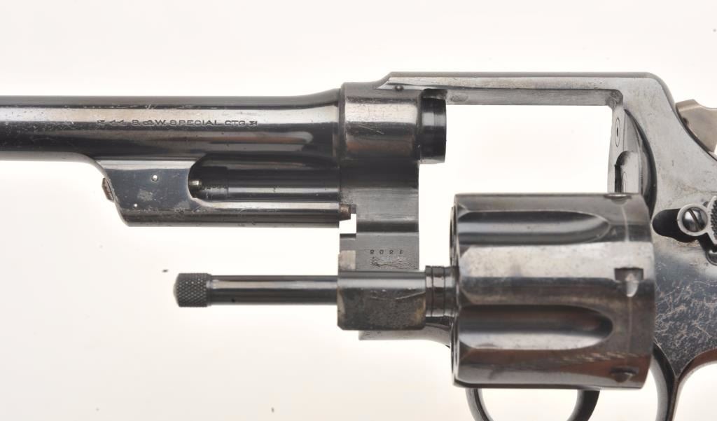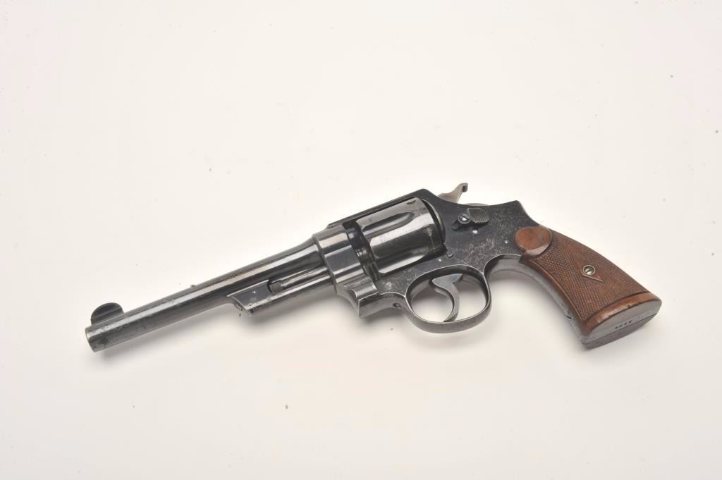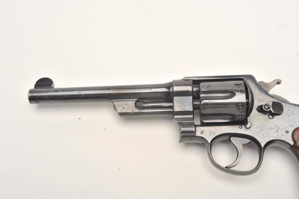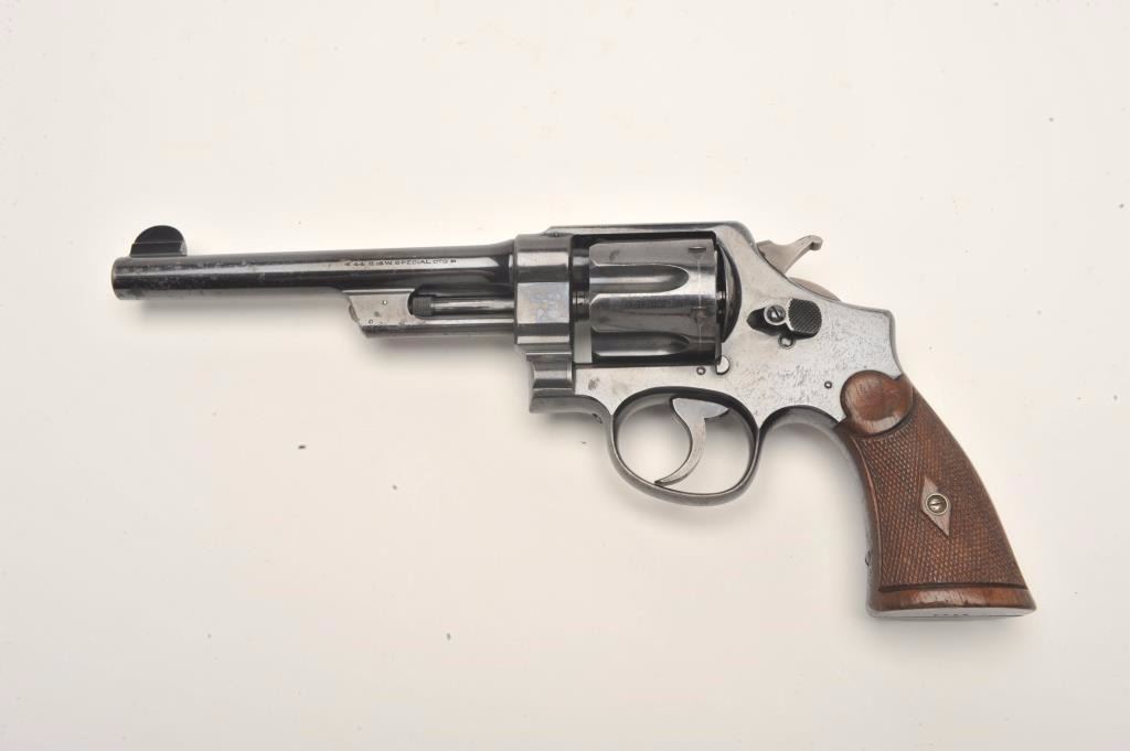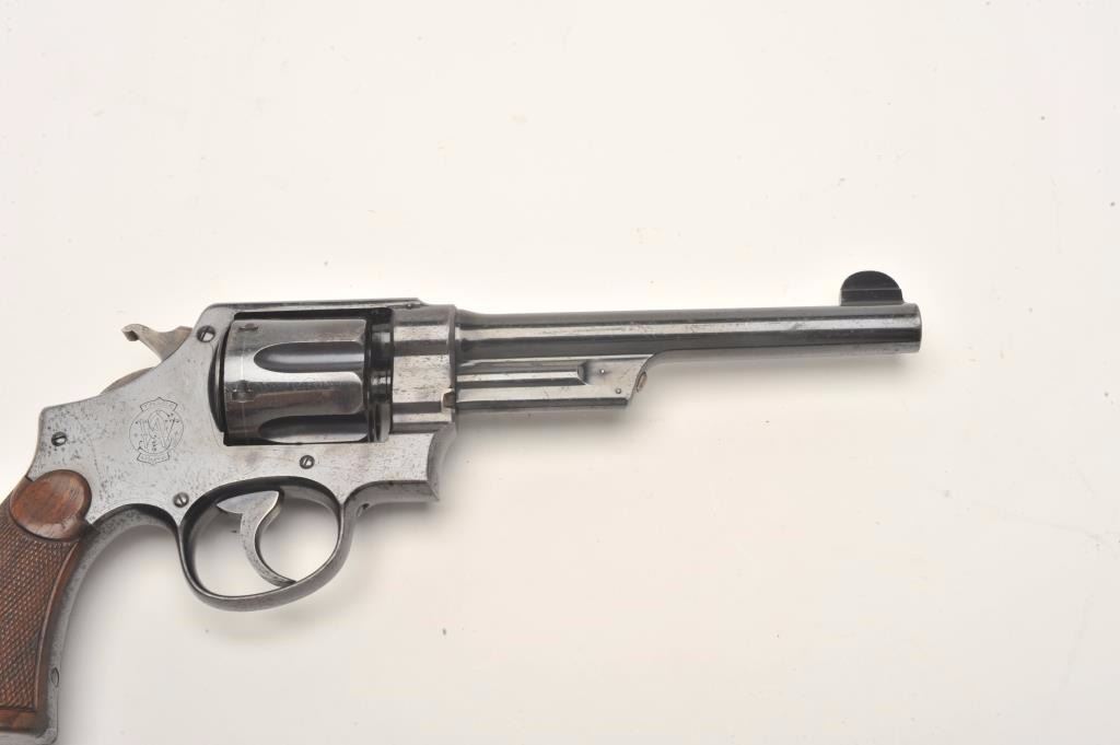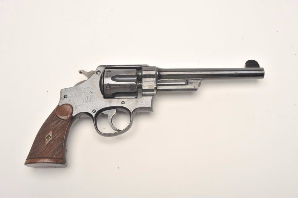 Smith and Wesson 1st Model Hand Ejector revolver, .44 S&W Special caliber, Serial #2954. The pistol is in fine overall condition with a 6 ½” barrel. The pistol retains approximately 85% of its flaking blue finish with areas of loss along the barrel and at the rear of the frame. The pistol features a five screw frame and vivid case coloring of the hammer and trigger. The checkered wood grips are in very goodcondition with small mars and storage wear noted. The bore is very good, the action crisp and markings are sharp. The pistol includes a Smith and Wesson factory letter confirming all features and indicating thepistol was shipped to M.W. Robinson, New York City, NY, on May 29, 1912. Also known as the .44 New Century Triple Lock, 1st Model Hand Ejectors were introduced in 1908 and manufactured until 1915. A nice example ofan early Triple lock. From the estate of Larry Gaertner. Est.: $1,400-$2,800. (C+R)