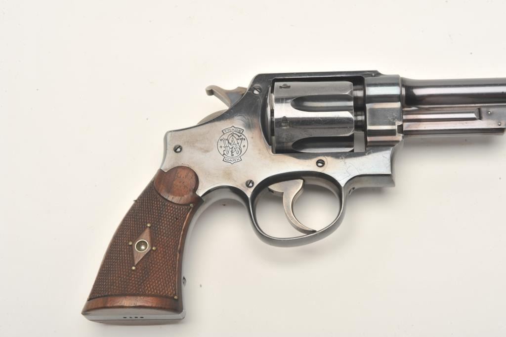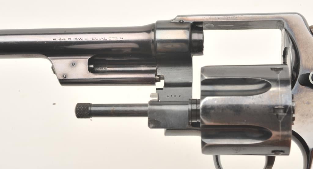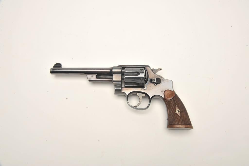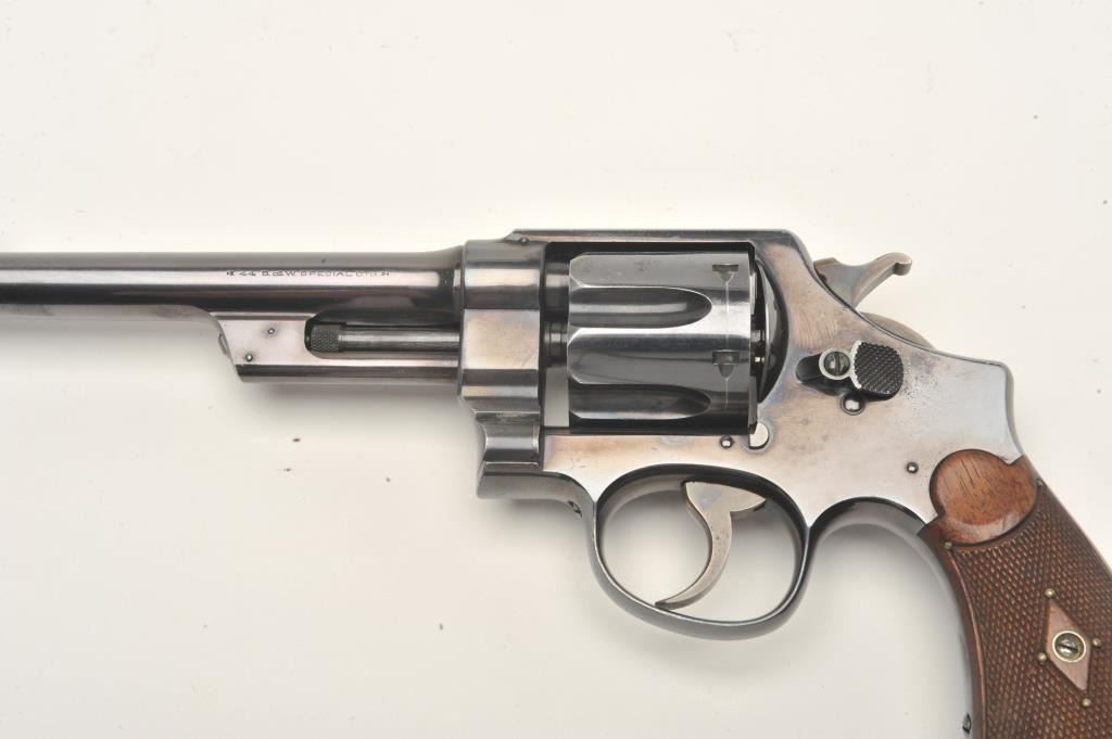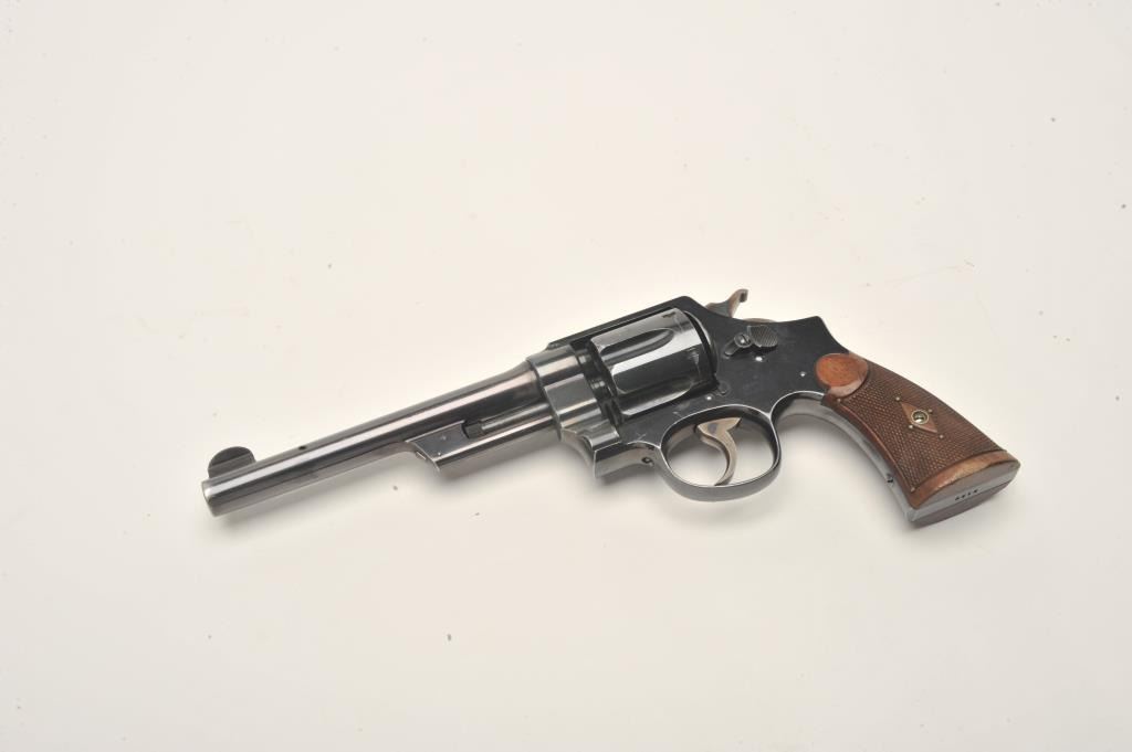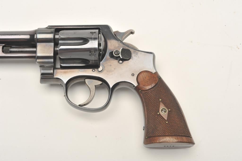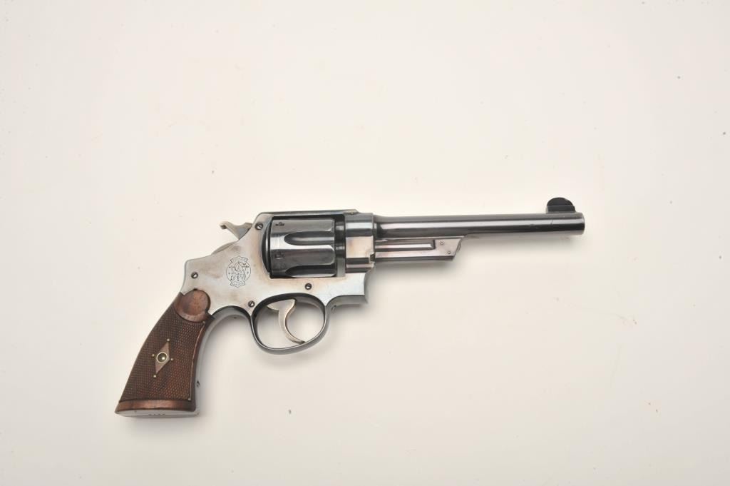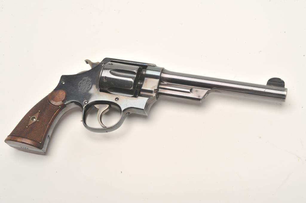 Smith and Wesson 1st Model Hand Ejector revolver, .44 S&W Special caliber, Serial #3196. The pistol is in fine overall condition with a 6 ½” barrel. The pistol retains approximately 95% of its muted bluefinish with wear at the muzzle and a drag line on the cylinder noted. The pistol features a five screw frame and vivid case coloring of the hammer and trigger. The checkered wood grips are in very goodcondition. Brass tacks have been added as decoration to the grips during the period of use. The bore is very good, the action crisp and markings are sharp. The pistol includes a Smith and Wesson factory letter confirming all features and indicating the pistol was shipped to M.W. Robinson, New York City, NY, on March 29, 1911. Also known as the .44 New Century Triple Lock, 1st Model Hand Ejectors were introduced in 1908 andmanufactured until 1915. A nice example of an early Triple lock. From the estate of Larry Gaertner. Est.: $1,500-$3,000. (C+R)