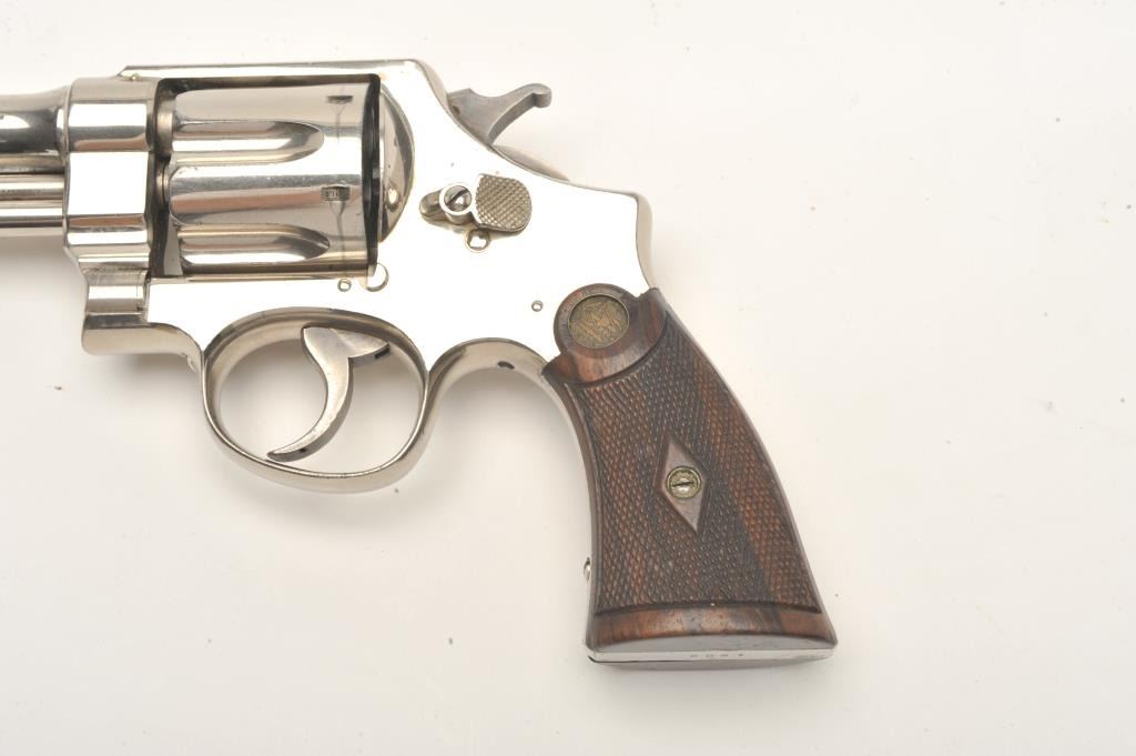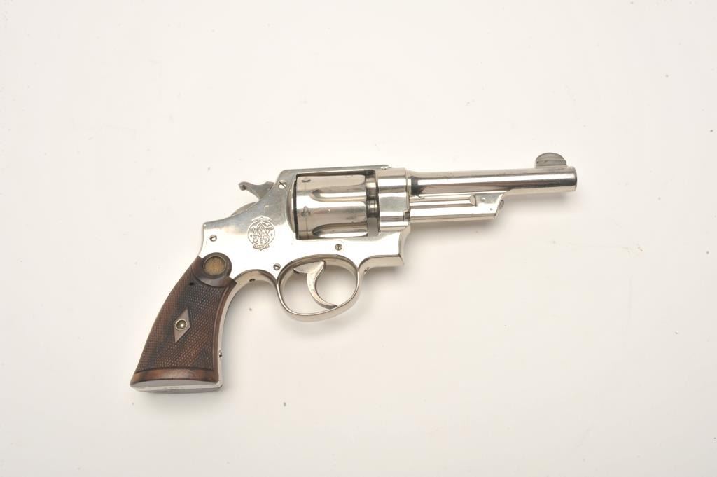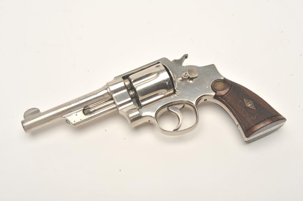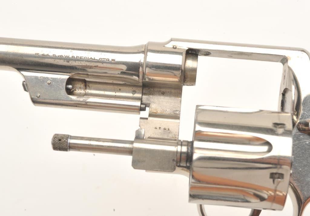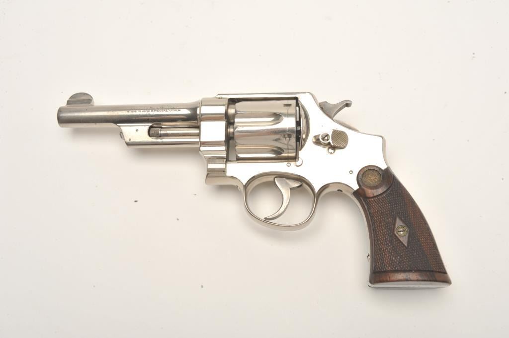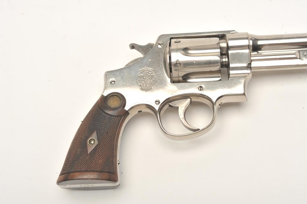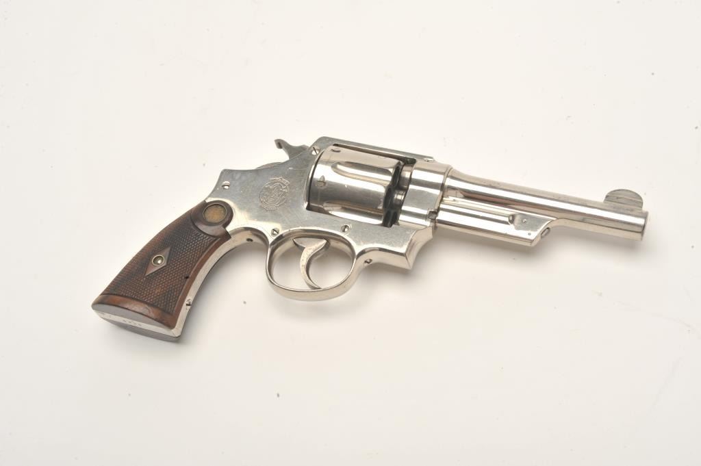 Smith and Wesson 1st Model Hand Ejector revolver, .44 S&W Special caliber, Serial #4902. The pistol is in fine overall condition with a 5” barrel. The pistol retains approximately 95% of its factorynickel finish with light muzzle wear and small handling marks observed. The checkered wood gold medallion grips are in very good condition with small mars and storage marks. The bore is very good, the action is crispand the markings are sharp. The pistol features a five screw frame while the hammer and trigger display beautiful, vivid case hardening. The pistol is accompanied by a Smith and Wesson factory letter confirmingthe features as described and indicating that the pistol was shipped to William Hoegee Co., Los Angeles, CA on May 29, 1911. Also known as the .44 New Century Triple Lock, 1st Model Hand Ejectors were introduced in 1908and manufactured until 1915. From the estate of Larry Gaertner. Est.: $2,000-$4,000. (C+R)