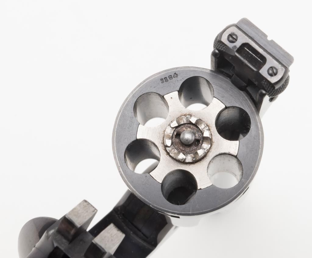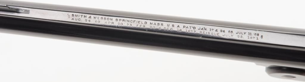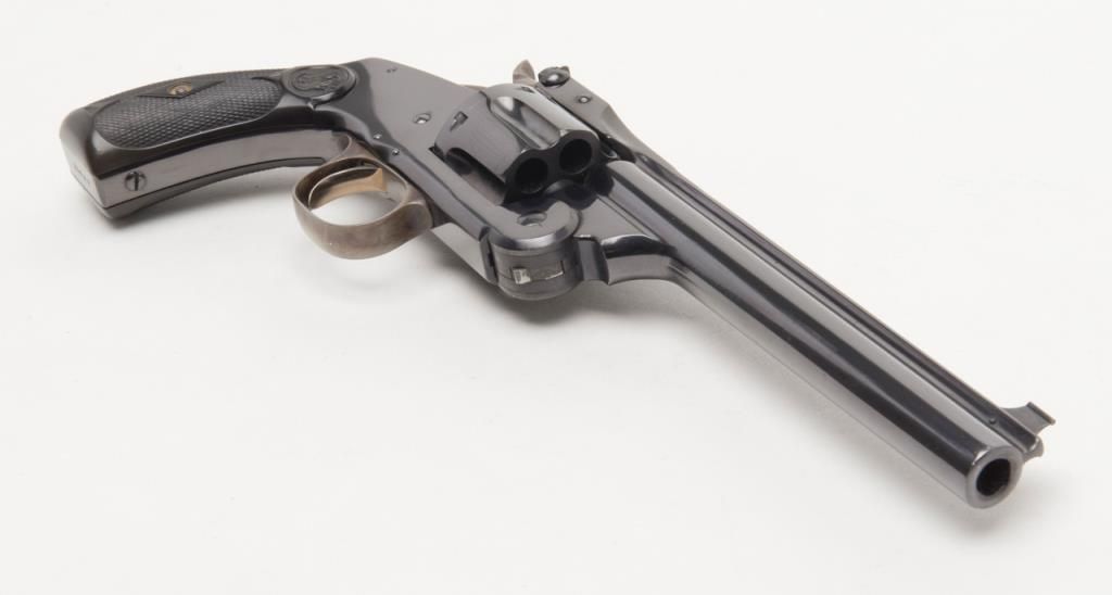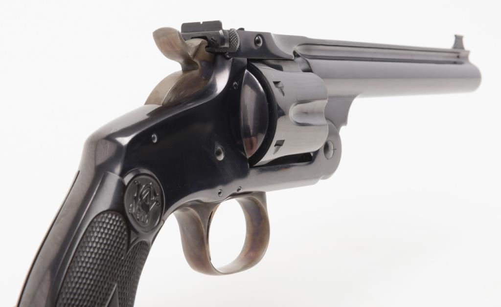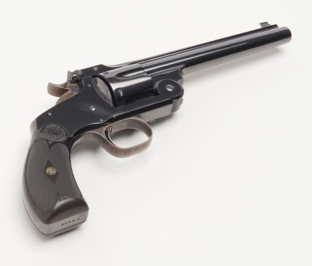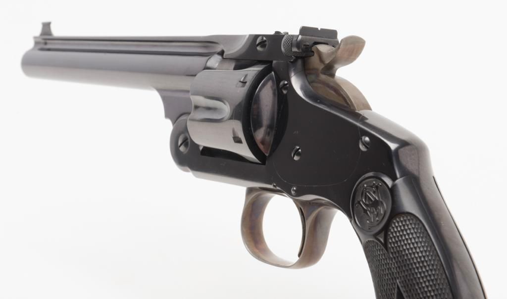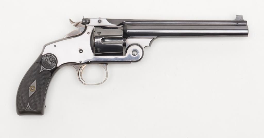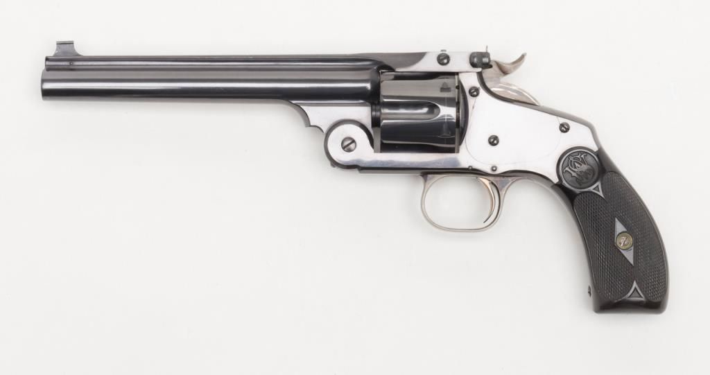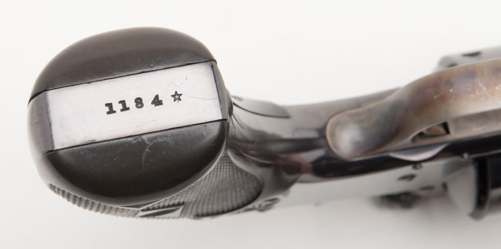 Smith and Wesson #3 Target Model revolver, cal. .38/44, Serial #1184. The gun is in excellent overall condition as factory re-finished. The pistol retains approximately 97% of an older factory re-finish with significant case colorpresent on both the trigger guard and hammer. The bore is very good, action crisp and markings sharp. The checkered hard rubber grips are in overall very good condition as well. (Antique). Est.: $2,000-$4,000.