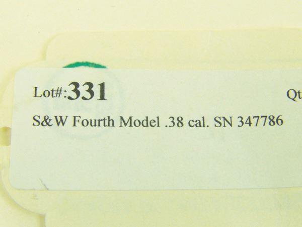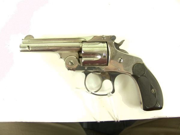 Nickel plated .38 caliber double action revolver with five-shot fluted cylinder, hard rubber grips, top break action, and S&W logo on grips and case. Good condition. SN 347786.Ca. 1890s3-1/4"