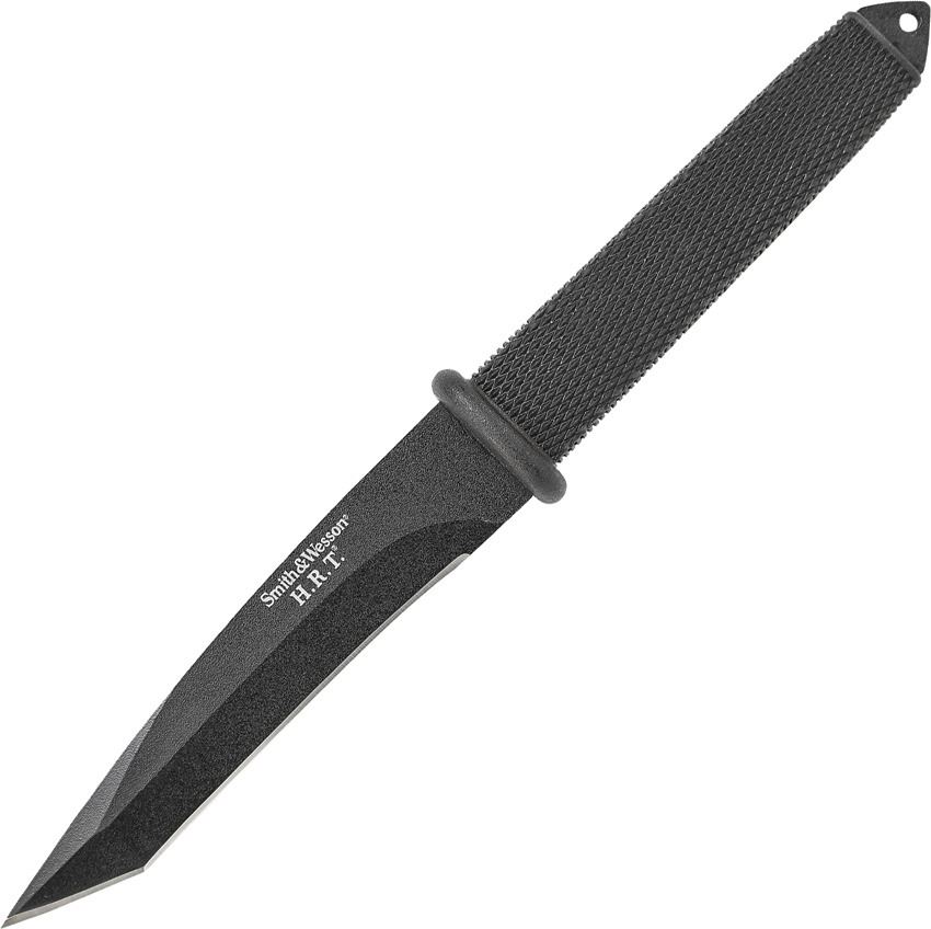 11" overall. 5 1/2" black finish stainless tanto blade. Checkered black rubberized handle with integrated guard. Lanyard hole. Black leather sheath with black finish stainless belt/boot clip.