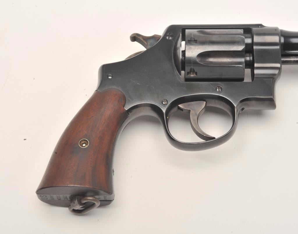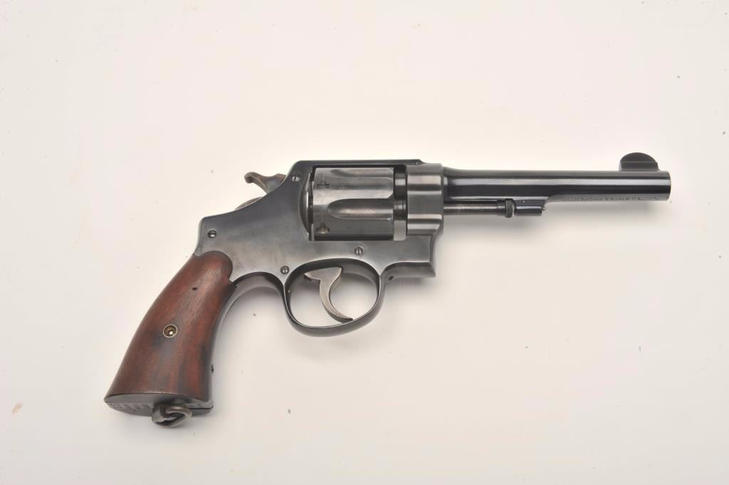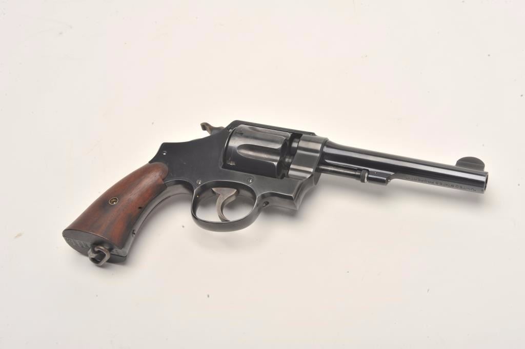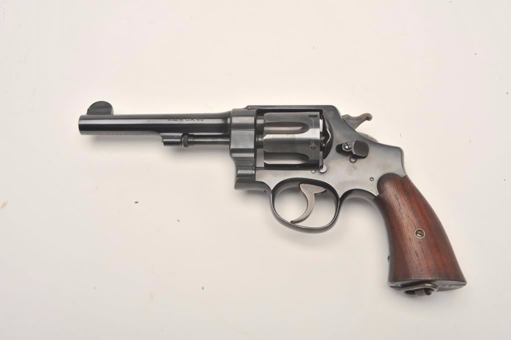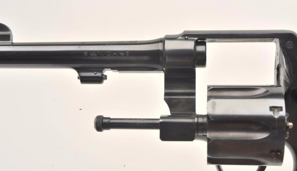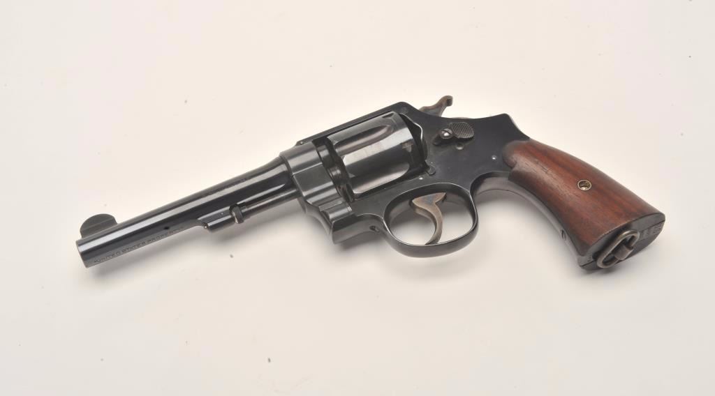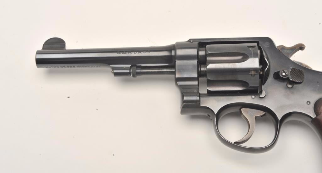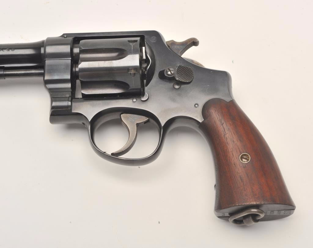Smith and Wesson Hand Ejector Service Model of 1917, .45 ACP caliber, Serial #6872. The pistol is in excellent to nearly mint overall condition with a 5 ½” barrel. The pistol retains approximately 98% of its blue finishwith only light storage marks and a faint drag line noted. The pistol features a five screw frame with beautiful, vivid case colors on the hammer and trigger. The smooth wood grips are in very good condition showing only light handling marks and a lanyard ring on the base. The butt is marked, “US ARMY MODEL 1917”. The bore is very good, the action crisp and markings are sharp. The rear of the cylinder is stamped with an “S” forColonel Gilbert H. Stewart, Inspector. The pistol includes a Smith and Wesson factory letter confirming all features and indicating shipment to the U.S. Armory, Springfield, Massachusetts on February 2, 1918. From theestate of Larry Gaertner. Est.: $1,400.00-$2,800. (C+R)