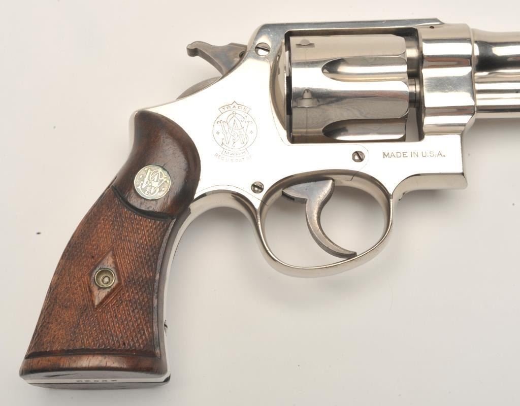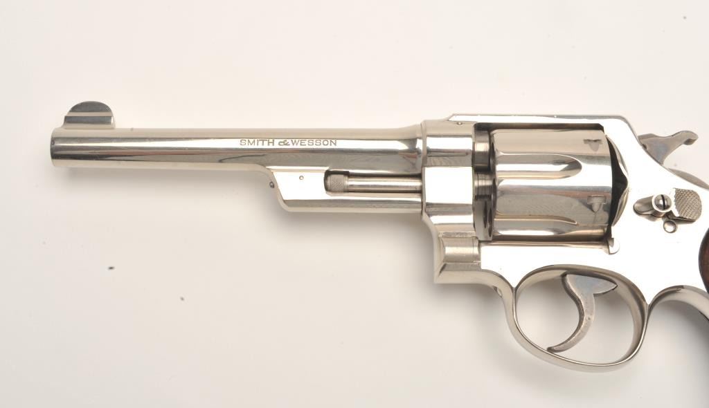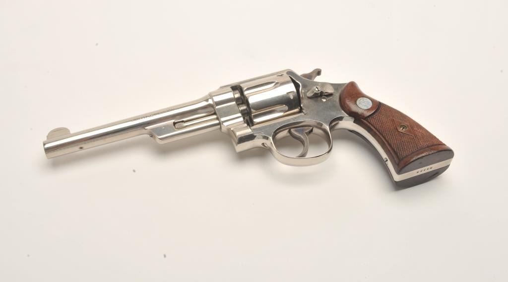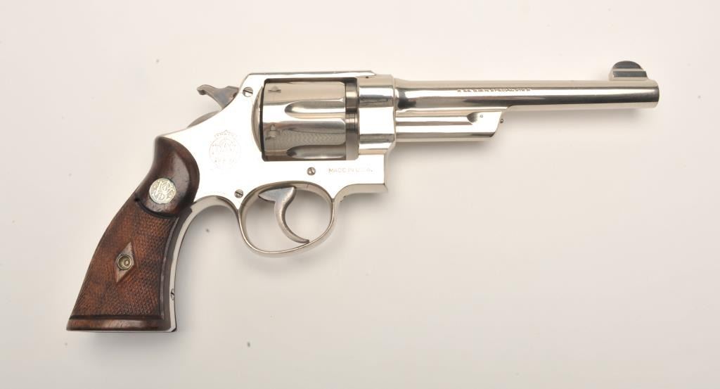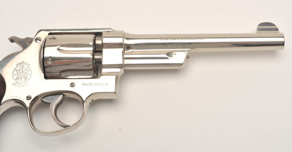 Smith and Wesson Hand Ejector Third Model revolver, .44 S&W Special caliber, Serial #56225. The pistol is in fine overall condition with a 6 ½” barrel. The pistol retains approximately 98% of its originalnickel finish with a small loss at the muzzle. The pistol features vivid case colors on the hammer and trigger. The checkered wood medallion Magna grips are in very good condition showing small mars andhandling wear. The bore is very good, the action crisp and markings are sharp. The pistol includes a Smith and Wesson factory letter confirming all features and indicating that the pistol was shipped to J. Warshal &Son of Seattle, Washington on July 7, 1941. An outstanding example of a World War II era Third Model. From the estate of Larry Gaertner. Est.: $1,250-$2,500. (C+R)