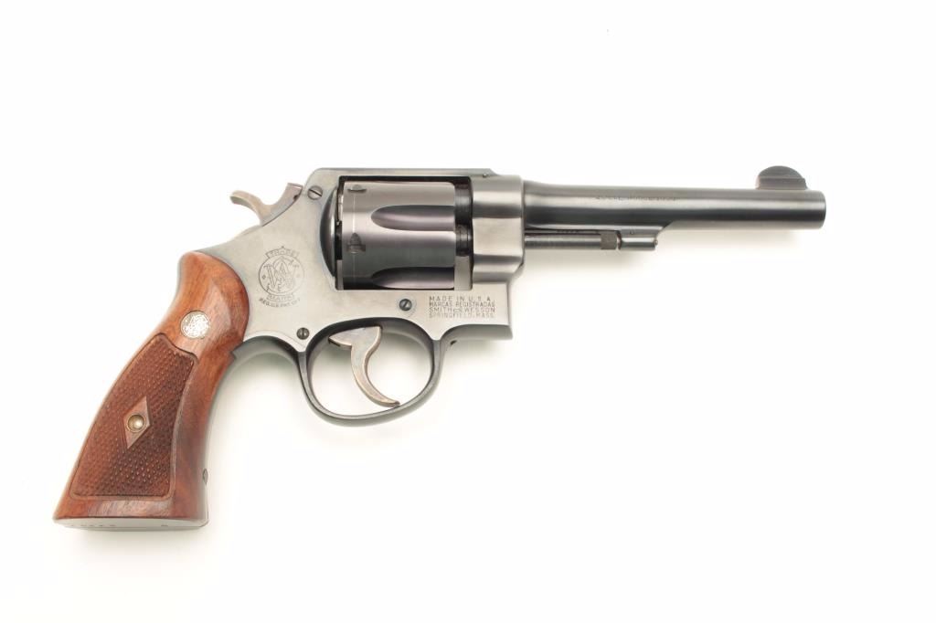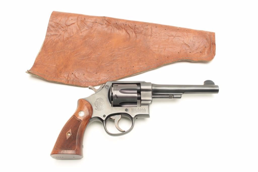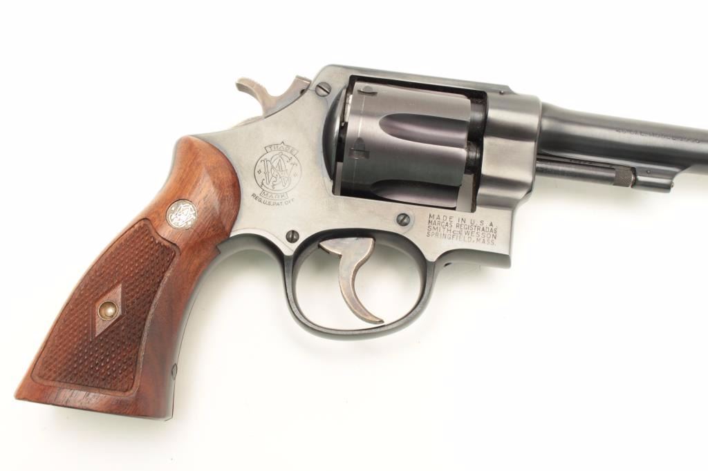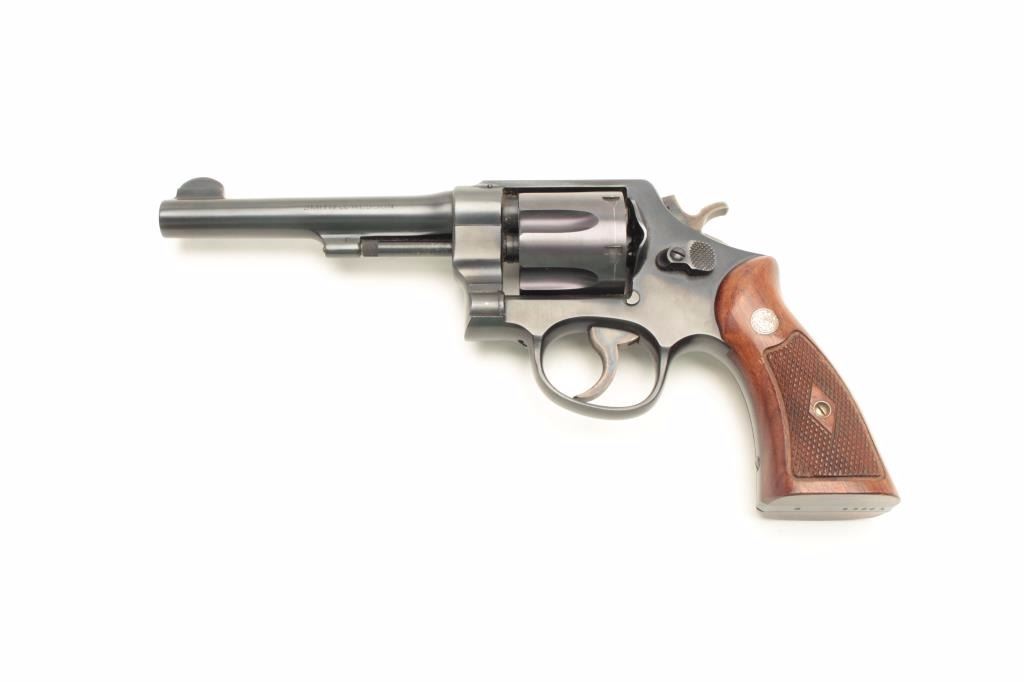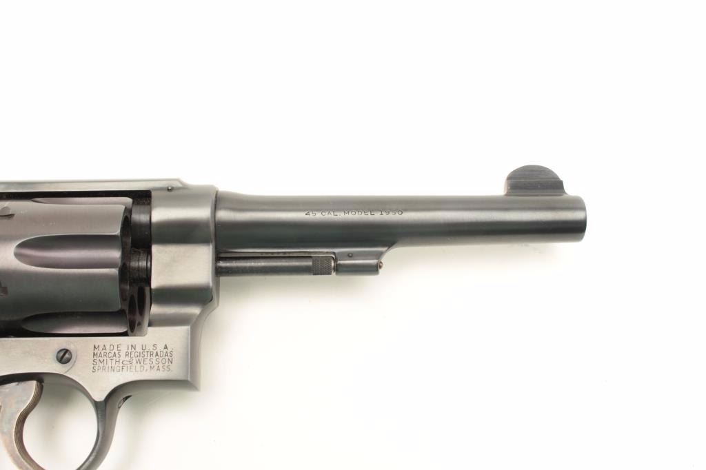 Smith and Wesson Military Model 1950 Hand Ejector revolver, .45 caliber, Serial #S 93201. The pistol is in nearly excellent overall condition with a 5 ½” barrel with fixed sights. The pistol retainsapproximately 95% of its satin blue finish with light wear at the muzzle and a faint drag line on the cylinder. The hammer and trigger display beautiful, vivid case hardening. The checkered wood silvermedallion grips are in very good condition showing only light storage and handling marks. The bore is very good, the action crisp and markings are sharp. The consignor’s notes indicate the Military Model was limited to an approximate production of 4,000, from the Gil Newton Collection. Est.: $900-$1,800. (C+R).