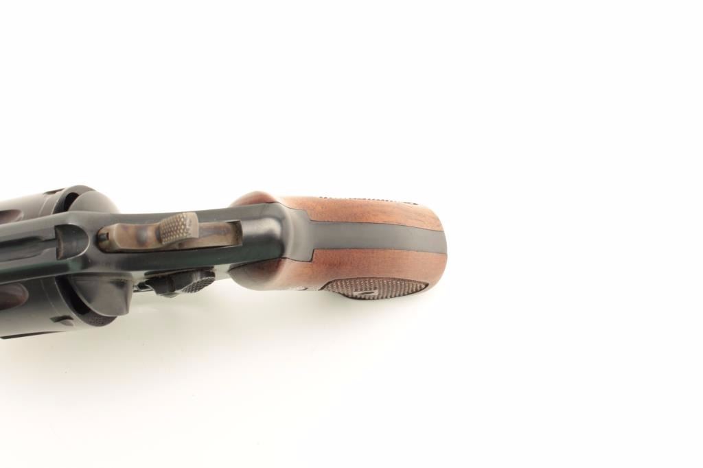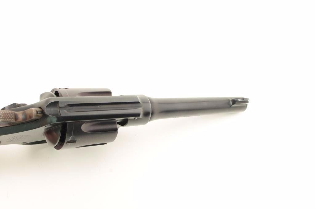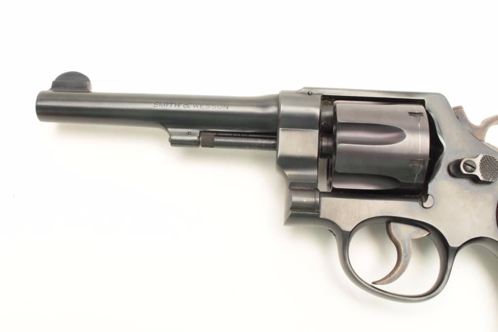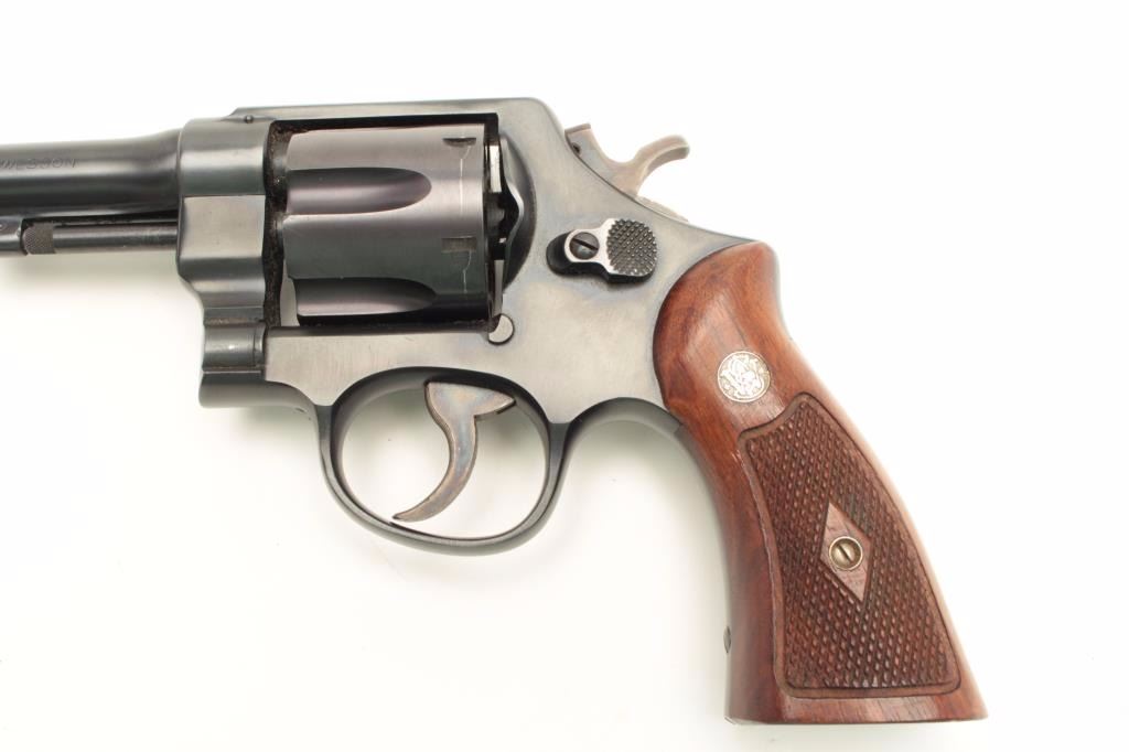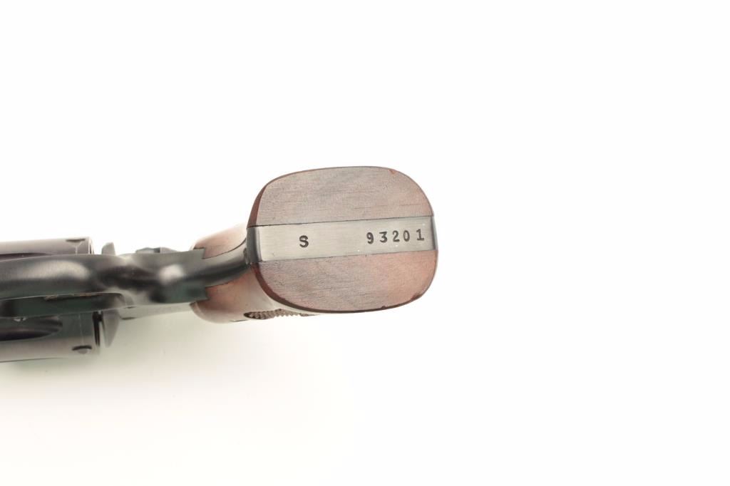 Smith and Wesson Military Model 1950 Hand Ejector revolver, .45 caliber, Serial #S 93201. The pistol is in nearly excellent overall condition with a 5 ½” barrel with fixed sights. The pistol retainsapproximately 95% of its satin blue finish with light wear at the muzzle and a faint drag line on the cylinder. The hammer and trigger display beautiful, vivid case hardening. The checkered wood silvermedallion grips are in very good condition showing only light storage and handling marks. The bore is very good, the action crisp and markings are sharp. The consignor’s notes indicate the Military Model was limited to an approximate production of 4,000, from the Gil Newton Collection. Est.: $900-$1,800. (C+R).