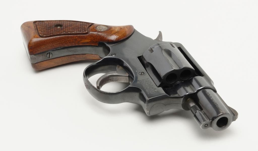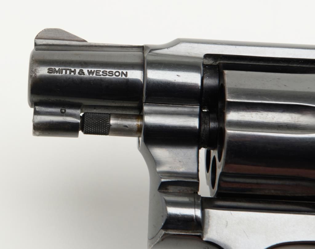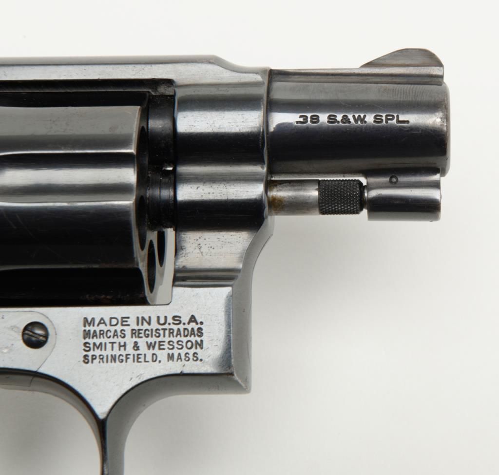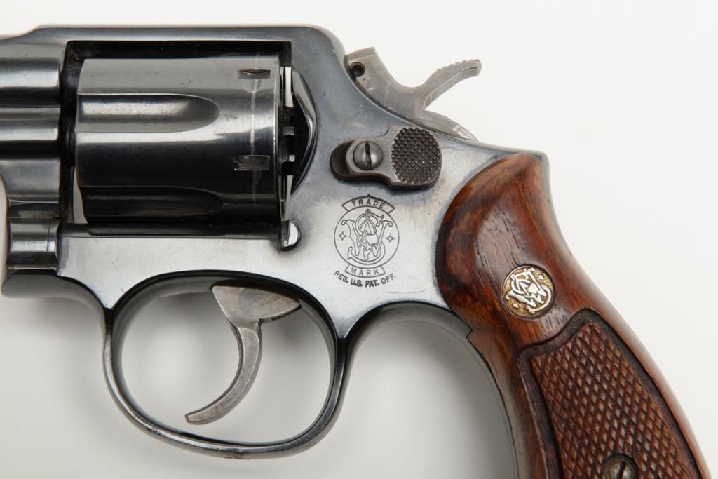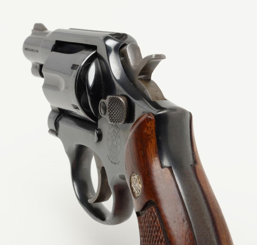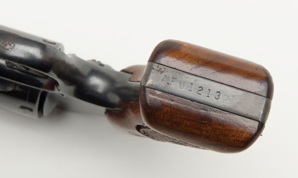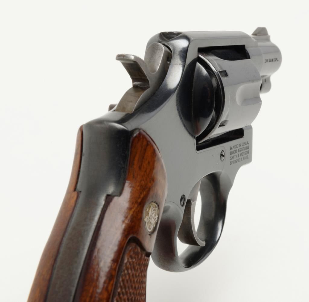 Smith and Wesson Model 10-7 revolver, cal. .38 Sp., Serial #AFU1213. The pistol is in overall good to very good condition with a 2" barrel. The pistol retains nearly all of its blued finish, the back strap having lost most of its finish with significant surface rust present. The bore is good and may clean, while the checkered wood medallion grips are in good condition showing marks and compressions consistent with use. The trigger and hammer shows case coloring while themuzzle shows some loss of finish from holster use. The action is tight and the markings are crisp. A nice little K frame that has seen use but remains solid. (Modern/PPT). Est.: $250-$500.