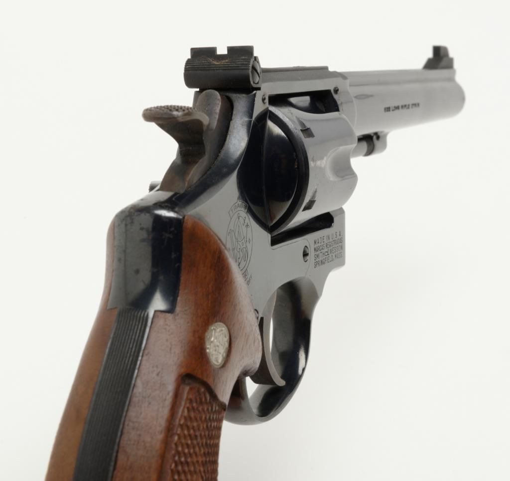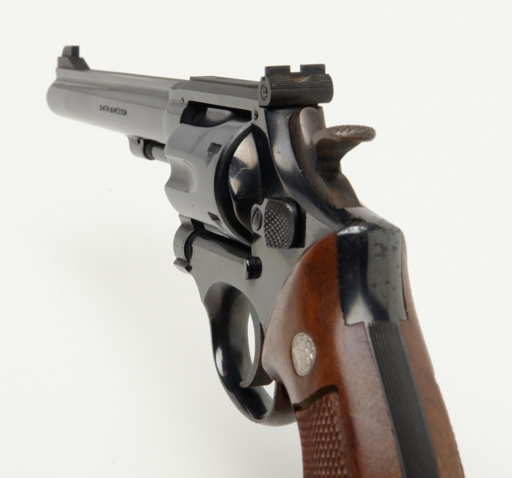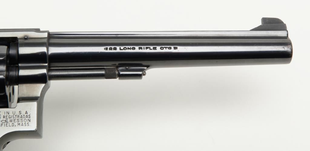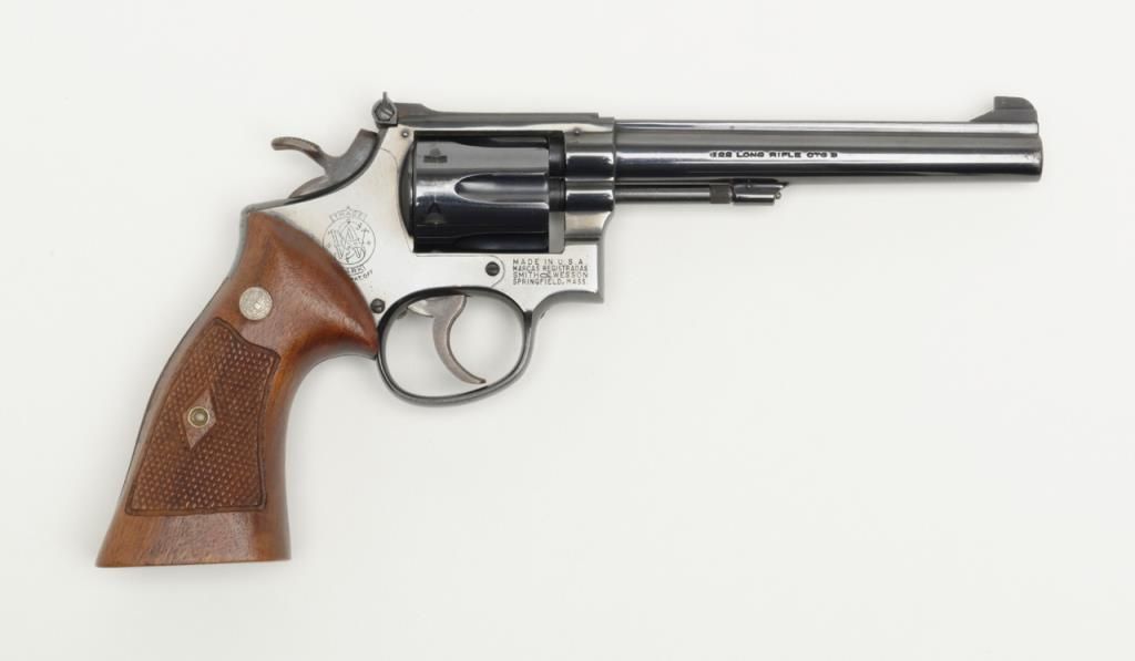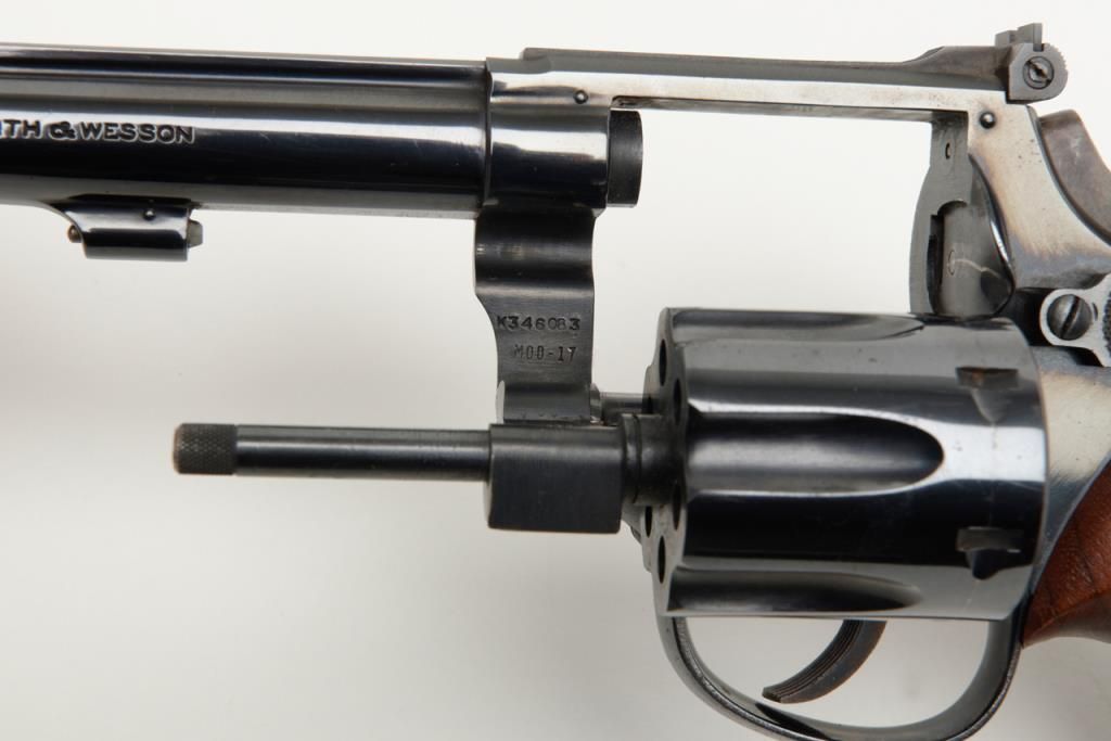 Smith and Wesson Model 17 revolver, cal. .22 LR, Serial # K346083. The pistol is in overall very good to near fine condition. The pistols retains nearly all of its blued finish with slight muzzle wear on the pinned, 6" barrel. The checkered wood medallion grips are in very good condition as well showing small marks consistent with use. The action is tight, markings sharp and the rear sight is adjustable. The trigger and hammer show significant case color, while the bore is verygood and may clean. A nice Model 17 that has seen little use. (Modern/PPT). Est.: $350-$700.
