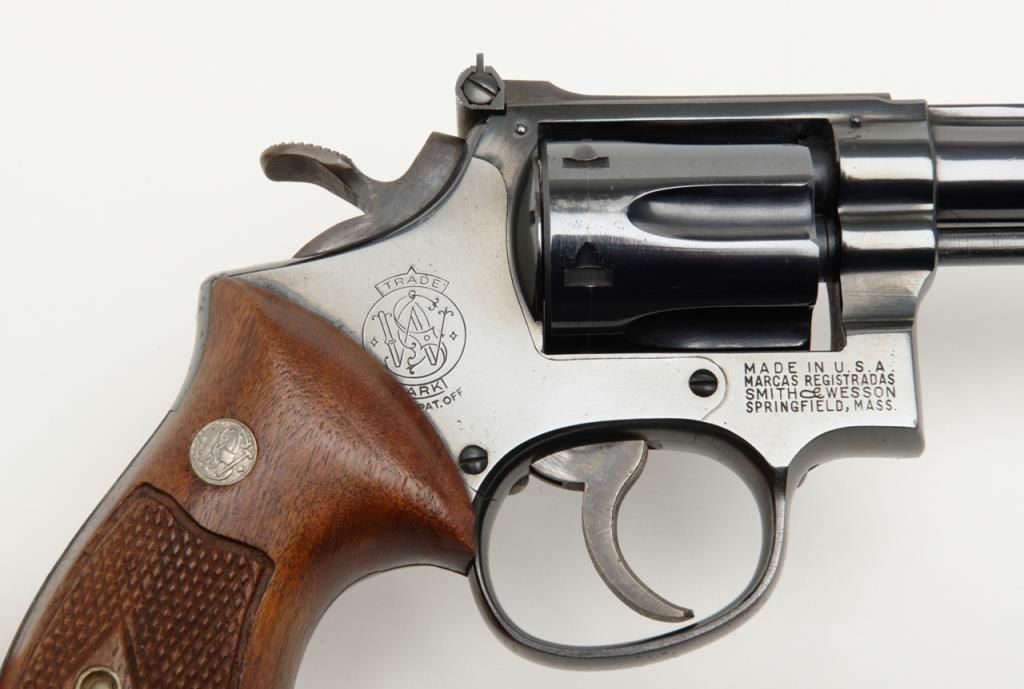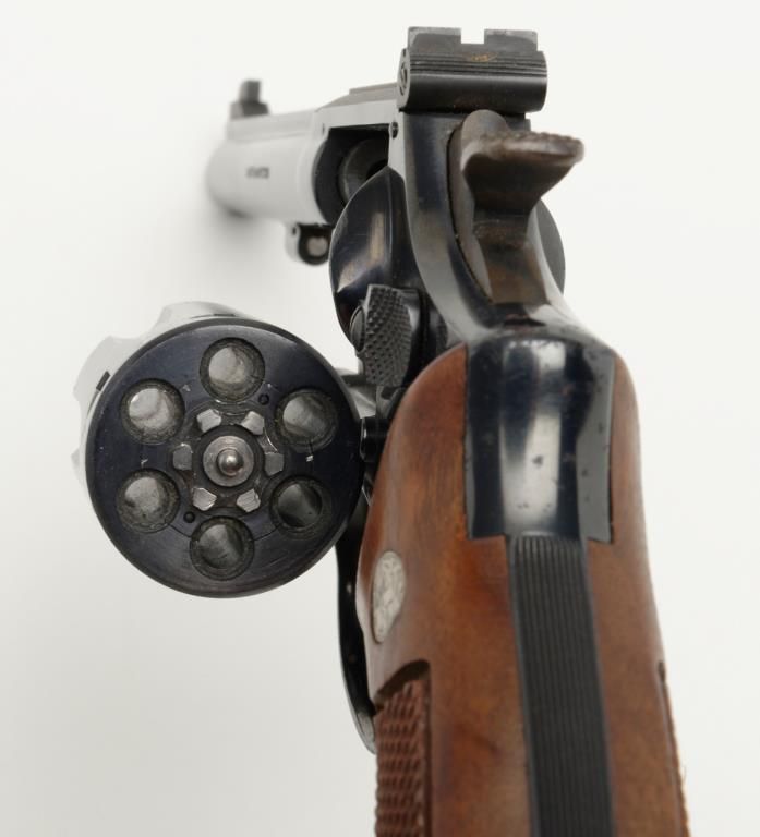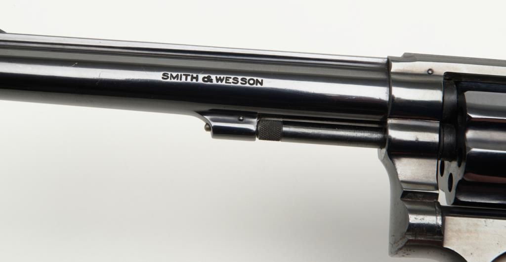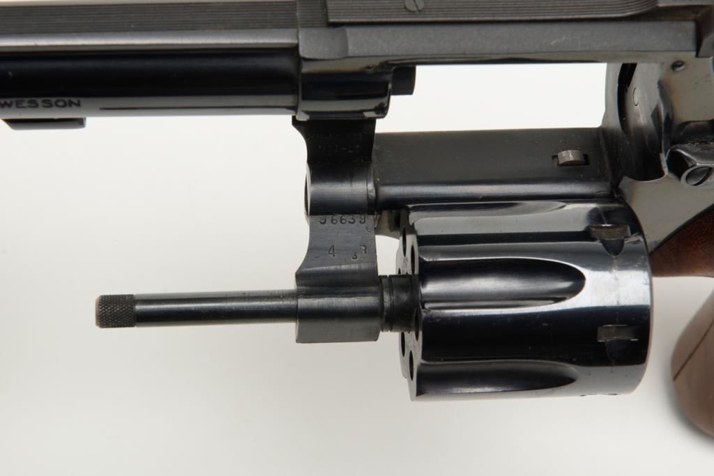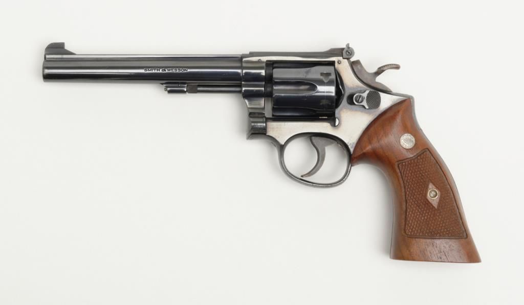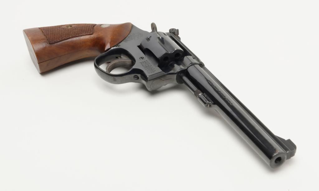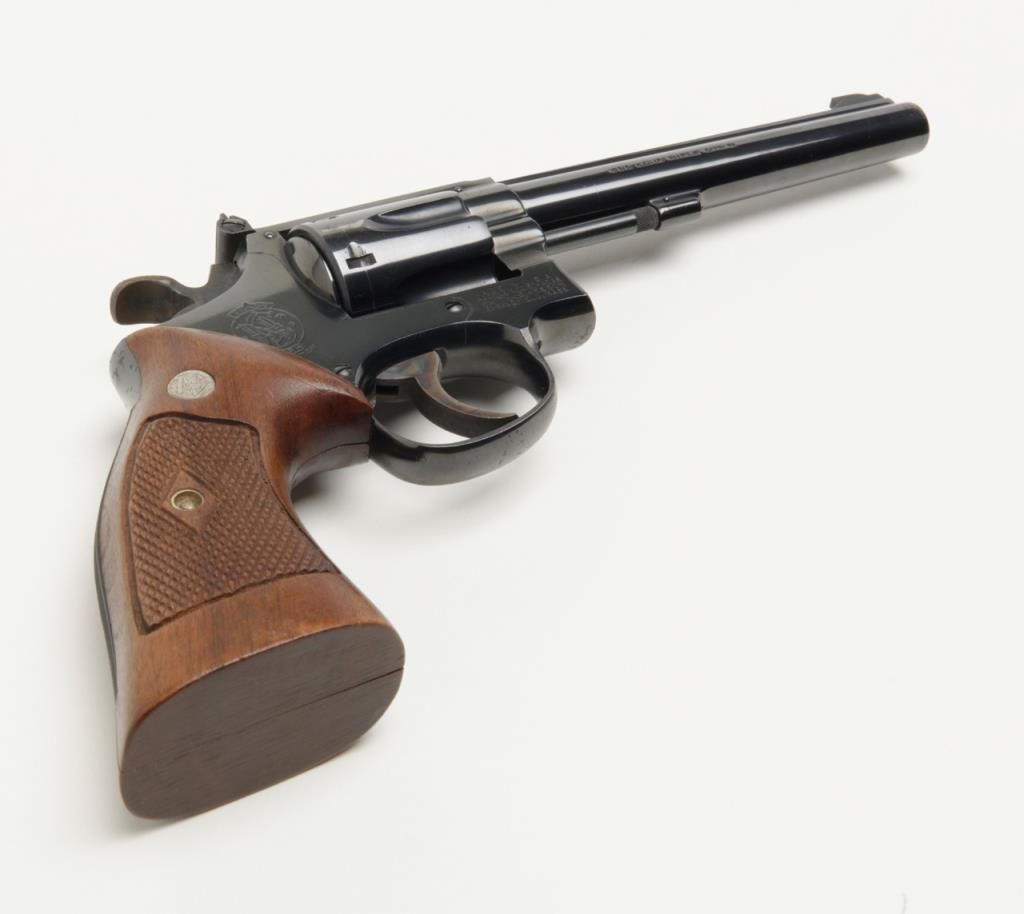 Smith and Wesson Model 17 revolver, cal. .22 LR, Serial # K346083. The pistol is in overall very good to near fine condition. The pistols retains nearly all of its blued finish with slight muzzle wear on the pinned, 6" barrel. The checkered wood medallion grips are in very good condition as well showing small marks consistent with use. The action is tight, markings sharp and the rear sight is adjustable. The trigger and hammer show significant case color, while the bore is verygood and may clean. A nice Model 17 that has seen little use. (Modern/PPT). Est.: $350-$700.