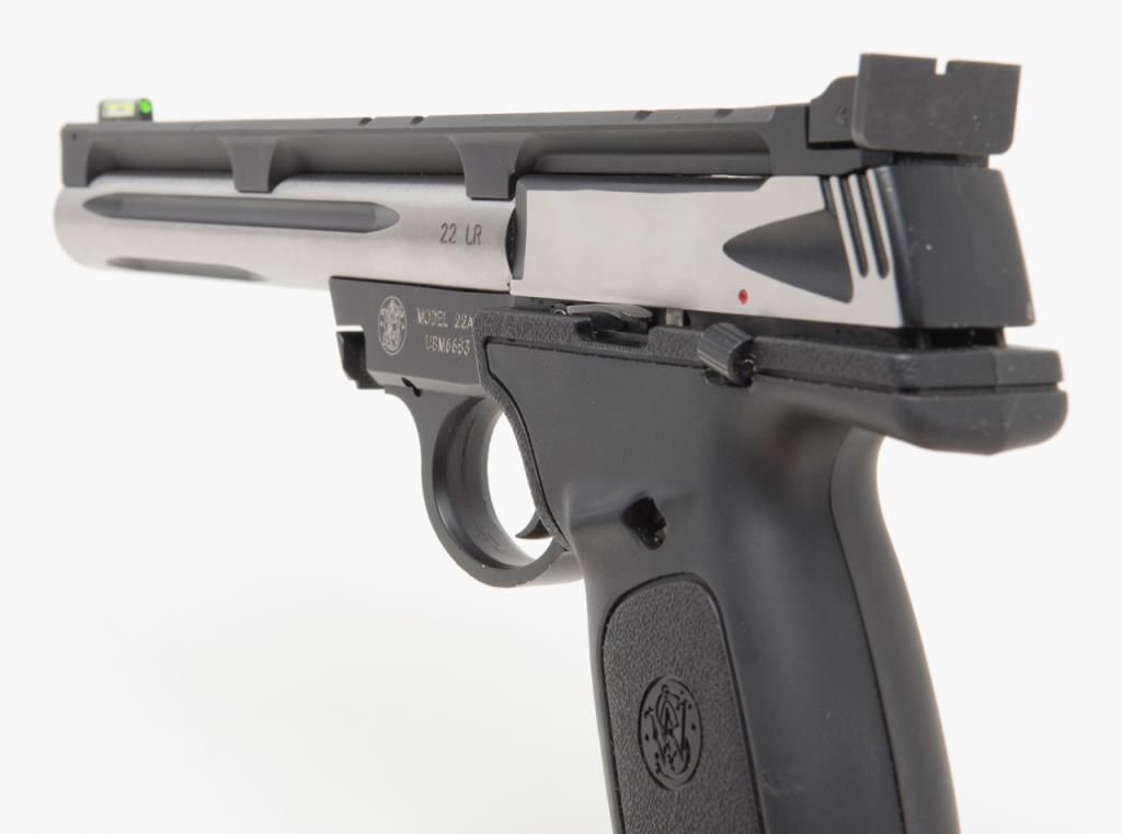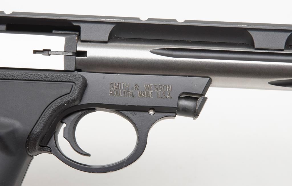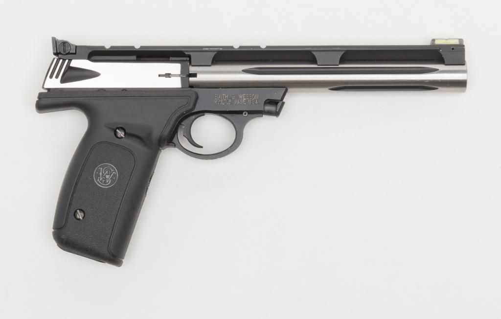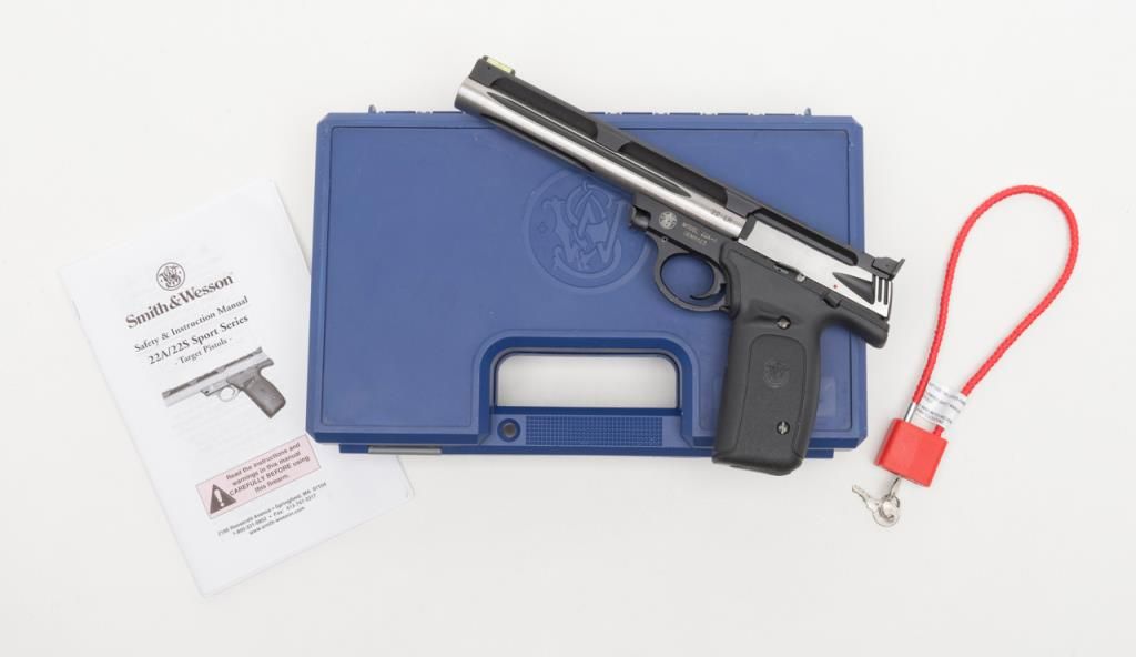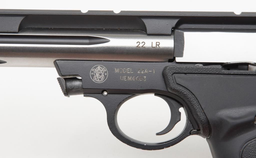 Smith and Wesson Model 22A-1 semi-automatic pistol, cal. .22 Long Rifle, Serial #UBM6683. The pistol is as new in box, with a 7” barrel complete with an integral Weaver style optics mount and adjustable sights. The pistol comes inthe S&W blue plastic hard case with trigger lock. The pistol shows little use with hard rubber grips, black and stainless finish and matching magazine. A great target .22 that is essentially brand new. (Modern). Est.: $250-$500.