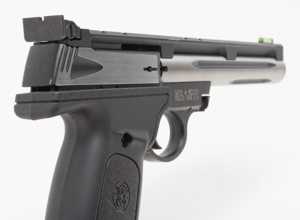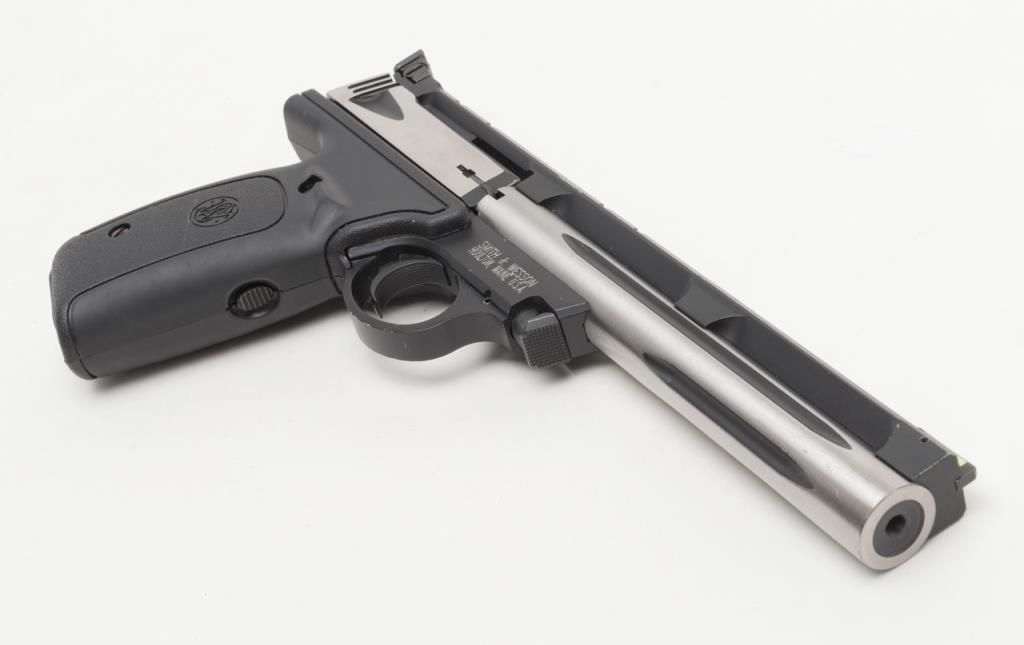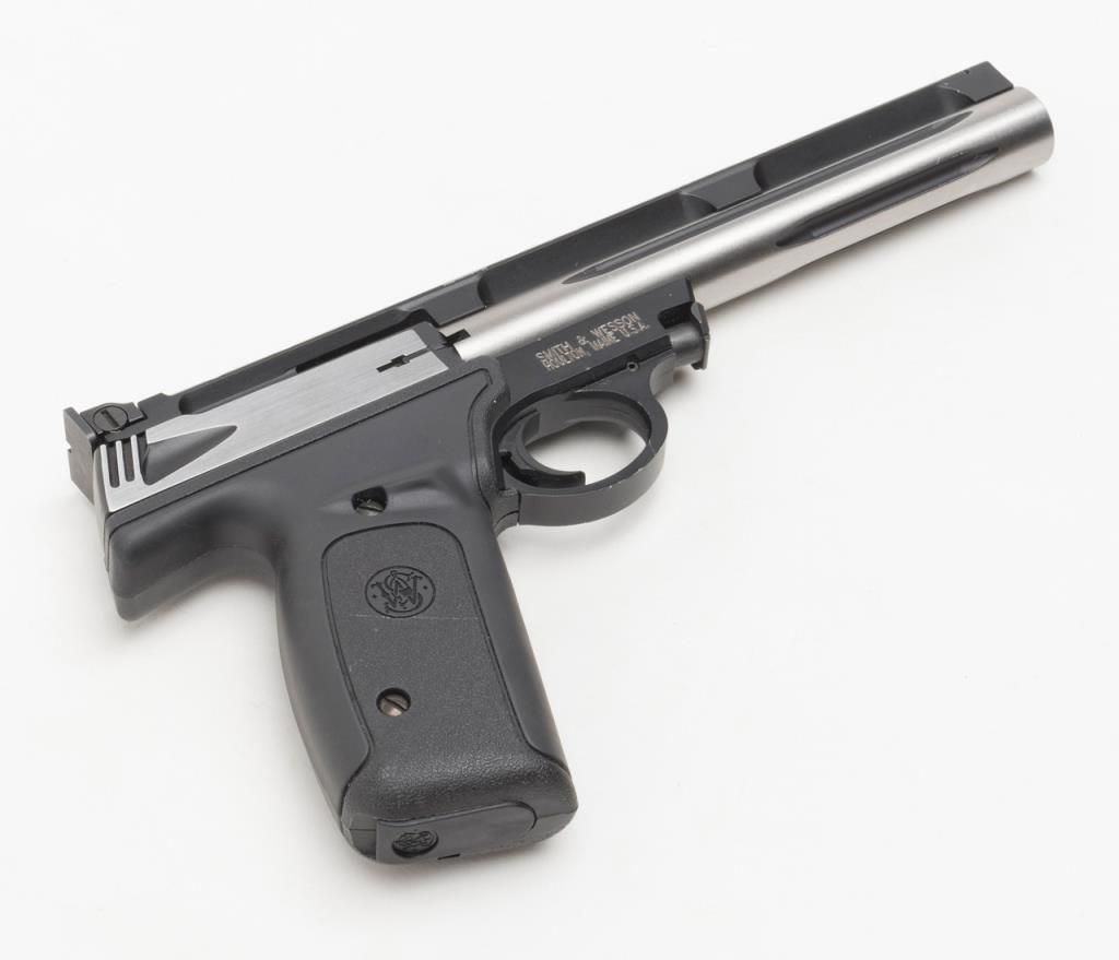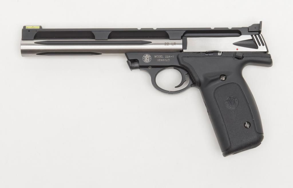 Smith and Wesson Model 22A-1 semi-automatic pistol, cal. .22 Long Rifle, Serial #UBM6683. The pistol is as new in box, with a 7” barrel complete with an integral Weaver style optics mount and adjustable sights. The pistol comes inthe S&W blue plastic hard case with trigger lock. The pistol shows little use with hard rubber grips, black and stainless finish and matching magazine. A great target .22 that is essentially brand new. (Modern). Est.: $250-$500.