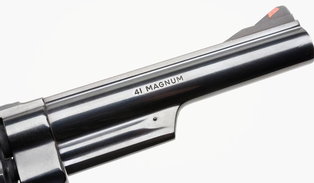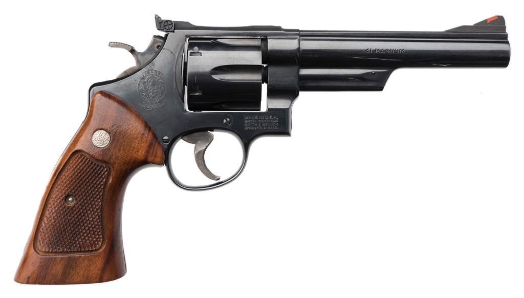 * Smith and Wesson Model 57 revolver, .41 Magnum cal., serial #N902051. The pistol is in excellent overall condition with a 6” barrel with a red insert ramp front and adjustable rear sights. The pistol shows little, if any use, retaining nearly all of its blued finish with the cylinder showing a faint drag line. The hammer and trigger show significant case coloring still present. The checkered gold medallion wood grips are in excellent condition with sharp checkering and a small scrape at the bottom of the left grip. The bore is excellent, the action crisp and markings are sharp on this highly desirable Model 57. Est.: $500-$1,000.