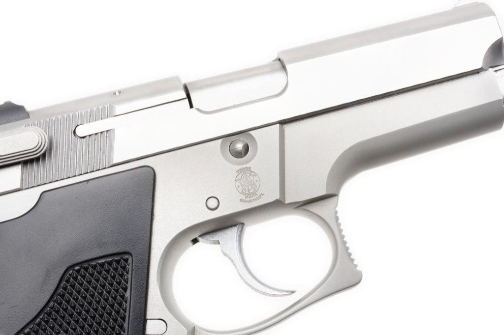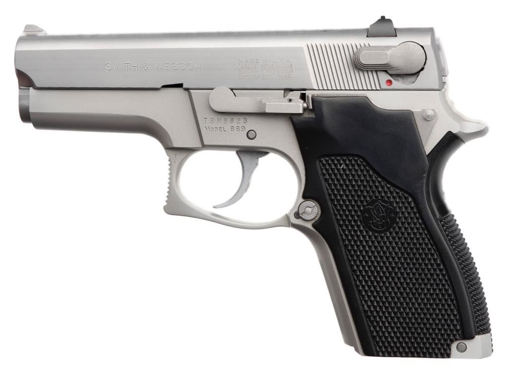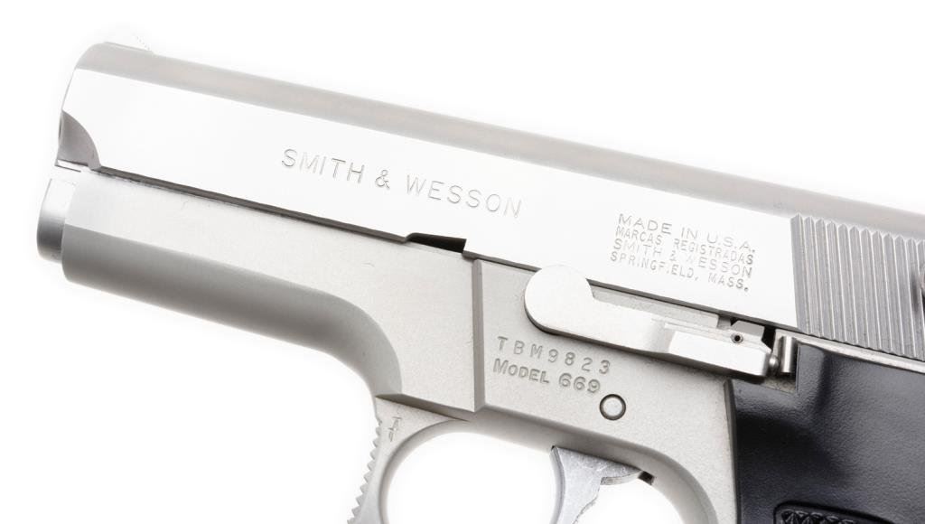 *Smith and Wesson Model 669 semi-automatic pistol, 9mm cal., serial #TBM982. The pistol is in overall very good condition with a 3 ½” barrel sporting a ramp front and fixed rear sights. The pistol retains nearly all of its matte stainless finish and shows only wear at the muzzle and slide. The checkered plastic Smith and Wesson marked grips are in very good condition as well showing only slight wear. The bore is very good, the action is crisp and the markings sharp on this pistol. Est.: $350-$700.