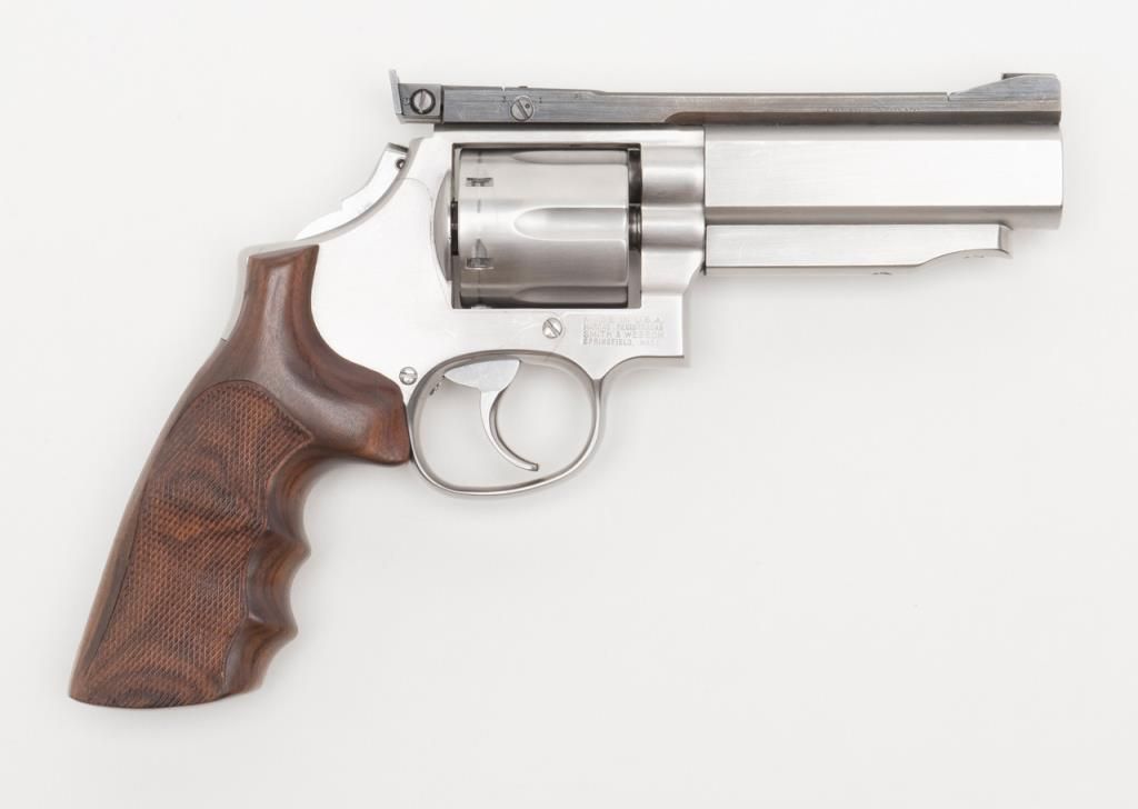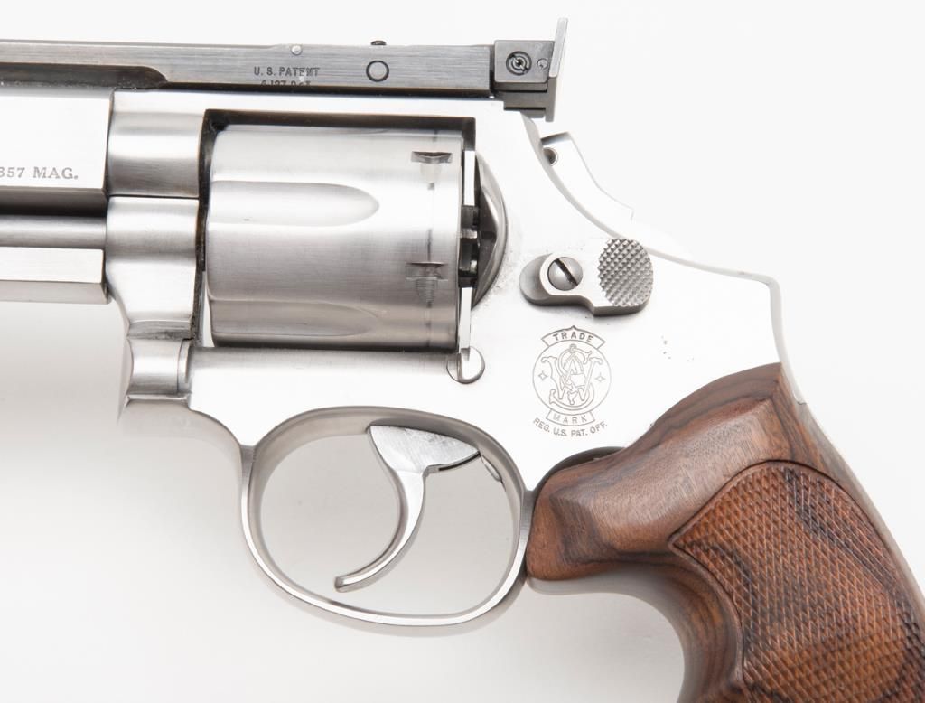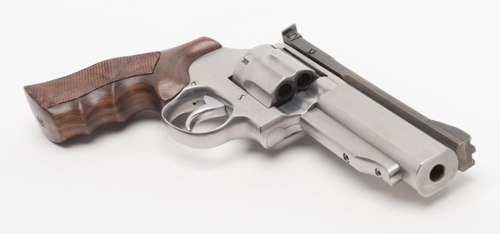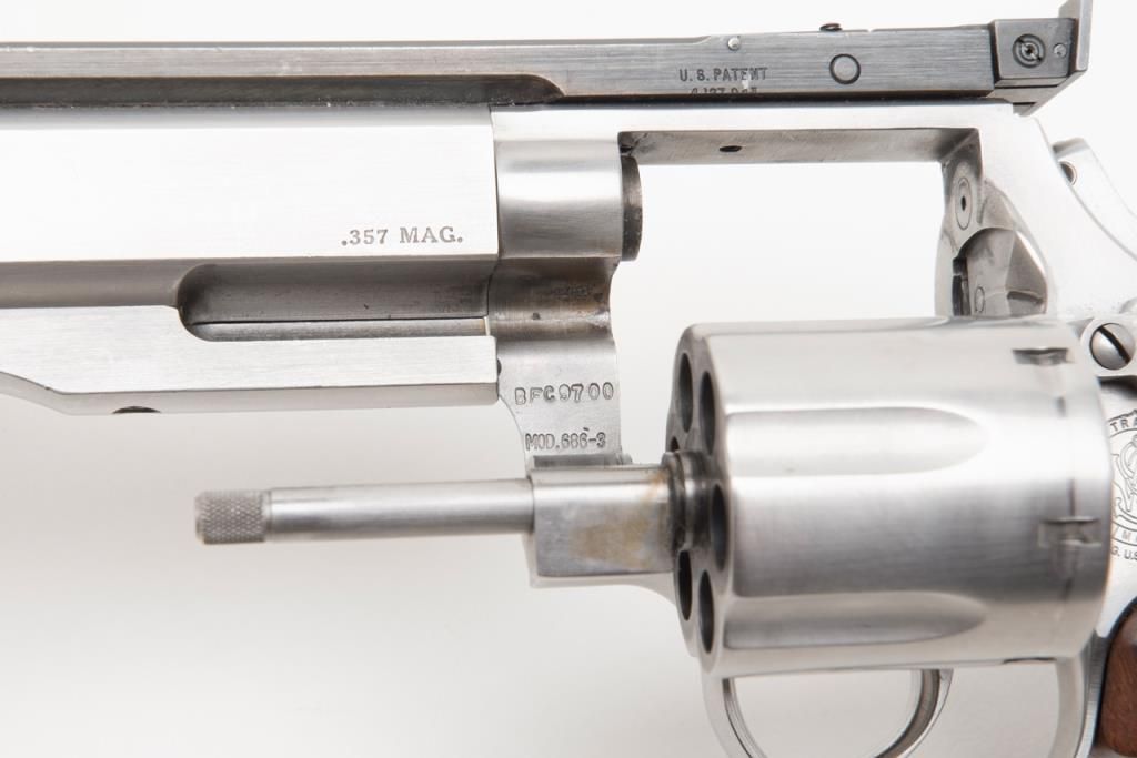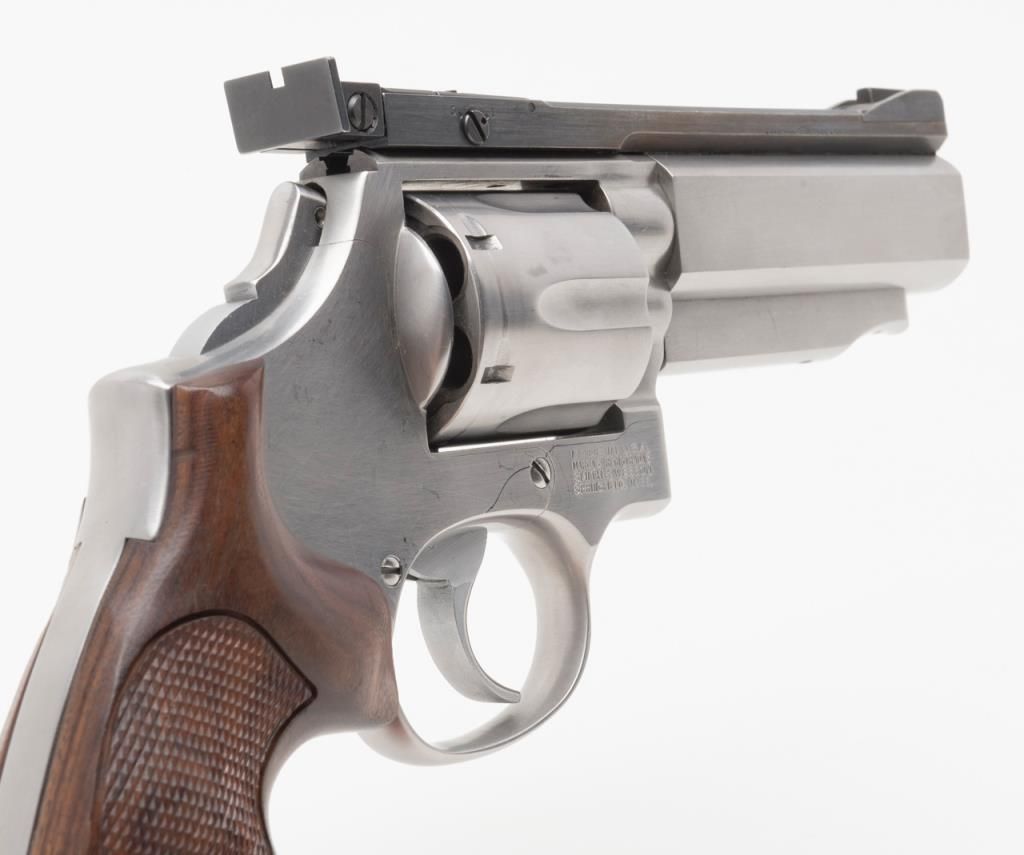 Smith and Wesson Model 686 Custom revolver, .357 Magnum caliber, Serial #BFC9700. The pistol is in overall very good condition with a flat sided, 4” barrel. The pistol retains nearly all of its stainless finish. The pistol features adjustablefull length target sights, bobbed hammer and tuned action. The custom checkered wood grips are in overall fine condition showing only small mars consistent with storage. The bore is very good, action smooth and markings sharp on this customtarget pistol. (Modern/PPT). Est.: $400-$800.