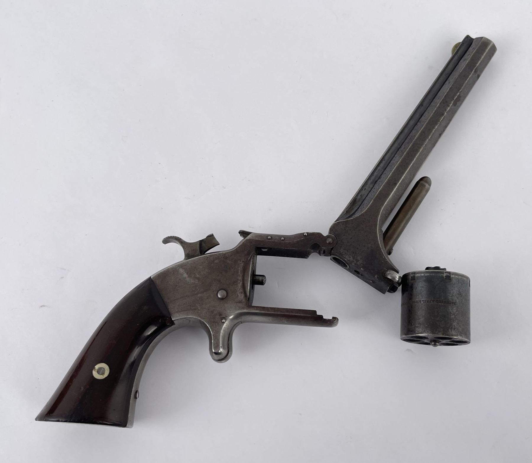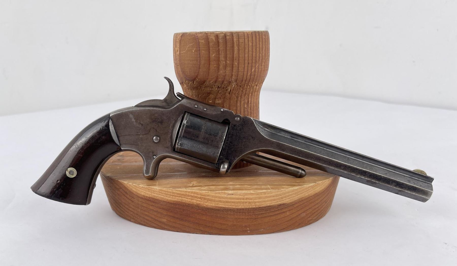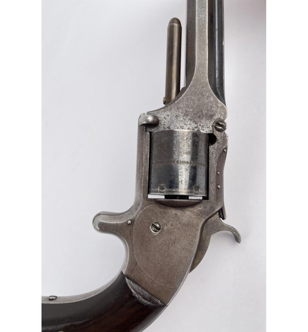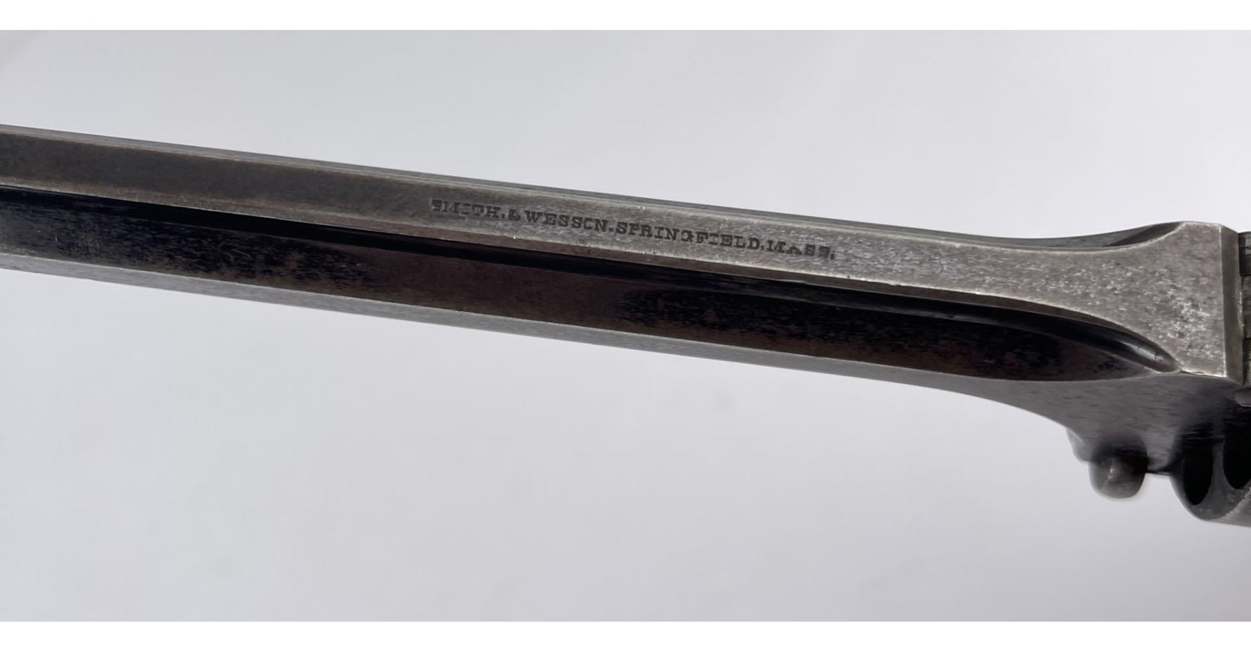 #43187 6 shot Non-Fluted cylinder. Tip-Up Revolver, top of 6" octagon barrel stamped "Smith & Wesson Springfield, Mass.” Cylinder stamped “Patented April 6, 1885 – July 5, 1859 & Dec. 13, 1860. Wood grips appear original and in good condition. At the beginning of the Civil War this revolver was the only weapon able to fire self- contained cartridges and could be easily carried as a backup by soldiers. Manufactured between 1861 – 1874 Rare and Scarce. Action in working order, firearm was not abused. Purchased from Darrel Emmett, an old time gun dealer from Glendive, Montana. Does not require FFL Transfer.