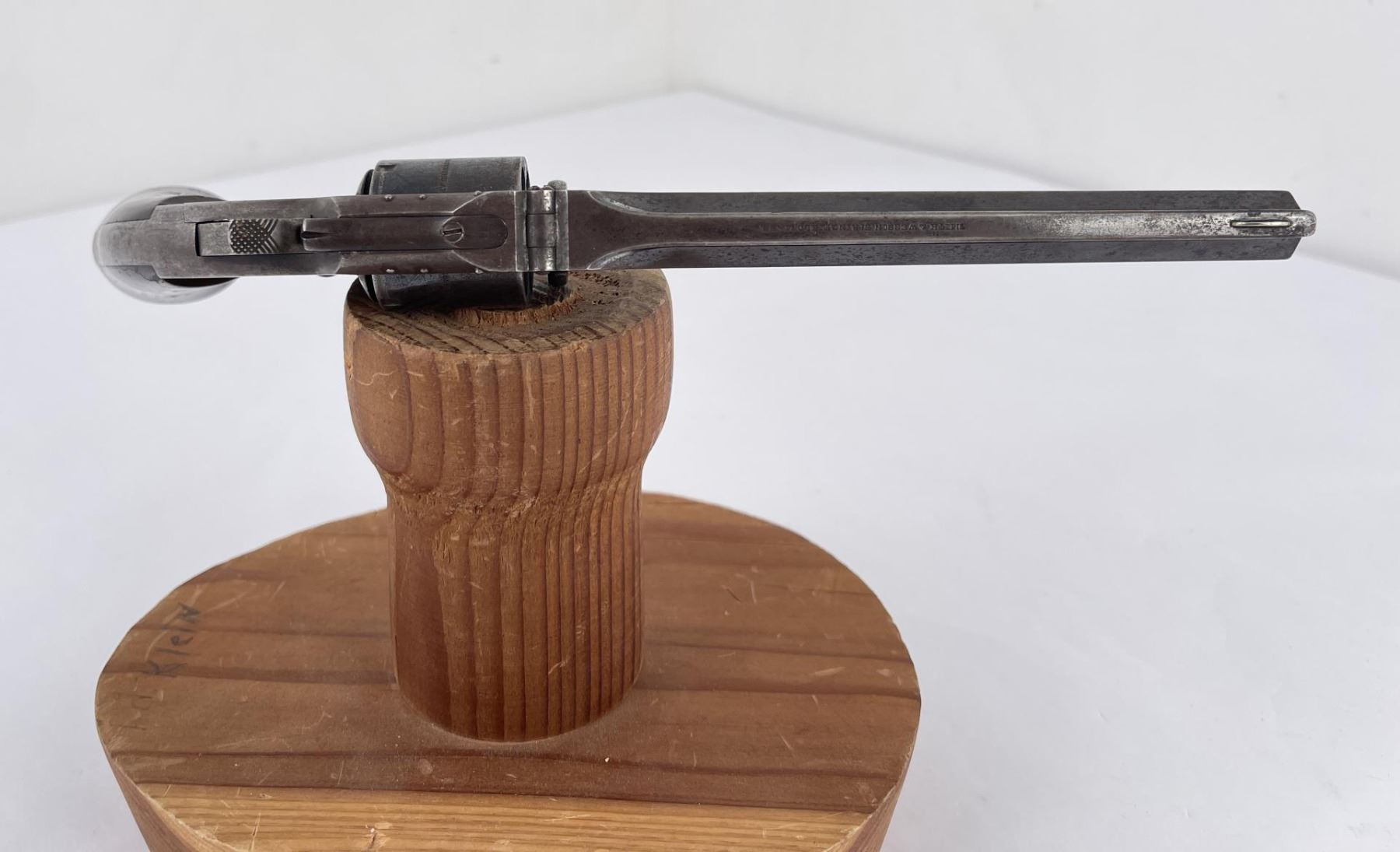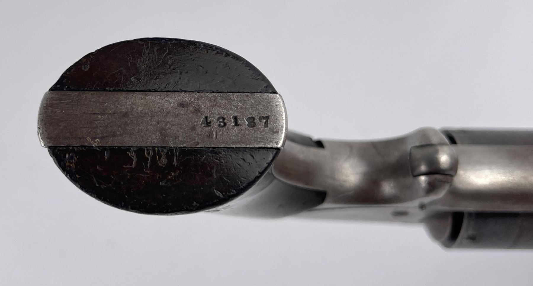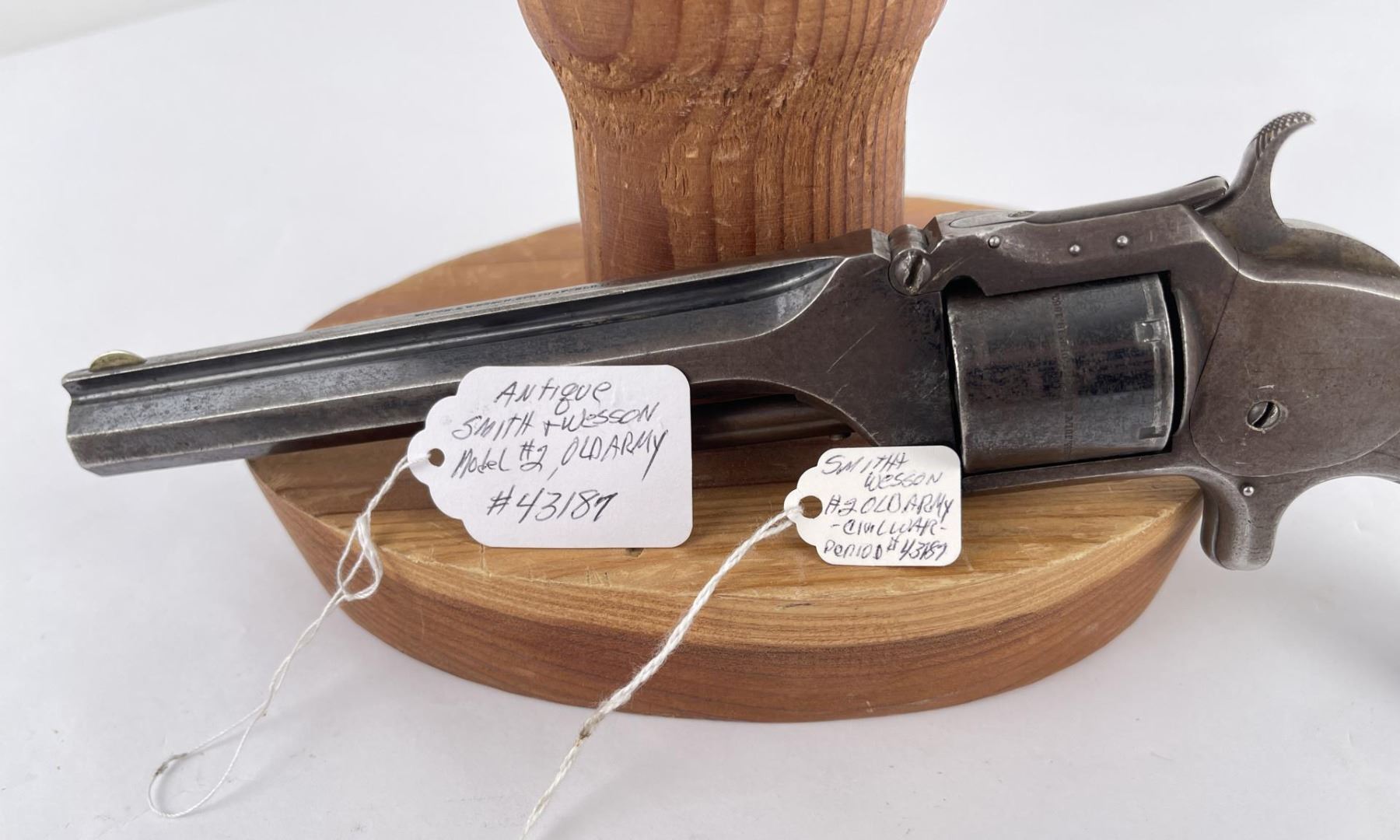 #43187 6 shot Non-Fluted cylinder. Tip-Up Revolver, top of 6" octagon barrel stamped "Smith & Wesson Springfield, Mass.” Cylinder stamped “Patented April 6, 1885 – July 5, 1859 & Dec. 13, 1860. Wood grips appear original and in good condition. At the beginning of the Civil War this revolver was the only weapon able to fire self- contained cartridges and could be easily carried as a backup by soldiers. Manufactured between 1861 – 1874 Rare and Scarce. Action in working order, firearm was not abused. Purchased from Darrel Emmett, an old time gun dealer from Glendive, Montana. Does not require FFL Transfer.