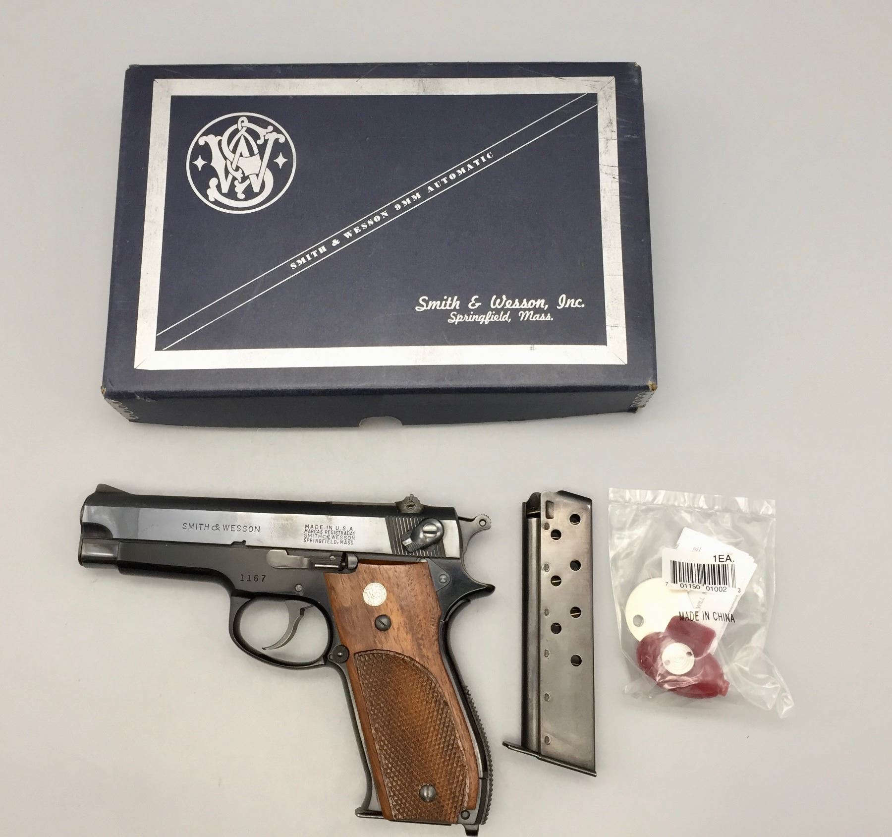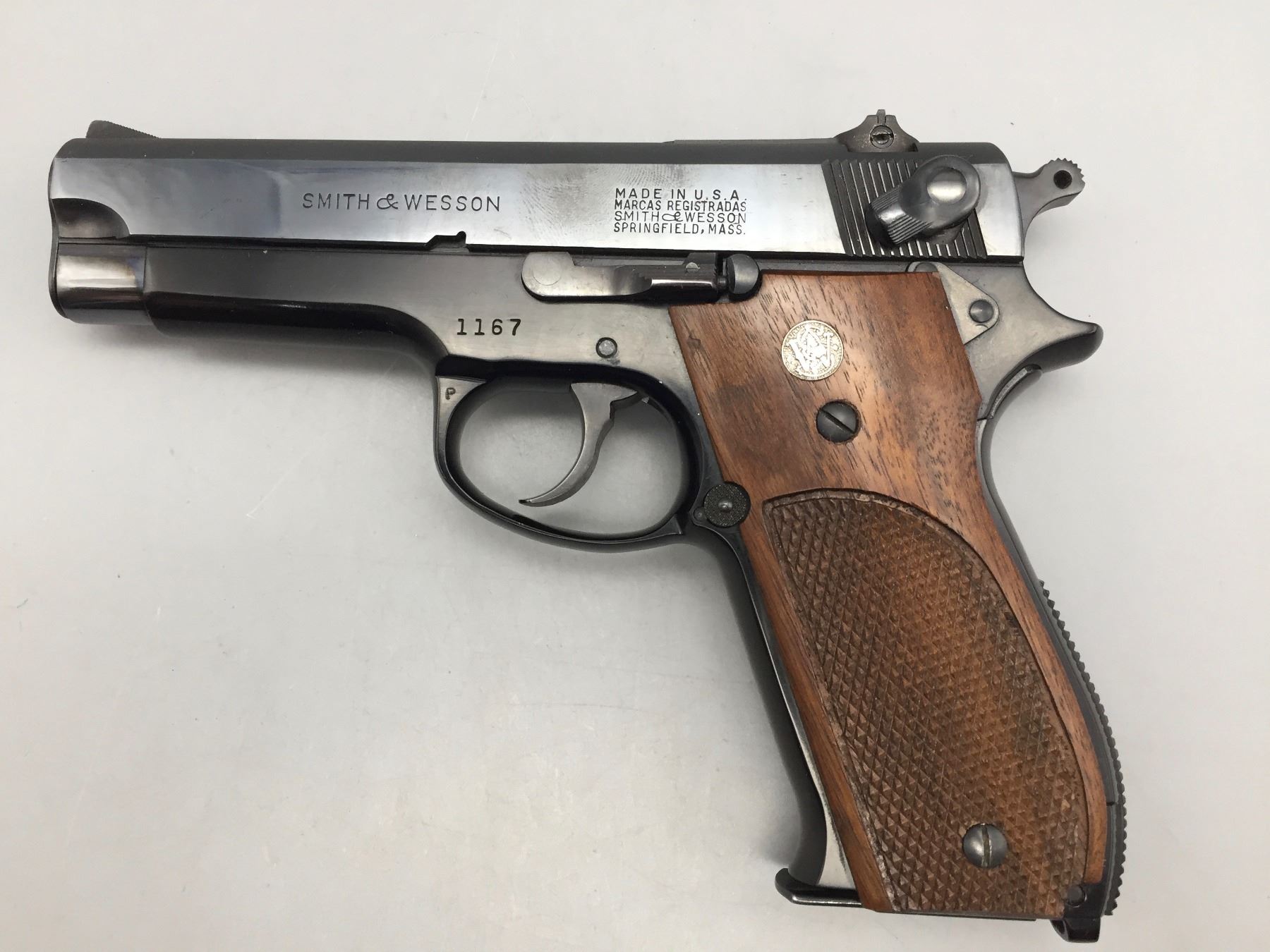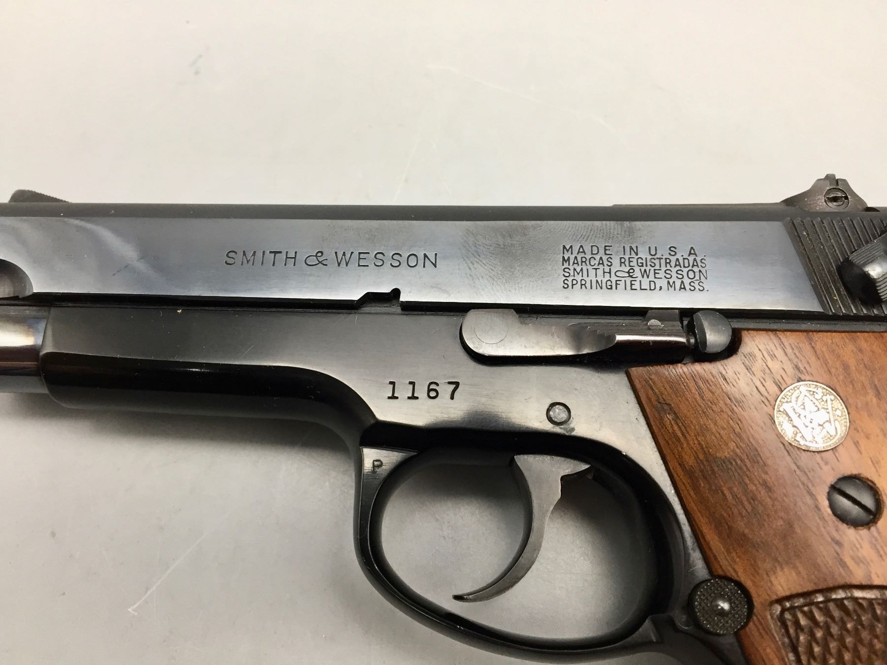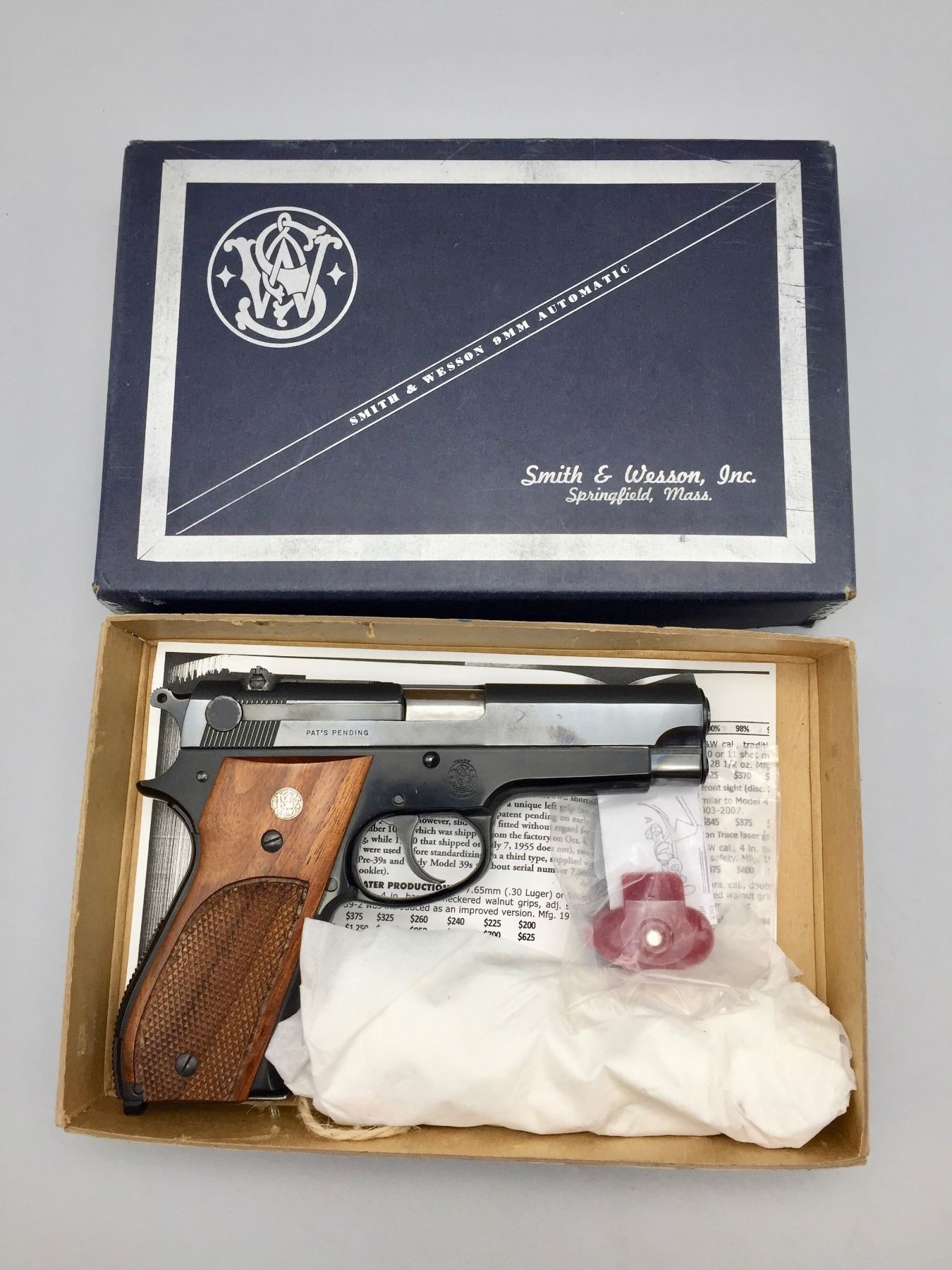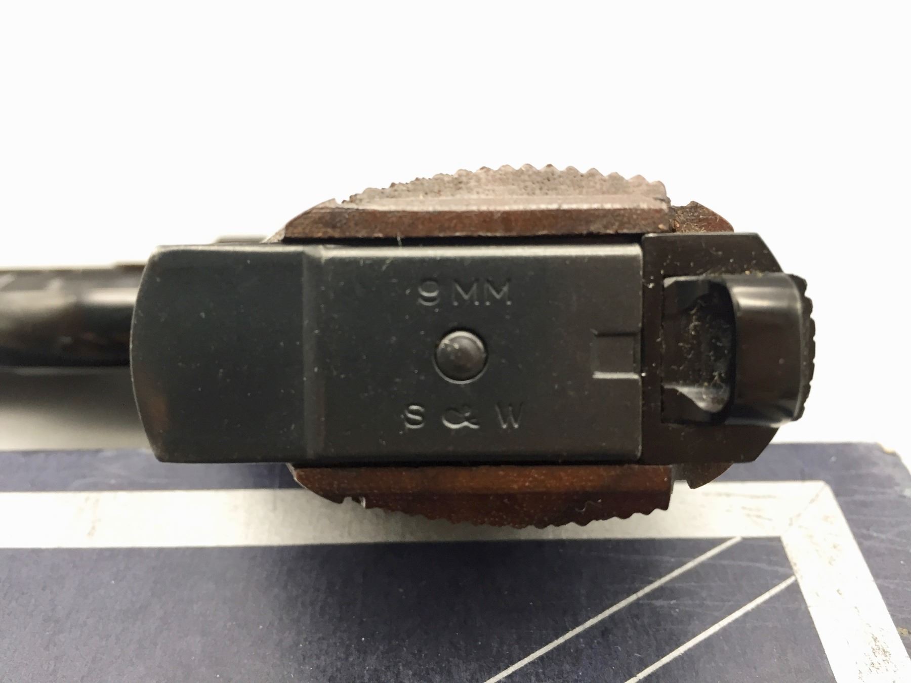 Description: Presented for your consideration is this, apparently unfired, like new, Smith and Wesson Model Pre-39. This pistol has a blued finish with checkered walnut grips. Serial # is 1167, which falls well within the range of 1001-2600 which are considered to be the early mfg., “pre-39s”. This pistol also comes with a second clip and original box. Chambered in 9MM. Maker: Smith and Wesson, Springfield, Mass. Approx. Age: Circa 1955. Size: 4” barrel. 9mm. Condition: Very good for its age, minor wear expected. Please look closely at the pictures - they are an important part of our description. Shipping: There will be a $10 handling / packaging fee for shipping this lot. The actual cost of postage will be added on top of that. *****This firearm requires an FFL Transfer*****