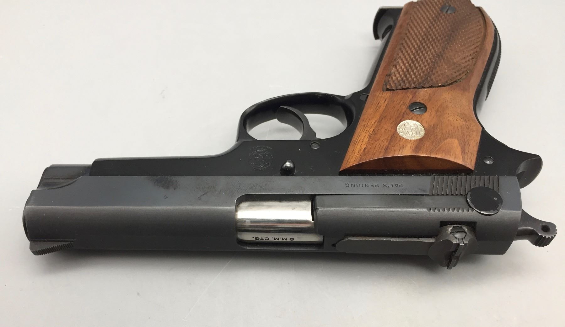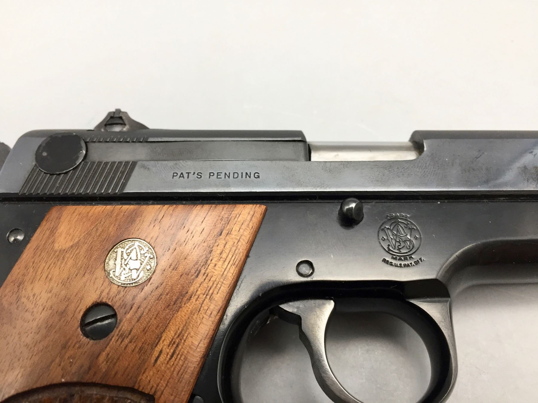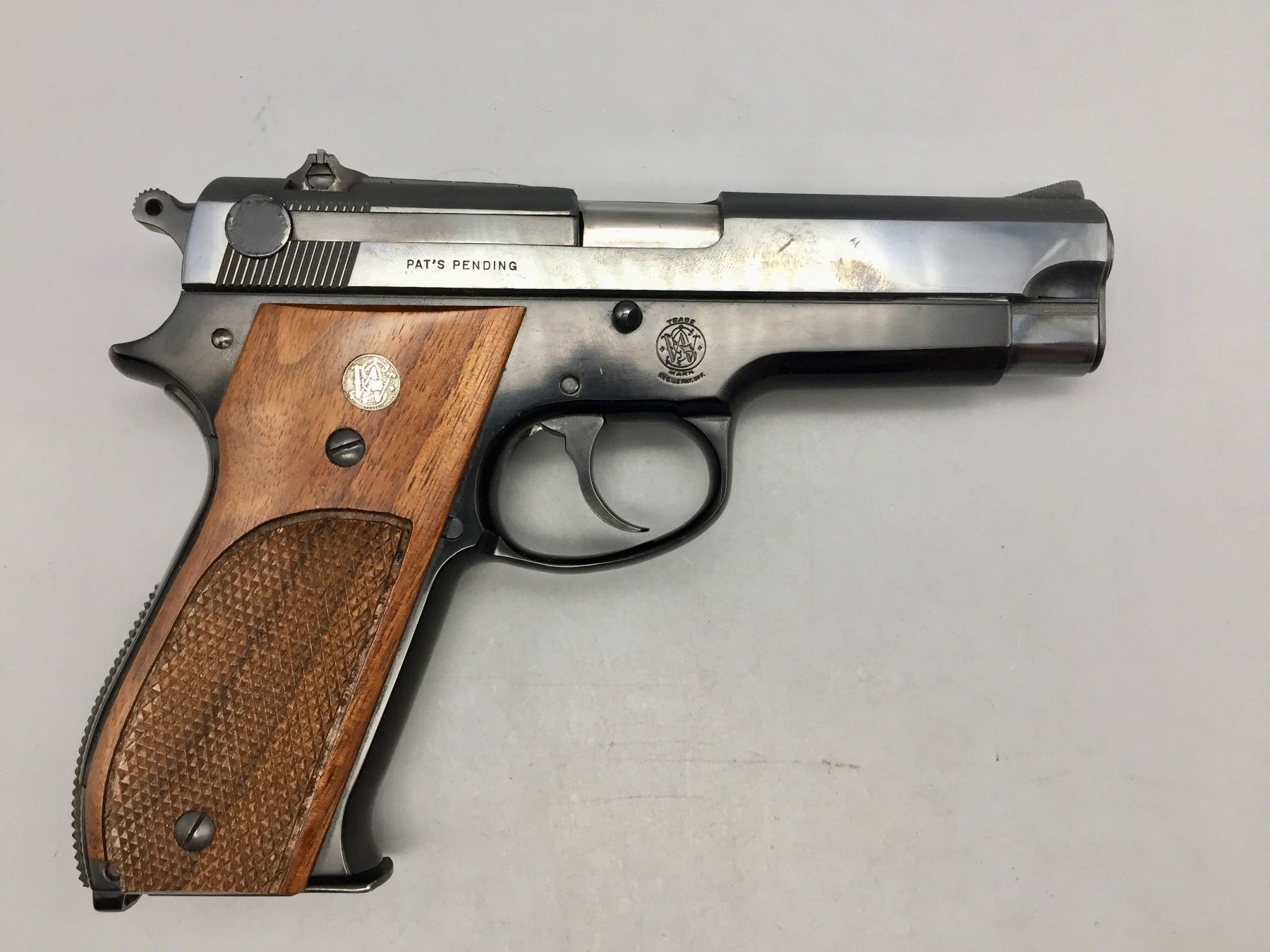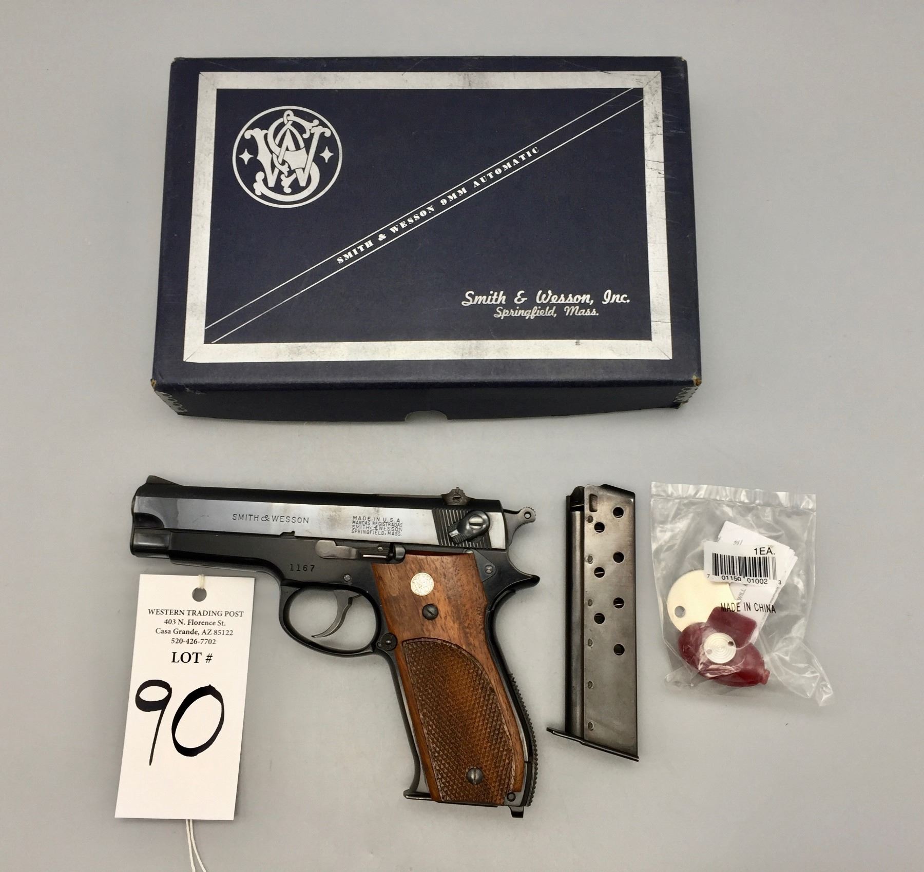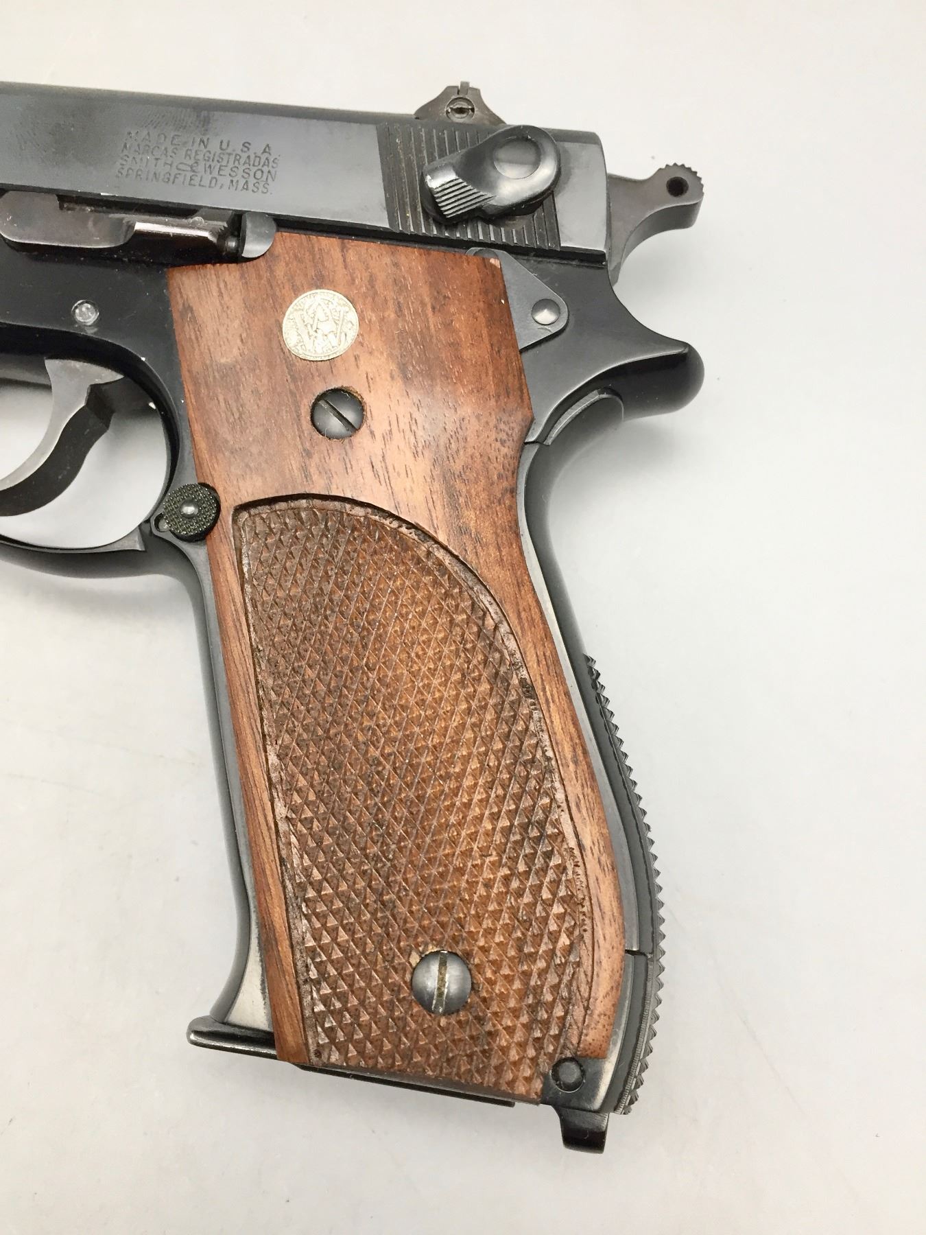 Description: Presented for your consideration is this, apparently unfired, like new, Smith and Wesson Model Pre-39. This pistol has a blued finish with checkered walnut grips. Serial # is 1167, which falls well within the range of 1001-2600 which are considered to be the early mfg., “pre-39s”. This pistol also comes with a second clip and original box. Chambered in 9MM. Maker: Smith and Wesson, Springfield, Mass. Approx. Age: Circa 1955. Size: 4” barrel. 9mm. Condition: Very good for its age, minor wear expected. Please look closely at the pictures - they are an important part of our description. Shipping: There will be a $10 handling / packaging fee for shipping this lot. The actual cost of postage will be added on top of that. *****This firearm requires an FFL Transfer*****