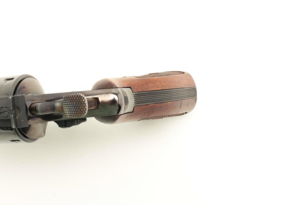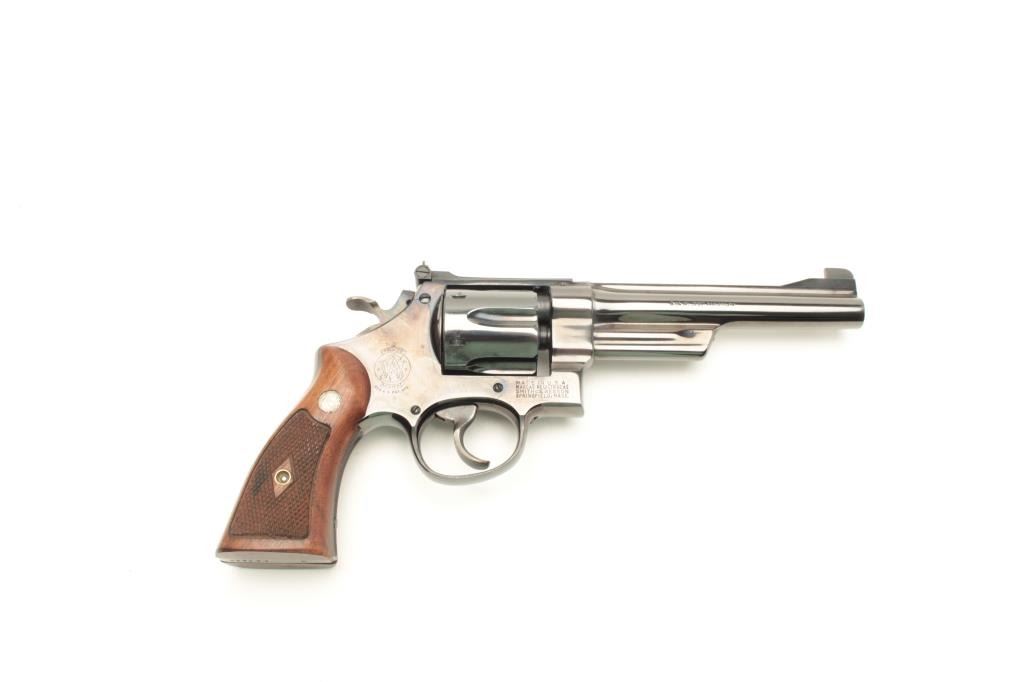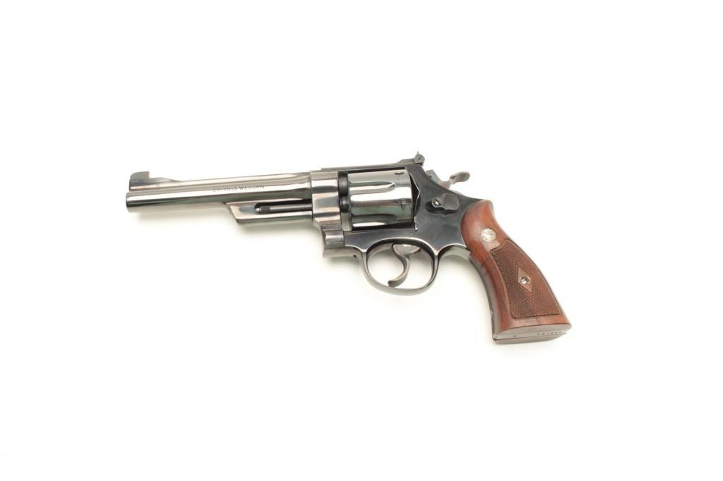 Smith and Wesson Pre-Model 27 Post-War revolver, .357 Magnum, Serial #S-162619. The pistol is in fine overall condition with a 6” barrel with ramp front and adjustable rear sights. The pistol retains approximately98% of its polished blue finish with only a faint drag line and light muzzle wear noted. The pistol features a five screw frame with vivid case color noted on the hammer and trigger. The hammer and trigger are bothtarget style. The checkered wood medallion grips are in very good condition showing small mars and handling wear. The bore is very good, the action crisp and markings are sharp. The pistol retains its matching goldS&W box with all associated packing material. The pistol includes a Smith and Wesson factory letter confirming all features and indicating that the pistol was shipped to the Olympic Wholesale Co., Los Angeles, CA, onMarch 8, 1956. From the estate of Larry Gaertner. Est.: $750-$1,500. (C+R)