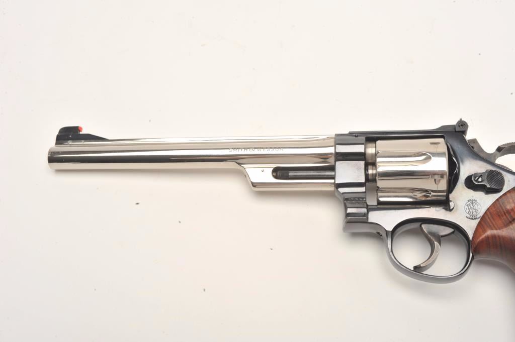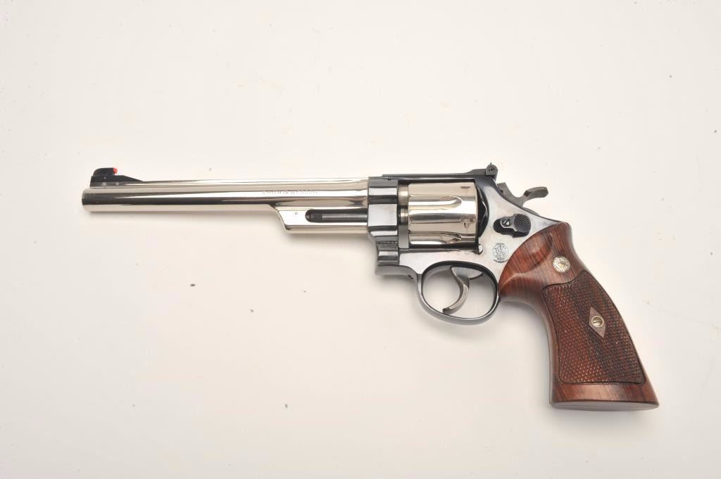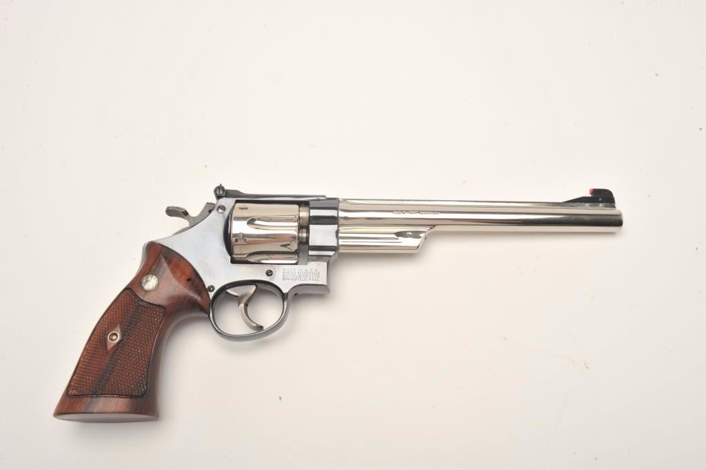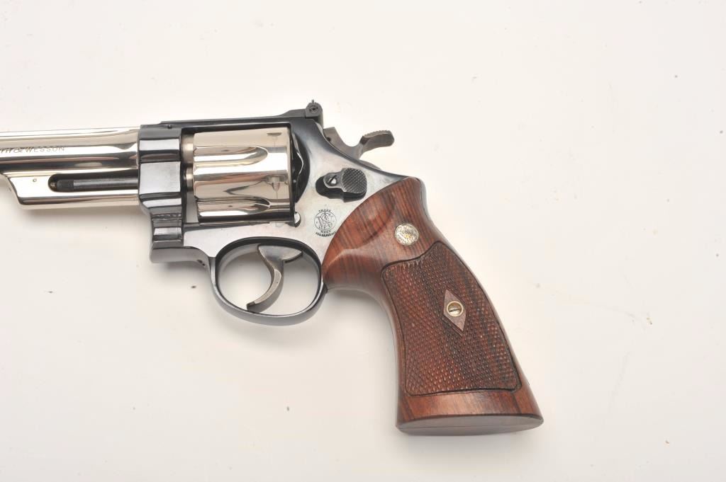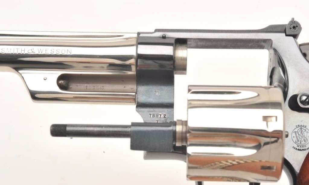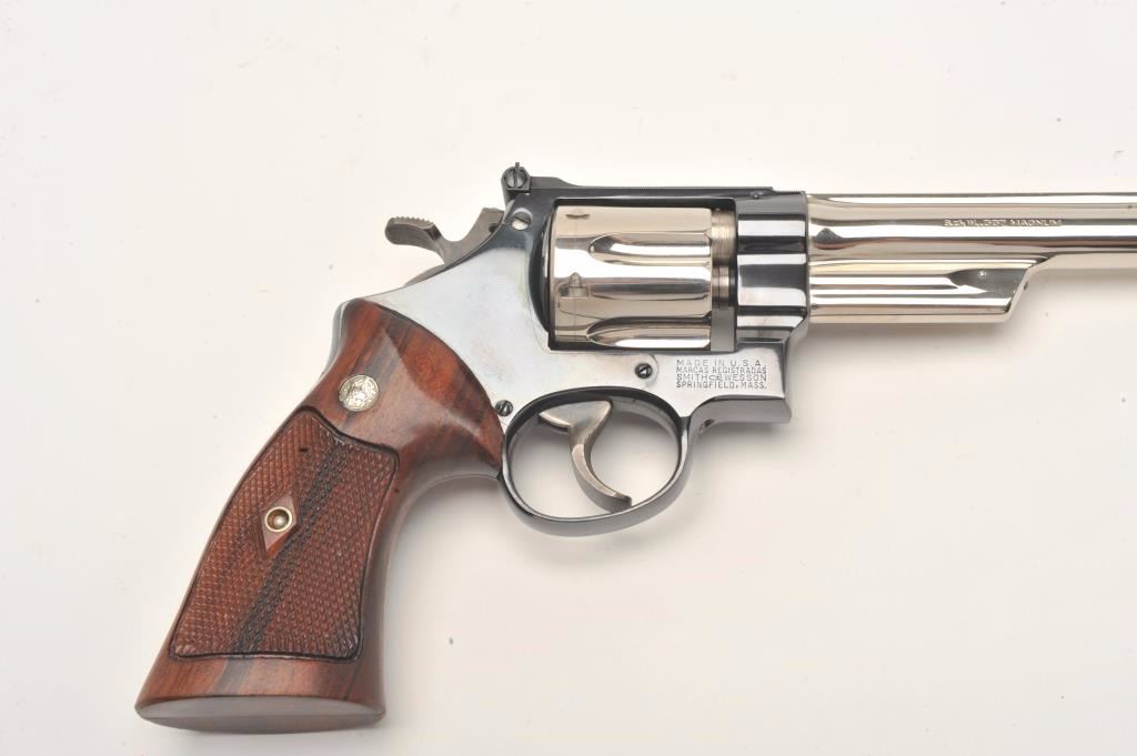 Smith and Wesson Pre-Model 27 revolver, .357 Magnum, Serial #S-163843. The pistol is in fine overall condition with an 8 ¾” barrel with a red ramp front and adjustable rear sights. The pistol retains nearly all of its two-tone finish with the barrel and cylinder in factory nickel and the frame blue. The pistol features beautiful, vivid case hardening on the hammer and trigger. The period custom checkered wood medallion grips are in nearly excellent condition showing little wear. The bore is very good, the action crisp and markings are sharp. The pistol includes a Smith and Wesson factory letter confirming all features and indicating that the pistol was shipped to Weed and Company, Rochester, New York on August 28, 1956. From the estate of Larry Gaertner. Est.: $1,250-$2,500. (C+R)
