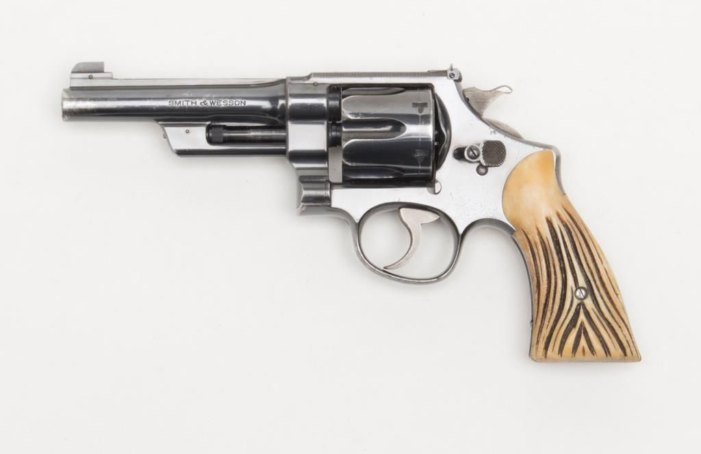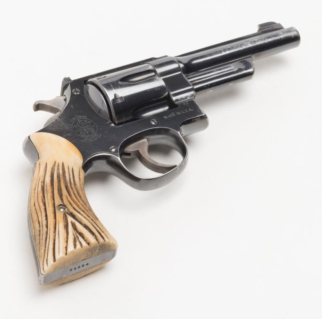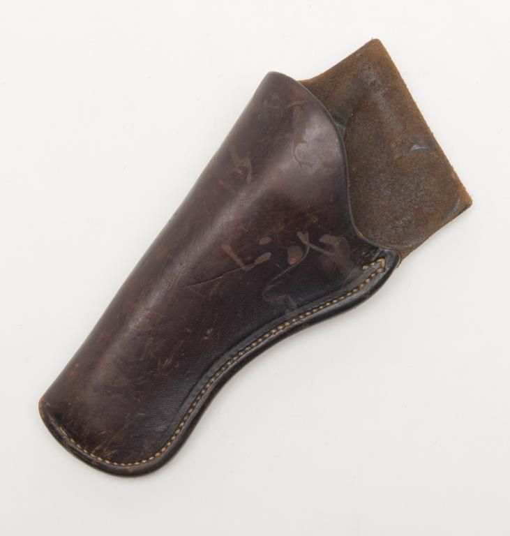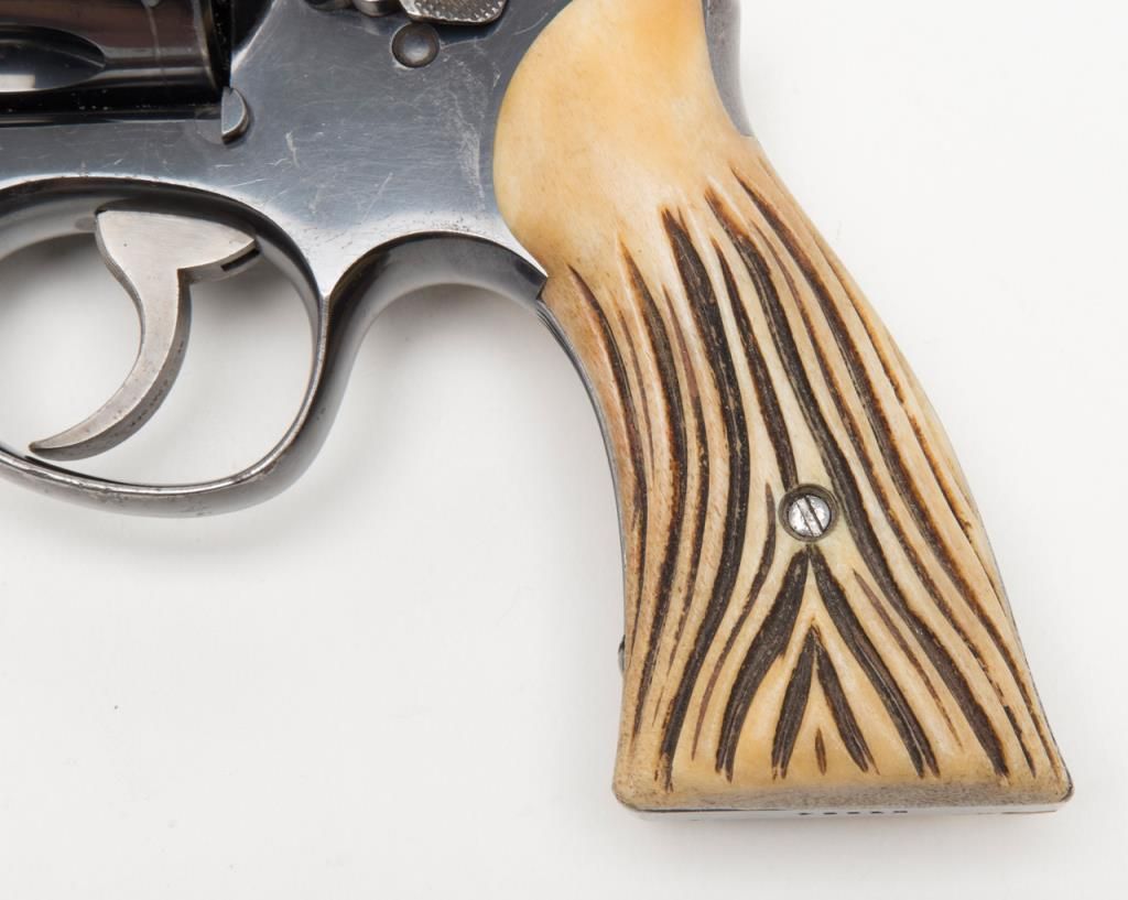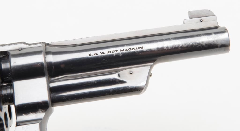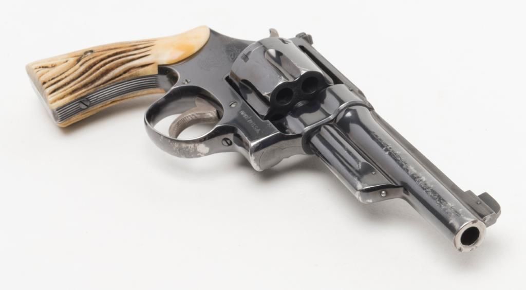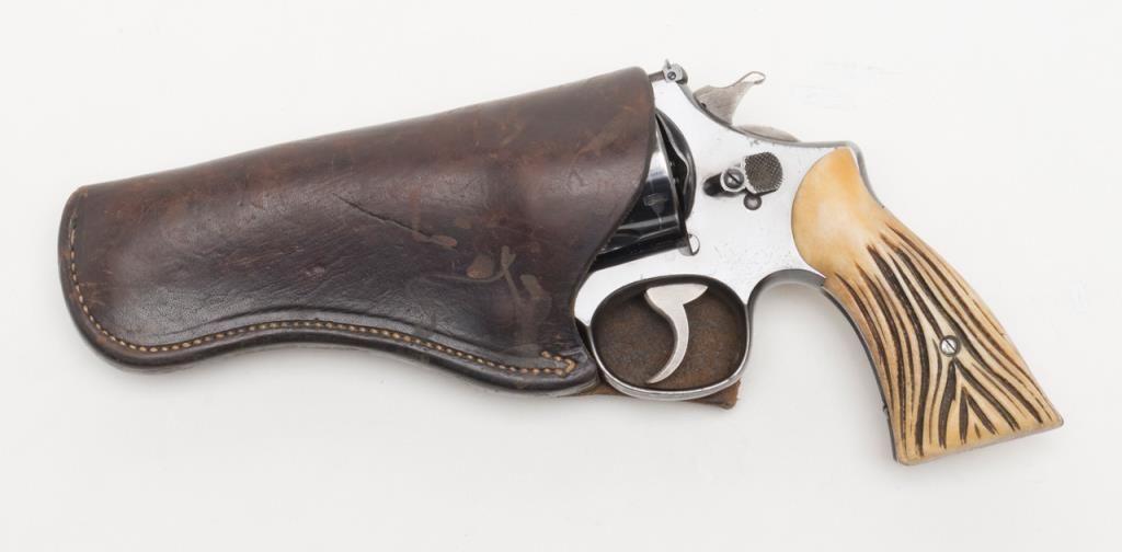 Smith and Wesson Registered Model .357 Magnum, Serial #51994. Manufactured in 1937, the pistol is in overall very good condition with a 5” barrel. The pistol retains 80-85% of its high polish blued finish, showing a loss of finish on both sides of the barrel consistent with holster wear. The pistol comes with an outstanding pair of stag grips, showing typical toning and wear. The bore is very good, action crisp and markings sharp. The pistol also comes with a left handed, El Paso marked period holster. The open top holster is in overall good condition. According to the consigner, the pistol was purportedly the duty weapon of a Texas lawman. Included, a factory letter dated August 29, 1997, indicating this revolver was shipped from the factory on September 9, 1937, and delivered to Momsen, Dunnegan & Ryan Co., El Paso, TX., shipped with a 5” barrel, equipped with a Call gold bead front sight, square notch rear sight, magna stocks and a blue finish. The handgun was sighted at 25 yards using magnum ammunition and a 6 o’clock hold. The consignor also wrote “I bought this gun with holster from one of your 1970’s auctions. This distinctive item with stag grips and left handed duty holster could be known to an old time Ranger”. (C+R). Est.: $1,500-$3,000.