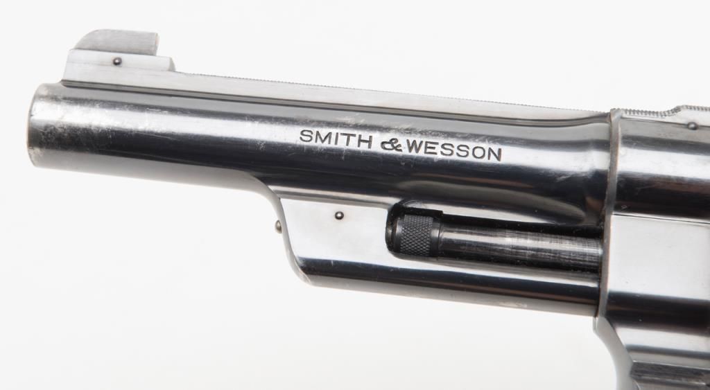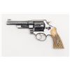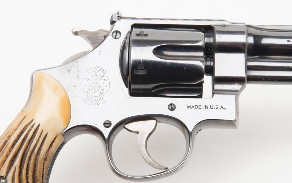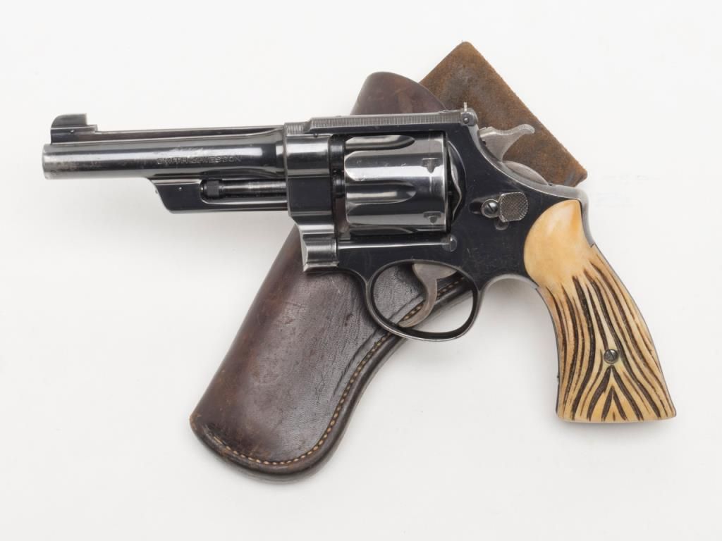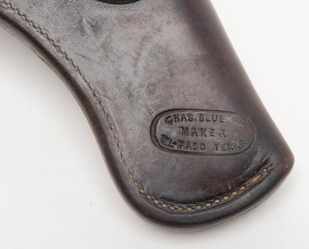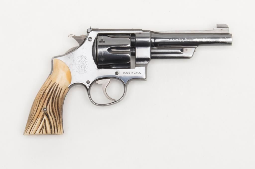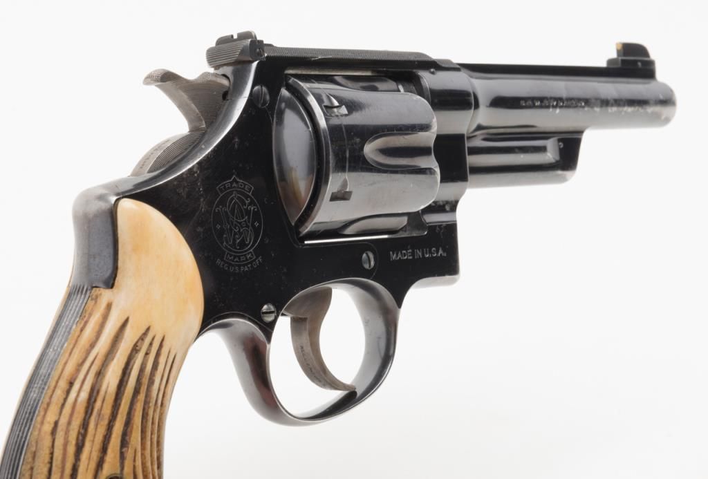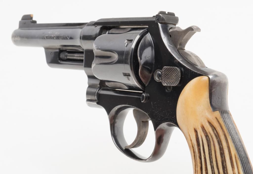 Smith and Wesson Registered Model .357 Magnum, Serial #51994. Manufactured in 1937, the pistol is in overall very good condition with a 5” barrel. The pistol retains 80-85% of its high polish blued finish, showing a loss of finish on both sides of the barrel consistent with holster wear. The pistol comes with an outstanding pair of stag grips, showing typical toning and wear. The bore is very good, action crisp and markings sharp. The pistol also comes with a left handed, El Paso marked period holster. The open top holster is in overall good condition. According to the consigner, the pistol was purportedly the duty weapon of a Texas lawman. Included, a factory letter dated August 29, 1997, indicating this revolver was shipped from the factory on September 9, 1937, and delivered to Momsen, Dunnegan & Ryan Co., El Paso, TX., shipped with a 5” barrel, equipped with a Call gold bead front sight, square notch rear sight, magna stocks and a blue finish. The handgun was sighted at 25 yards using magnum ammunition and a 6 o’clock hold. The consignor also wrote “I bought this gun with holster from one of your 1970’s auctions. This distinctive item with stag grips and left handed duty holster could be known to an old time Ranger”. (C+R). Est.: $1,500-$3,000.