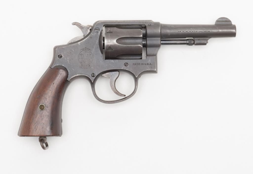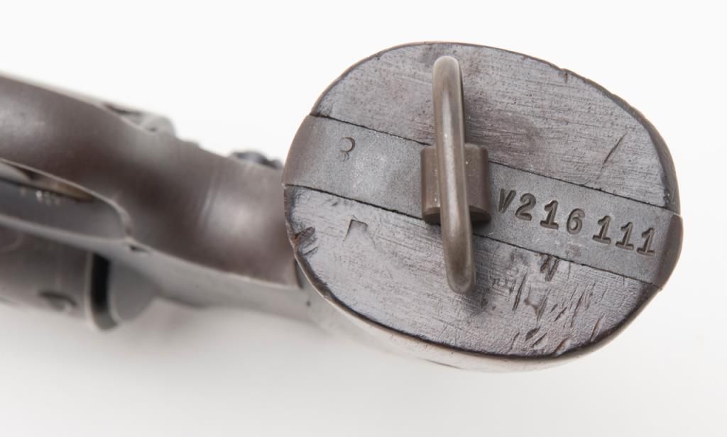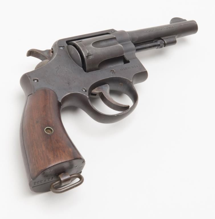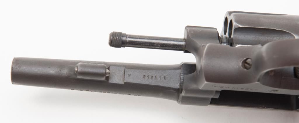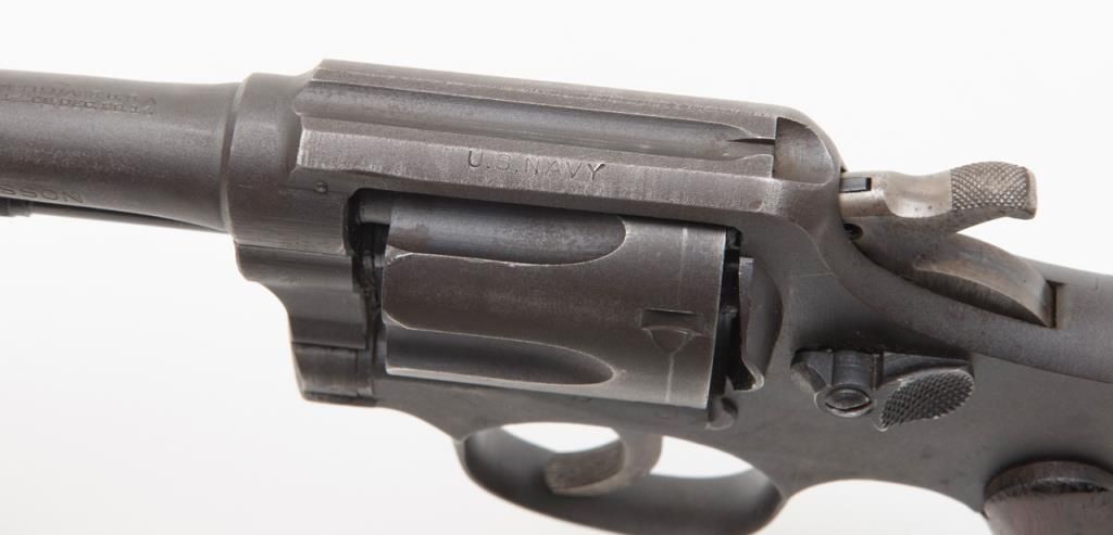 Smith and Wesson Victory Model U.S. Property Navy marked revolver, .38 Special caliber, Serial #65517. The pistol is in overall very good condition with a 4” barrel. The pistol is Navy marked, V216111. The pistol retains the majorityof its parkerized military finish with wear at the muzzle and considerable case colors evident on the hammer and trigger. The smooth wood grips are in overall very good condition with typical mars and compressions from service use and the lanyardring is present. The bore is very good, action crisp and markings sharp on this WWII era revolver. (C+R/PPT). Est.: $350-$700.