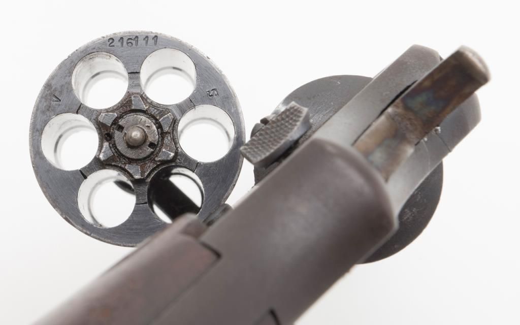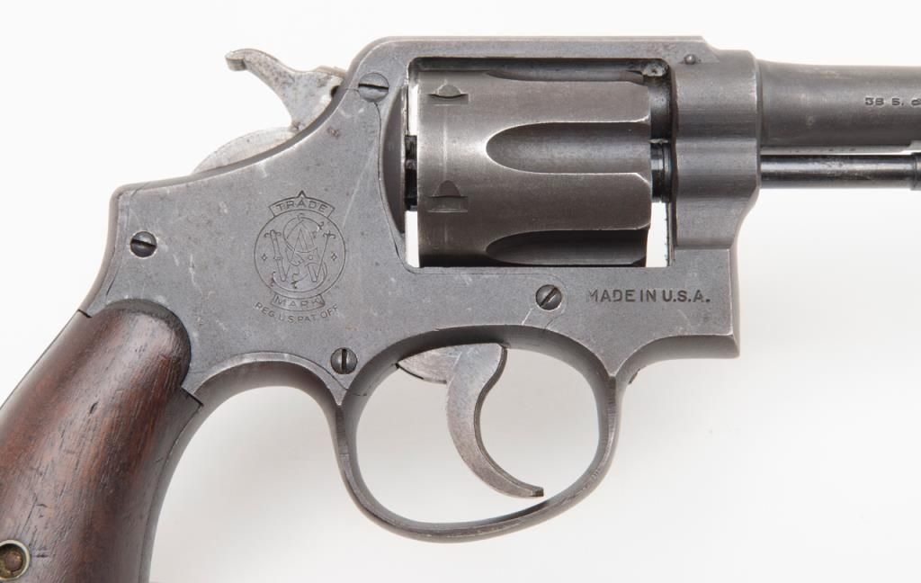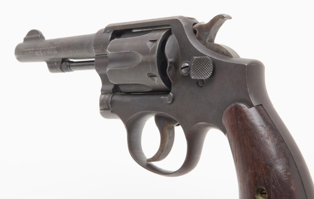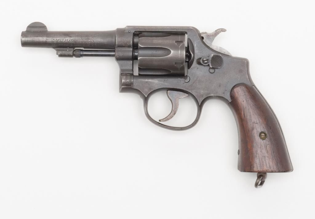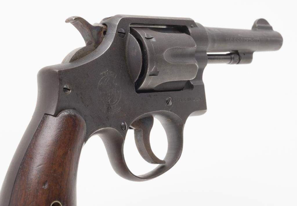 Smith and Wesson Victory Model U.S. Property Navy marked revolver, .38 Special caliber, Serial #65517. The pistol is in overall very good condition with a 4” barrel. The pistol is Navy marked, V216111. The pistol retains the majorityof its parkerized military finish with wear at the muzzle and considerable case colors evident on the hammer and trigger. The smooth wood grips are in overall very good condition with typical mars and compressions from service use and the lanyardring is present. The bore is very good, action crisp and markings sharp on this WWII era revolver. (C+R/PPT). Est.: $350-$700.