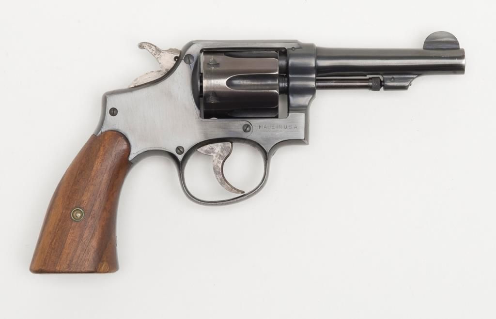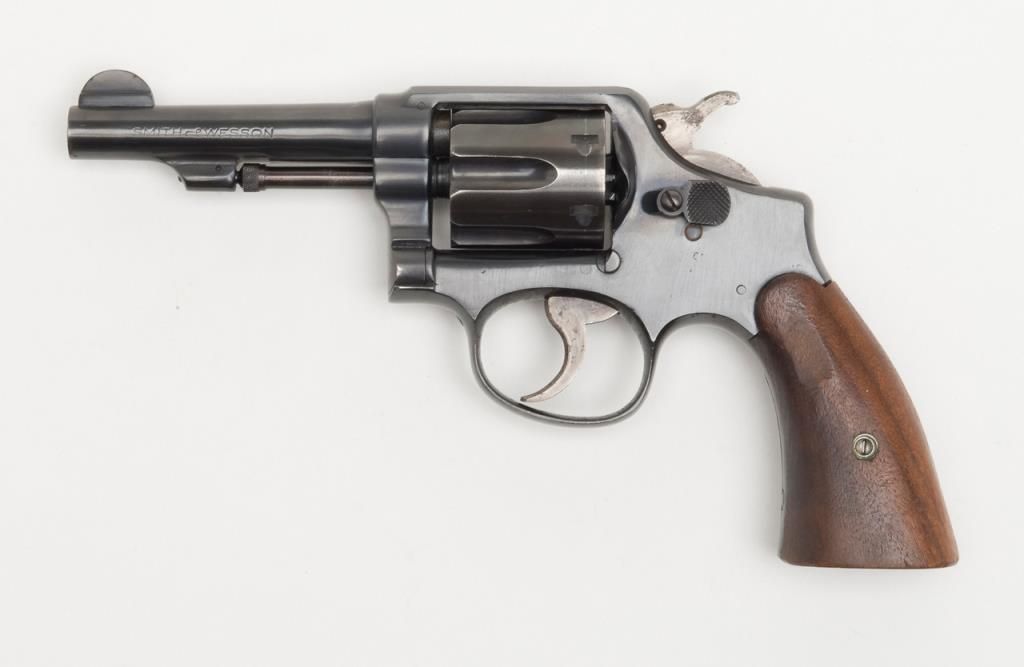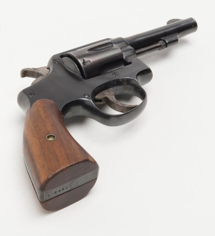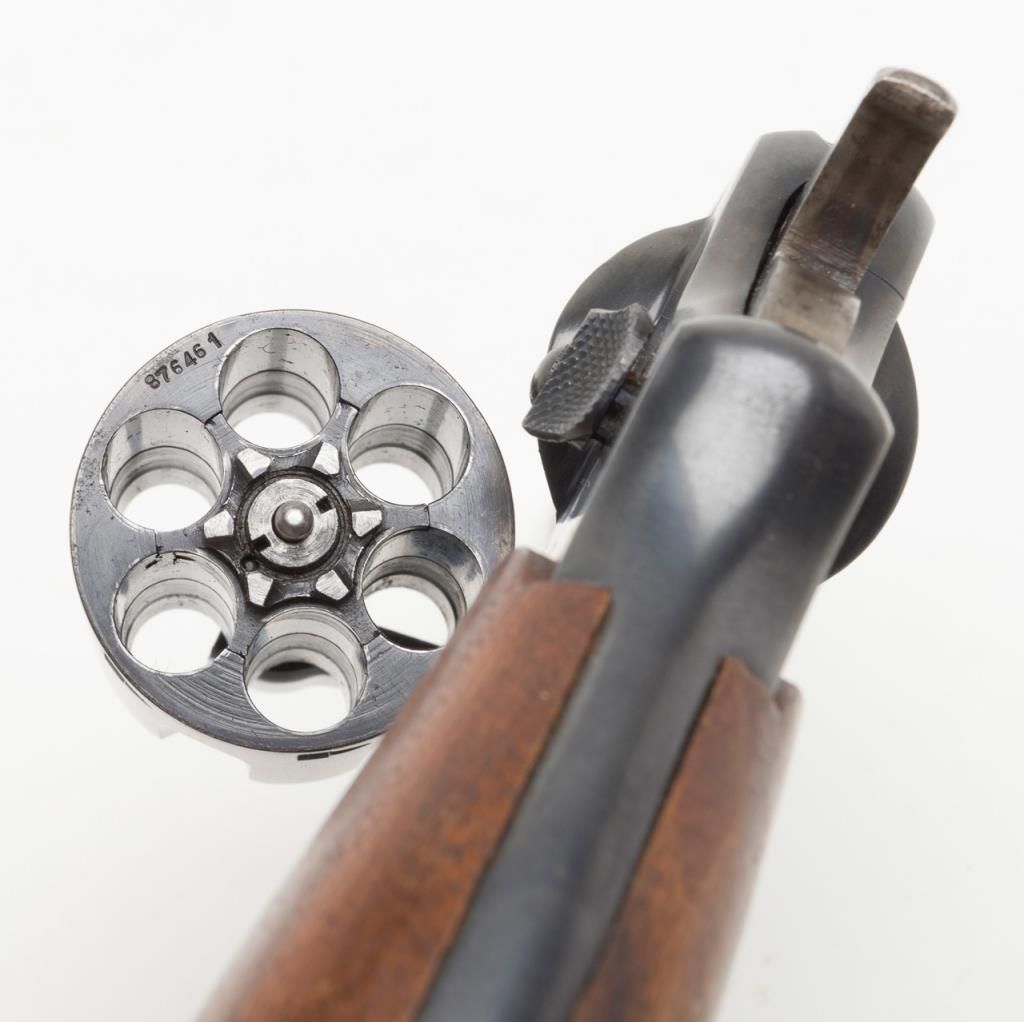 Smith and Wesson Victory Model revolver, cal. .38 Special, Serial #13956. The pistol is in overall very good condition as re-finished, with a 4” blued barrel. The pistol retains nearly all of an older, quality re-finish with slight wear at themuzzle. The smooth wood grips are in overall good condition showing small mars and compressions consistent with use. The action is crisp, bore very good and markings legible on this pistol. The gun comes with a nylon holster. (C+R/PPT).Est.: $250-$350