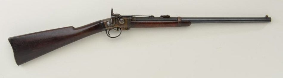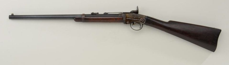 Smith percussion SRC, by Mass. Arms Co., address Poultney & Trimble, .50 cal., 21-1/2” barrel, blue and case hardened finish, wood stocks, #18621. This gun is in overall fine, uncleaned condition showing the majority ofits original blue finish on the barrel and likewise, the majority of its original case colors on the receiver, fine bore, crisp action and markings; very good to fine wood stocks with “G.P.” inspector’s initialsstamped on left wrist flat; a really superior example of this Civil War era weapon. Est.: $1,250-$2,500.