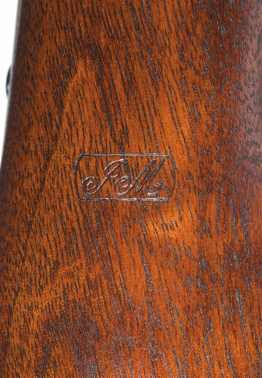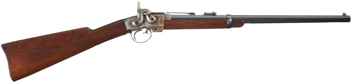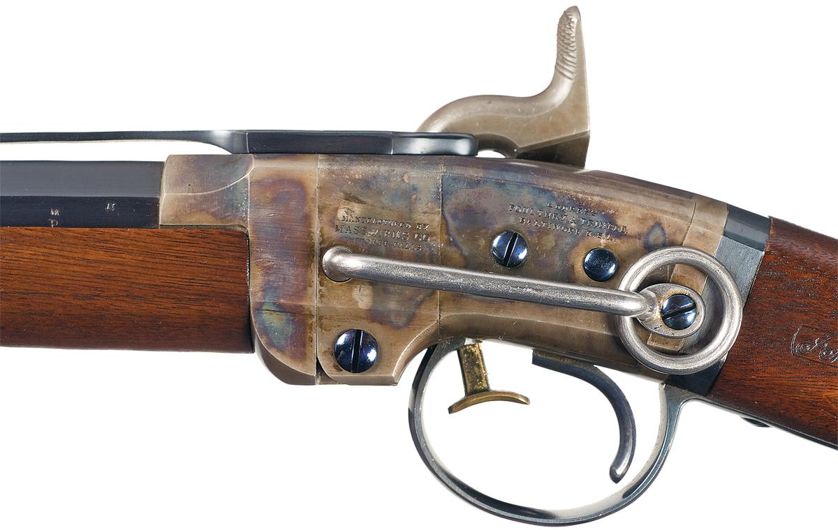 Designed by Gilbert Smith, the production of this breech loading percussion carbine was almost entirely consumed by government contracts, with limited numbers going to the civilian market. This carbine has the standard three sets of markings on the left side of the frame: "MANUFACTURED BY / MASS ARMS CO. / CHICOPEE FALLS", agent's names "ADDRESS / POULTNEY & TRIMBLE / BALTIMORE U.S.A." and "SMITH'S PATENT / JUNE 23, 1857". The left rear barrel flat is marked with a "M / P" and an "N". Dovetail brass blade front sight and folding leaf rear sight absent of yard markings. Breech loading action with barrel release latch inside the trigger guard. Blue barrel, trigger guard and buttplate, casehardened hammer and action, fire blue screws, with a saddle ring and bar mounted on the left side of the frame and mounted with a smooth forearm and straight grip walnut stock with a steel buttplate. The left side wrist area of the stock is marked with two boxed "JM" cartouches.