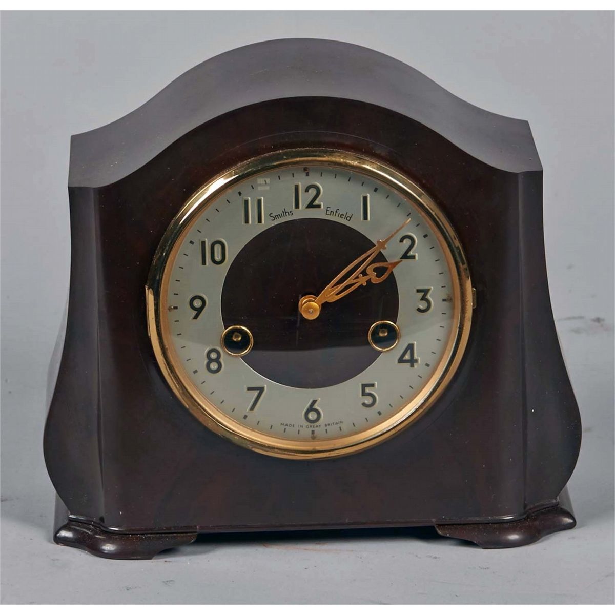 Pendulum clock made in Great Britain by the Enfield Clock Co. Ltd., Curved top bakelite plastic case w/ glass cover Condition Excellent Size 8" x 7" x 5"