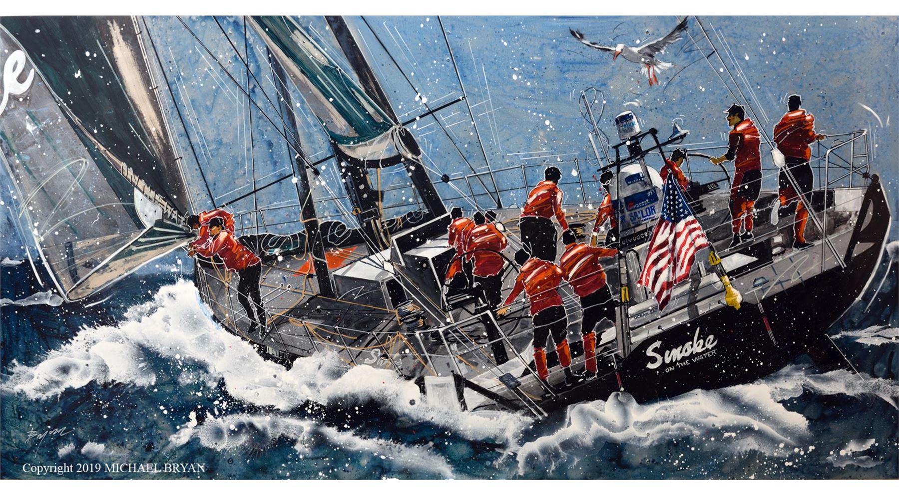 Michael Bryan's love for the Ocean and sailboats is captured in this dynamic racing image of the "Smoke on the Water " and its crew battling weather and the competition