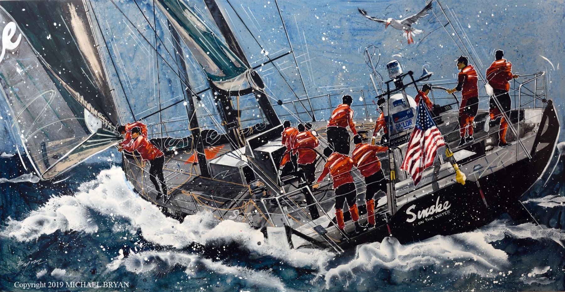 Michael Bryan's love for the Ocean and sailboats is captured in this dynamic racing image of the "Smoke on the Water " and its crew battling weather and the competition