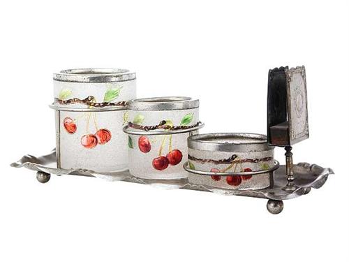 Metal tray with matchbox and three bowls. Blown and etched tintless glass with coloured enamel painting and gilt depicting cherry branches. The handles are missing. Circa 1900 Length: 29.5 cm