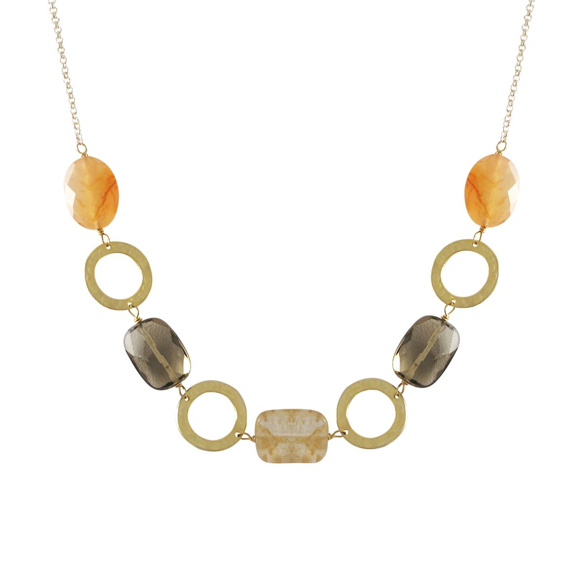 Smokey And Carnelian Combination Semi Precious Stones With Open Rings On Gold Plated Brass Chain Necklace, 18" 2"