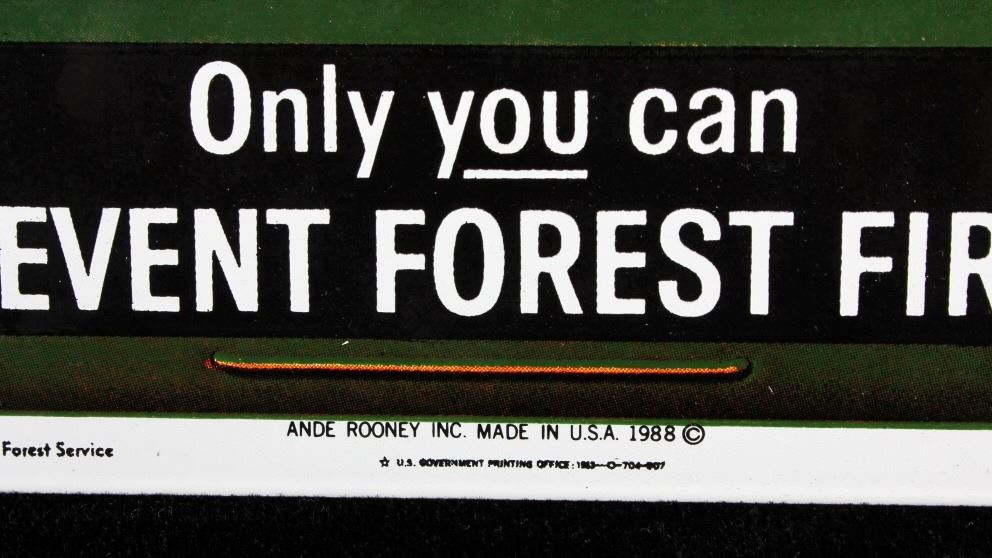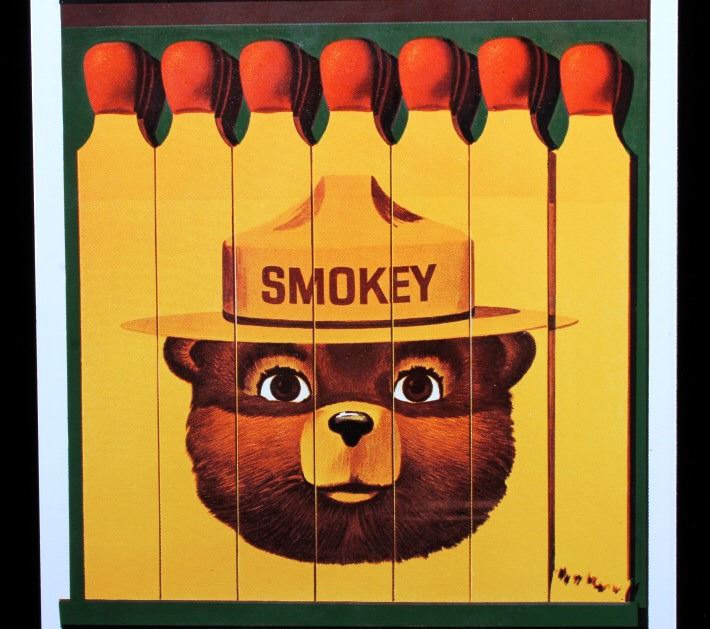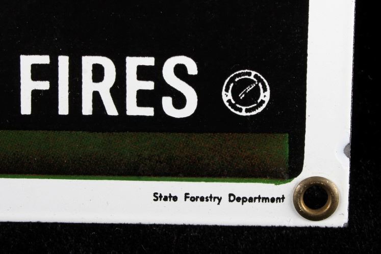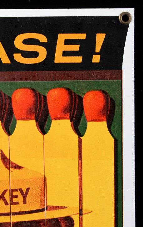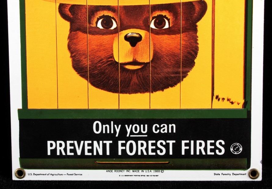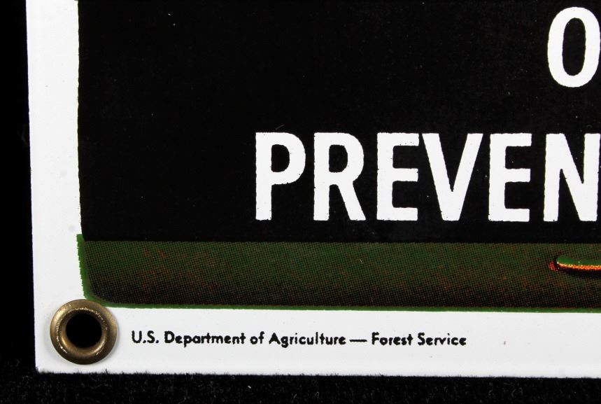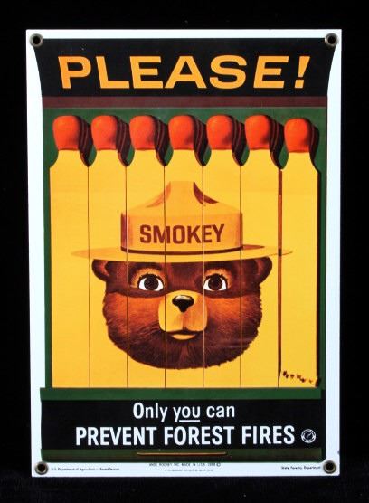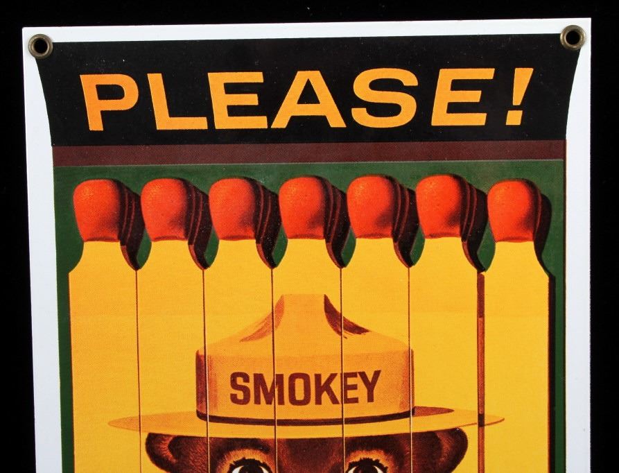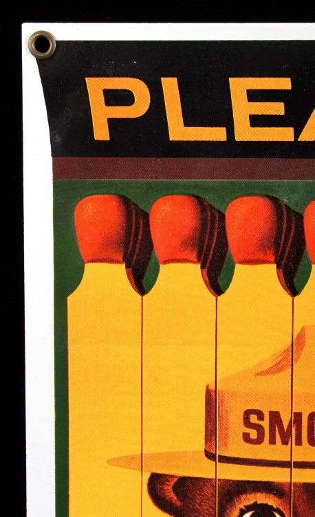 This is a Smokey Bear porcelain enamel sign. Smokey Bear was adopted by the U.S. Forest Service back in the 1940's as part of their campaign to prevent forest fires. This sign shows a book of matches with Smokey's face. The sign is in very good condition. It measures 11" x 7.75".