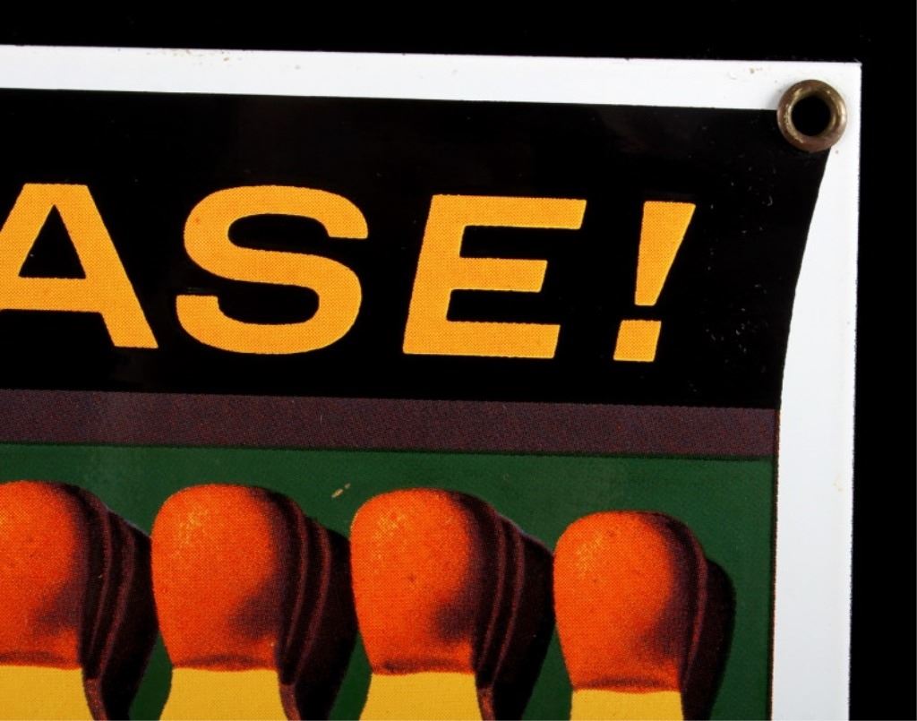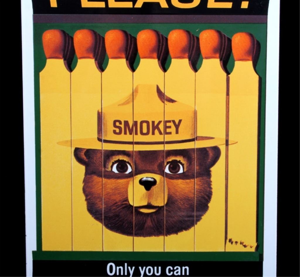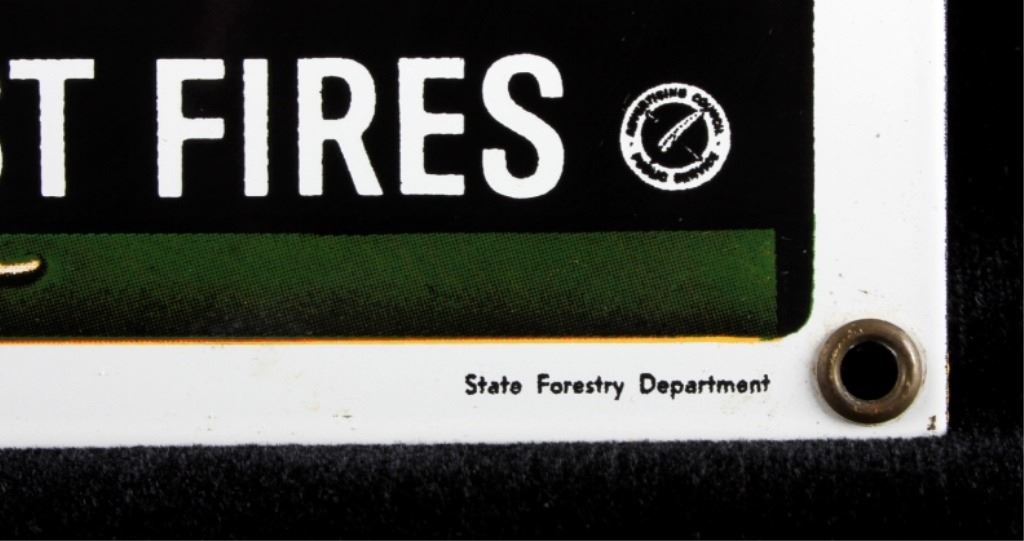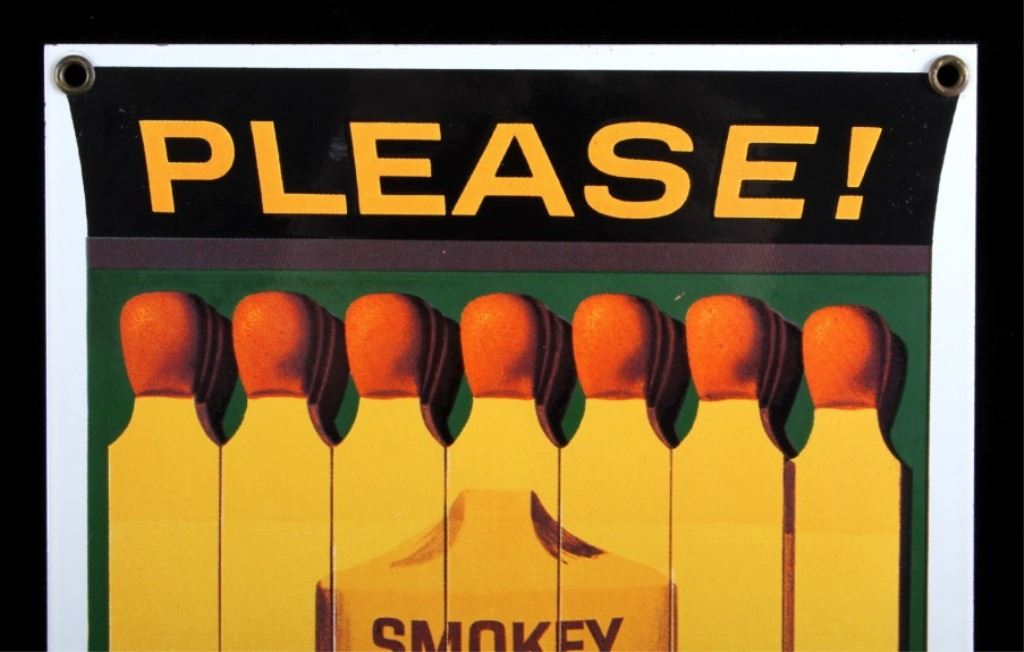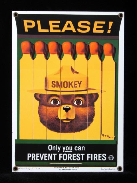 This is a Smokey Bear porcelain enamel sign. Smokey Bear was adopted by the U.S. Forest Service back in the 1940's as part of their campaign to prevent forest fires. This sign shows a book of matches with Smokey's face. The sign is in good condition. It measures 11" x 7.75".