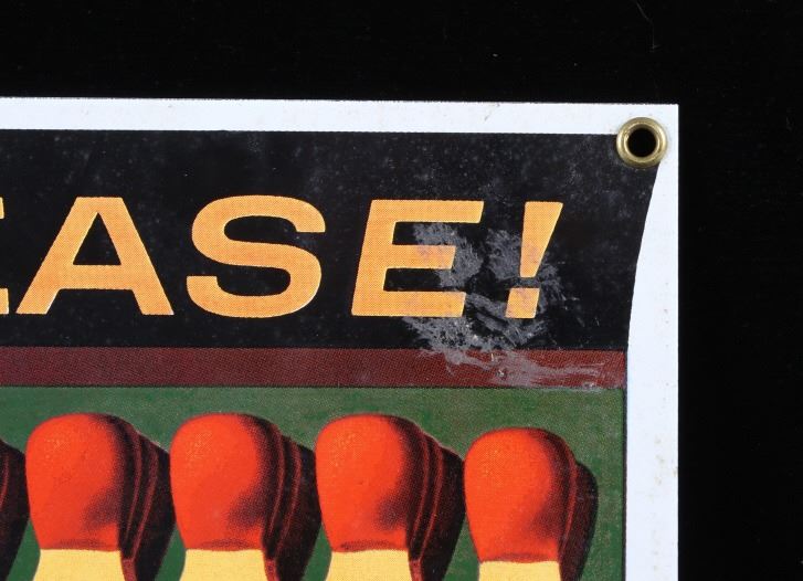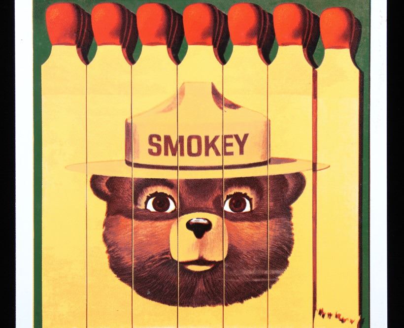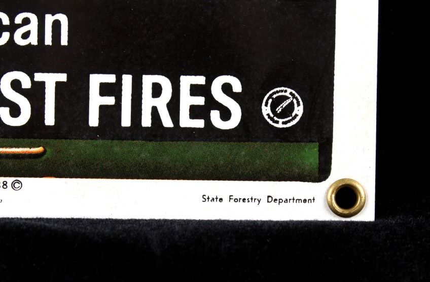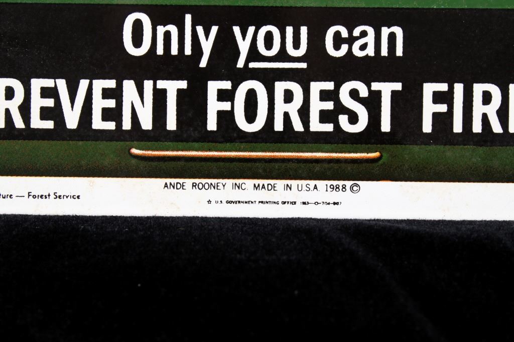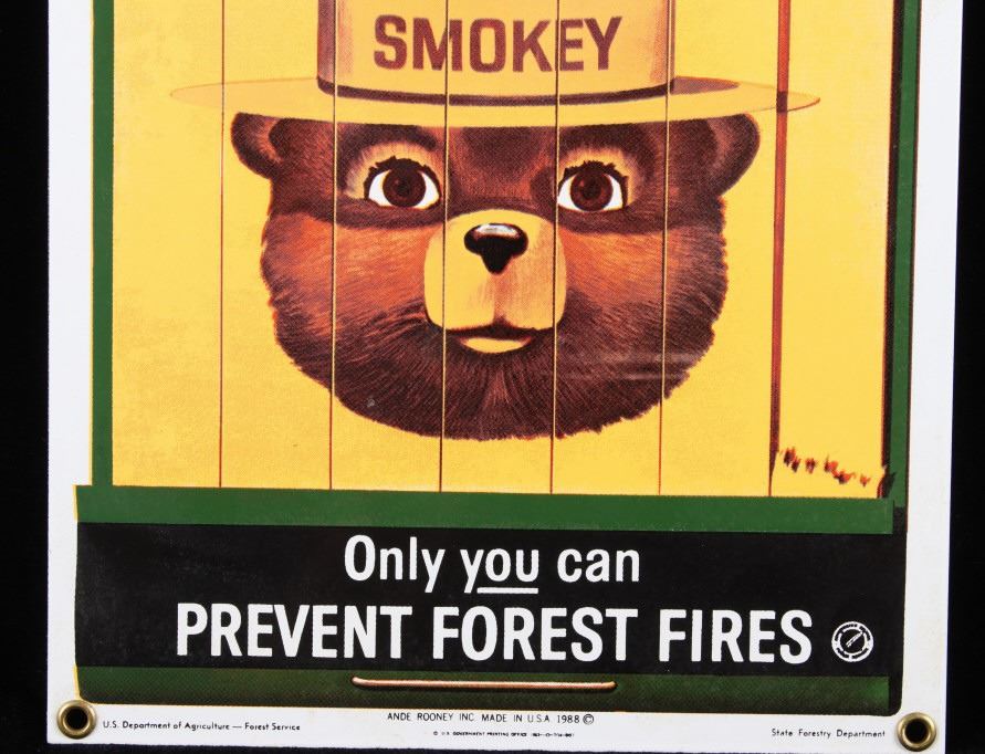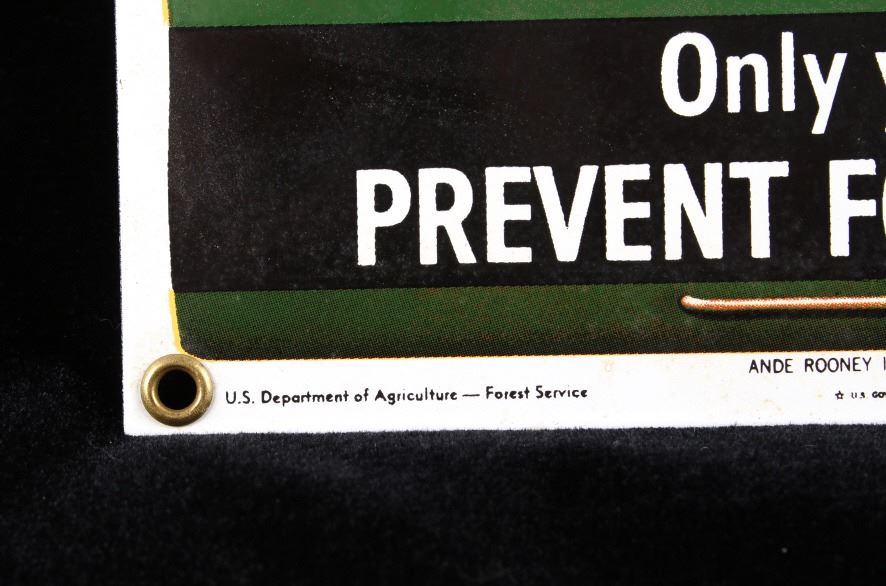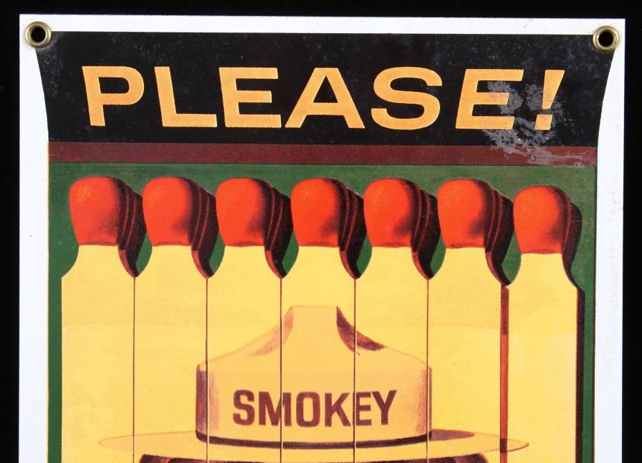 This is a Smokey Bear porcelain enamel sign. Smokey Bear was adopted by the U.S. Forest Service back in the 1940's as part of their campaign to prevent forest fires. This sign shows a book of matches with Smokey's face. The sign is in good condition. It measures 11" x 7.75".