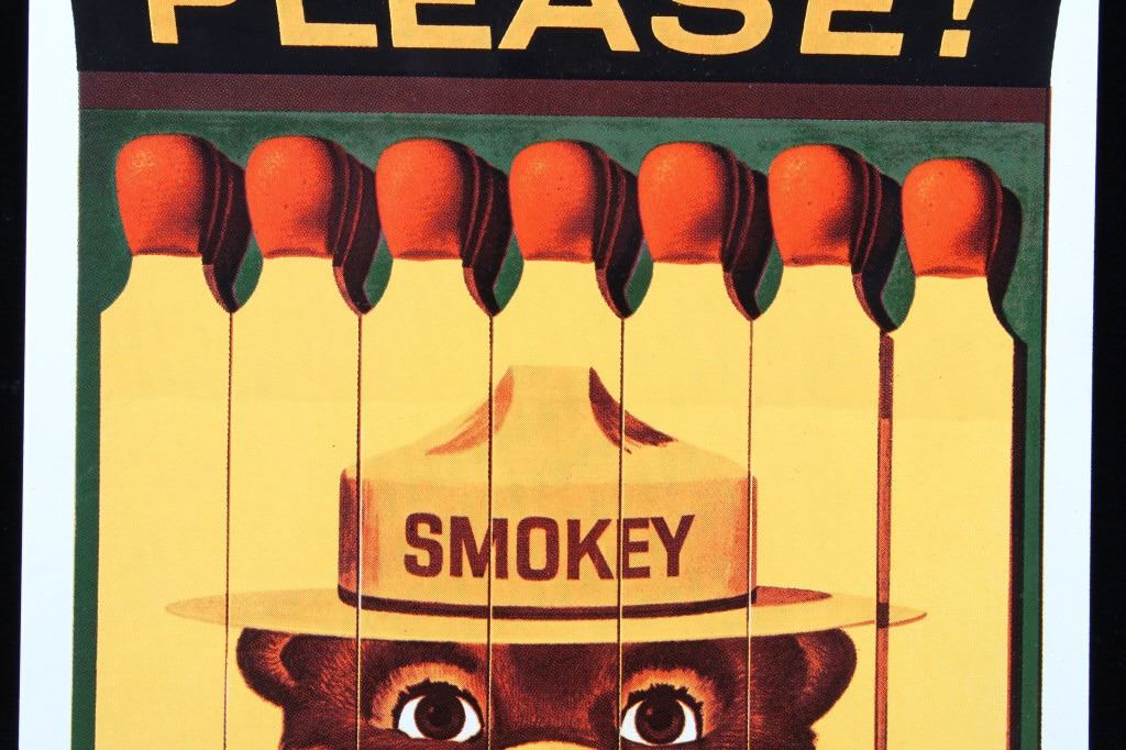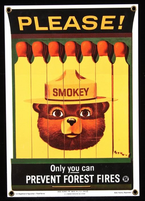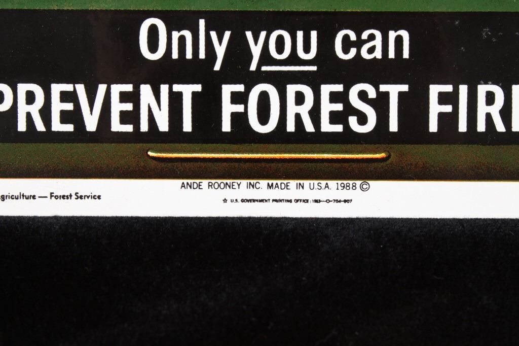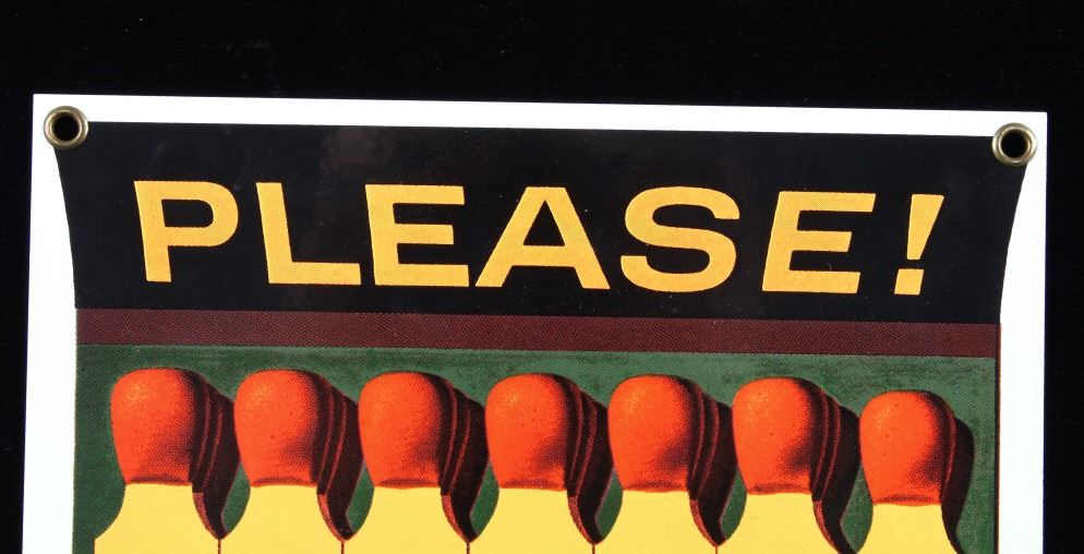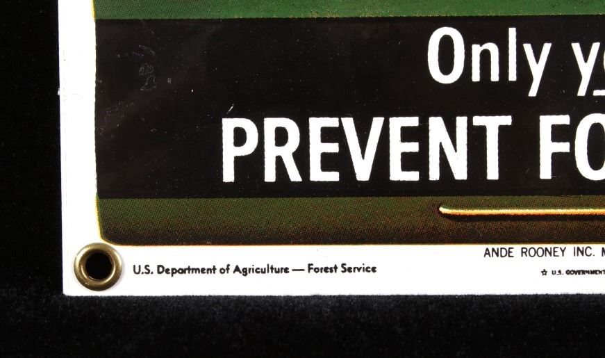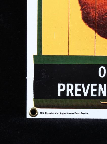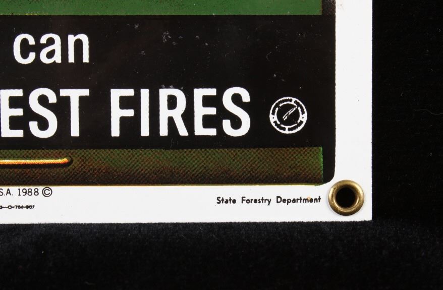 Included in this lot is a Smokey Bear porcelain enamel sign. Smokey Bear was adopted by the U.S. Forest Service back in the 1940's as part of their campaign to prevent forest fires. This sign shows a match book with Smokey's face in the forefront. The sign is in good condition. The porcelain sign measures 11" x 7 ¾”.
