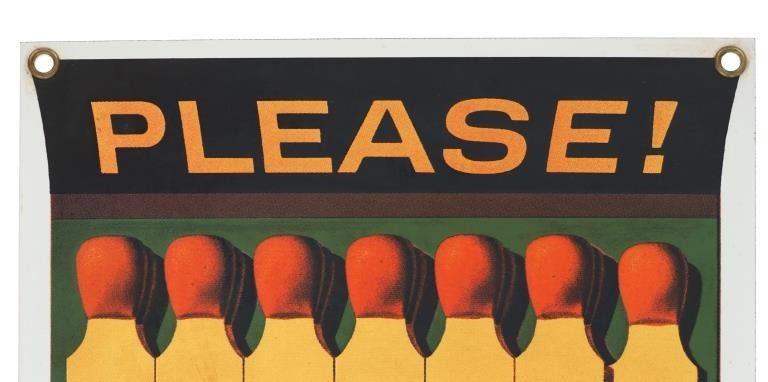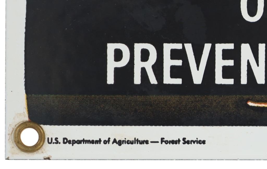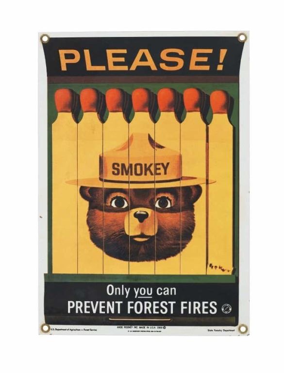 This is a Smokey Bear porcelain enamel sign. Smokey Bear was adopted by the U.S. Forest Service back in the 1940's as part of their campaign to prevent forest fires. The sign reads as follows: Please! Only you can Prevent Forest Fires - U.S. Department of Agriculture ~ Forest Service - Andre Rooney Inc. Made in U.S.A. 1988 - State Forestry Department - U.SA. Government Printing Office: 1963-O-704-907 - Sate Forestry Department. This sign shows a book of matches with Smokey's face. The sign is in very good condition. It measures 11" x 7.75".